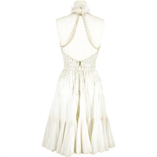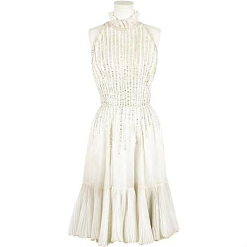<B>Mitzi Gaynor Screen-Worn Bob Mackie Dress.</B></I> A white sequined backless dress, worn by Mitzi Gaynor in one of her television specials in the '70s. The Bob Mackie creation includes layers of chiffon at the base and alternating stripes of white sequins and glimmering rhinestones. Mackie won two Emmy awards for his work on Gaynor's television specials and was nominated 26 times for his work over the years with everyone from Cher to Diana Ross. The dress is in Excellent condition.<BR><BR><b>Shipping:</b> Clothing, Costumes & Jerseys (<a target="_blank" href="http://www.heritageauctions.com/common/shipping.php">view shipping information</a>)