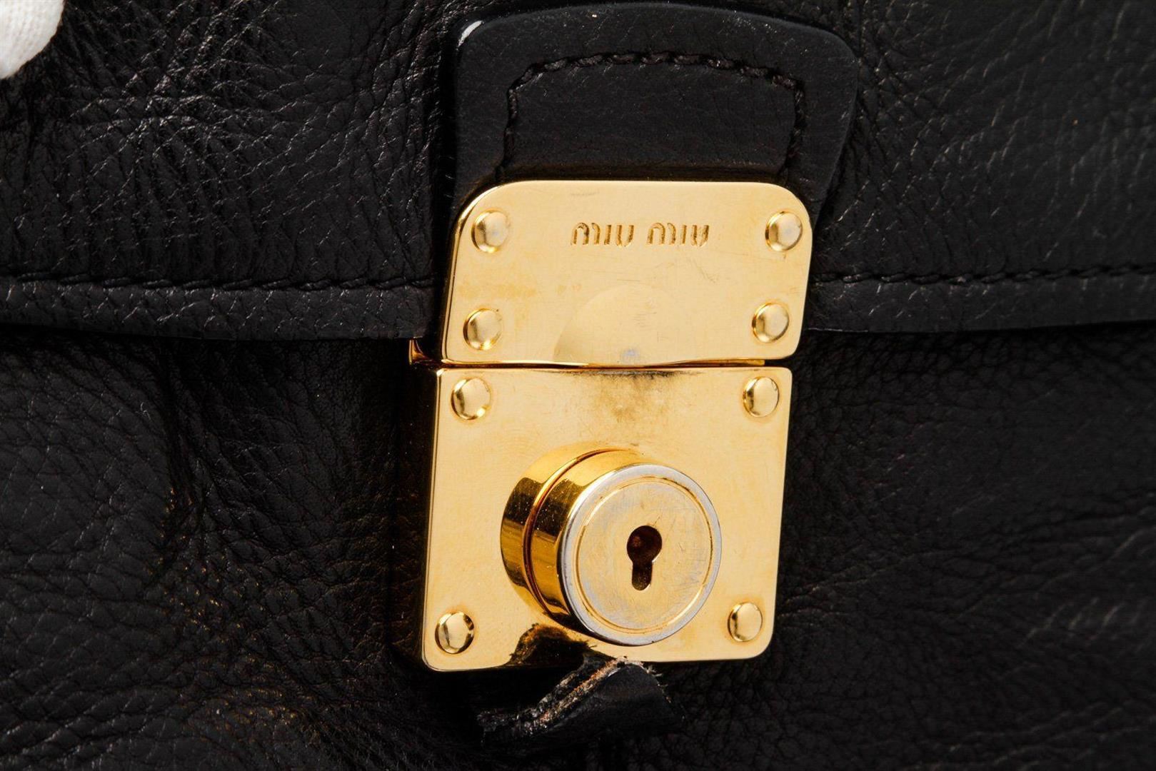Overall flap over zip top closure, dual rolled handles, and gold tone hardware. Interior is black fabric lined with one zip pocket. Measurements: Length: 14.5 in / 37 cm Width: 5 in / 13 cm 14 in / 36 cmGood overall, please see photographs for detail.