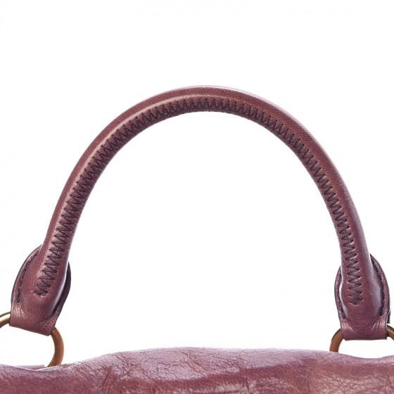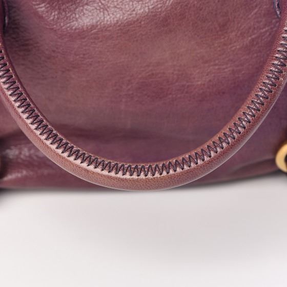 This tote is crafted of purple calfskin leather and features rolled leather top handles, an optional shoulder strap, brass hardware, and decorative leather bows on the sides. The top unzips to a dark brown satin fabric interior with a patch pocket.