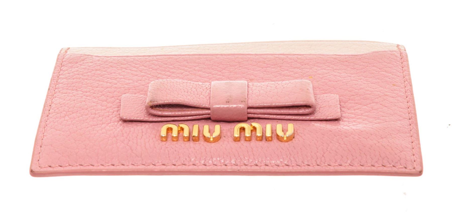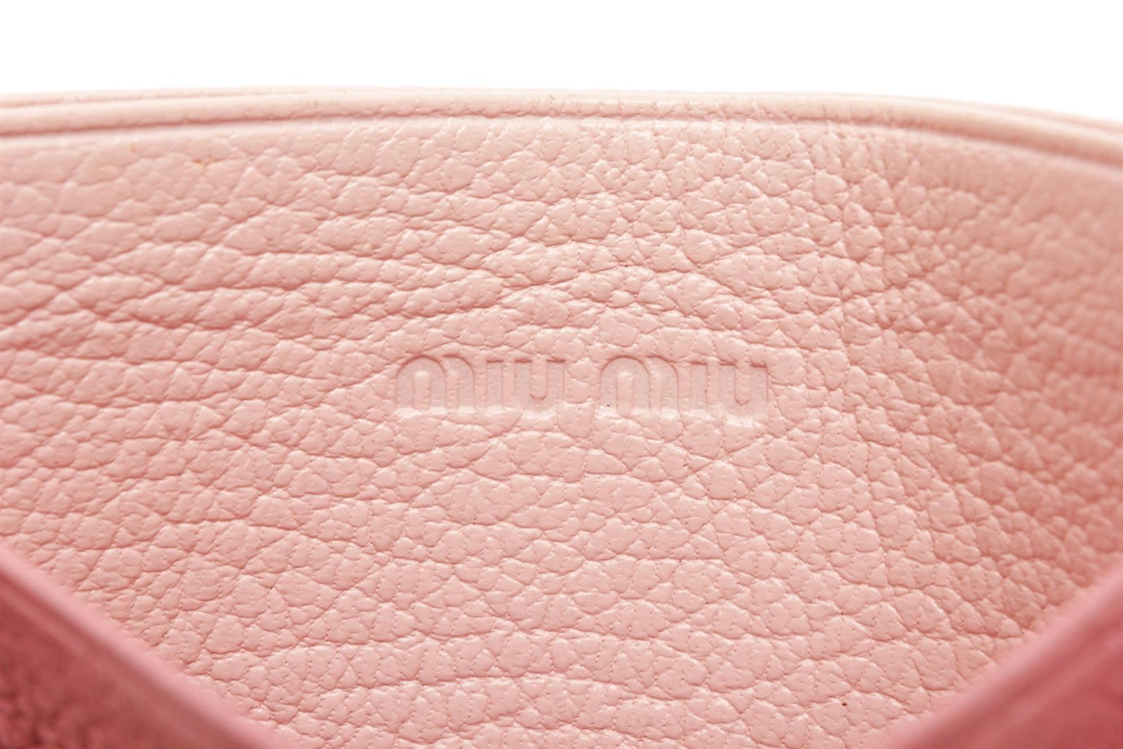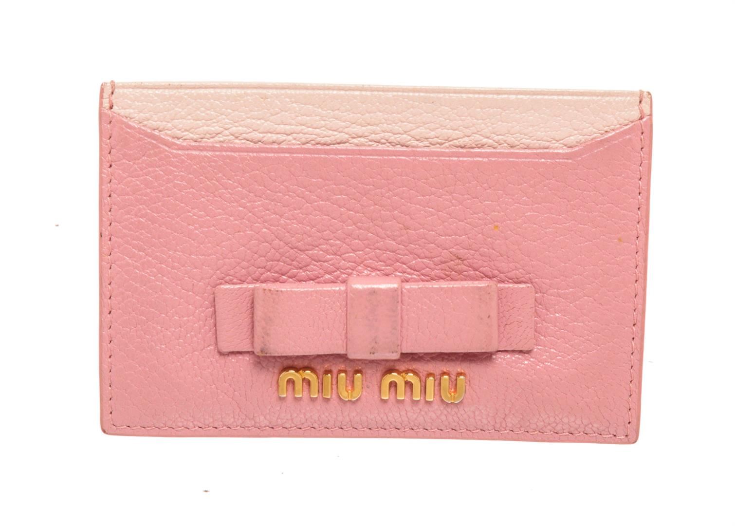 Miu Miu Pink Card Case Wallet with gold-tone hardware, trim leather and snap closure.
