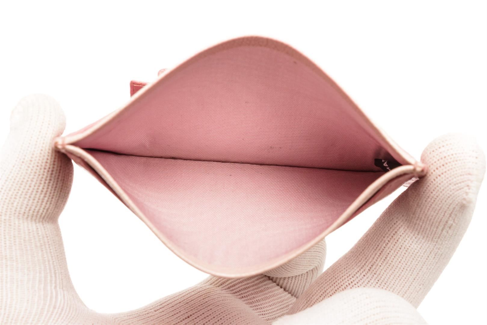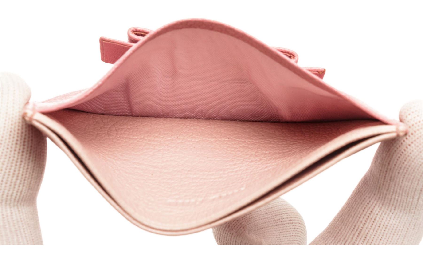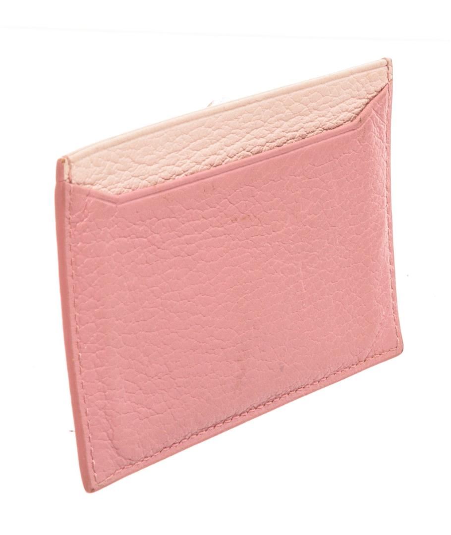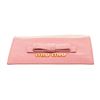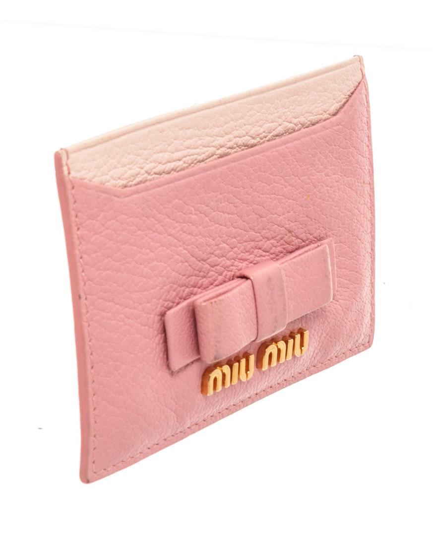 Miu Miu Pink Card Case Wallet with gold-tone hardware, trim leather and snap closure.
