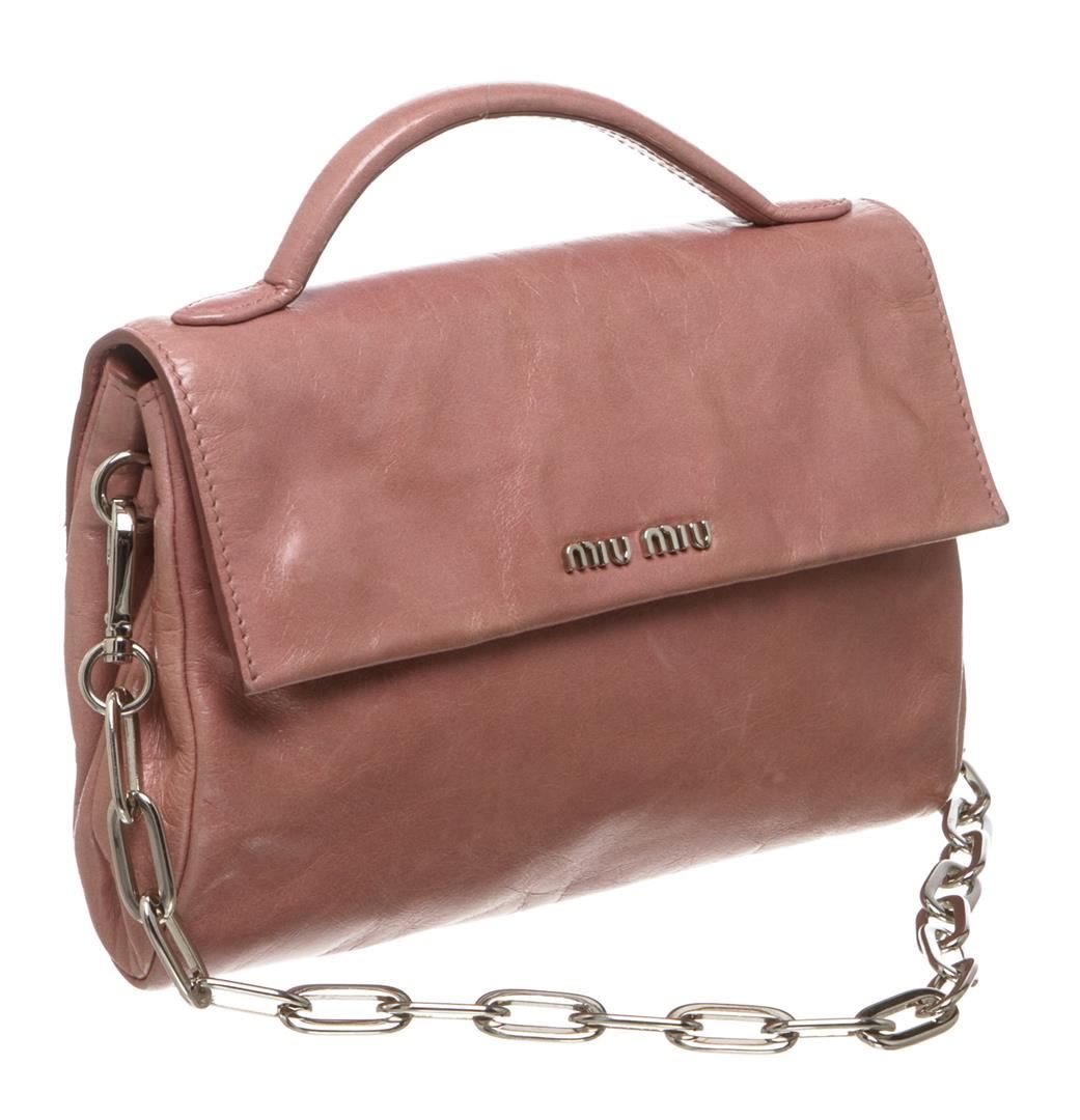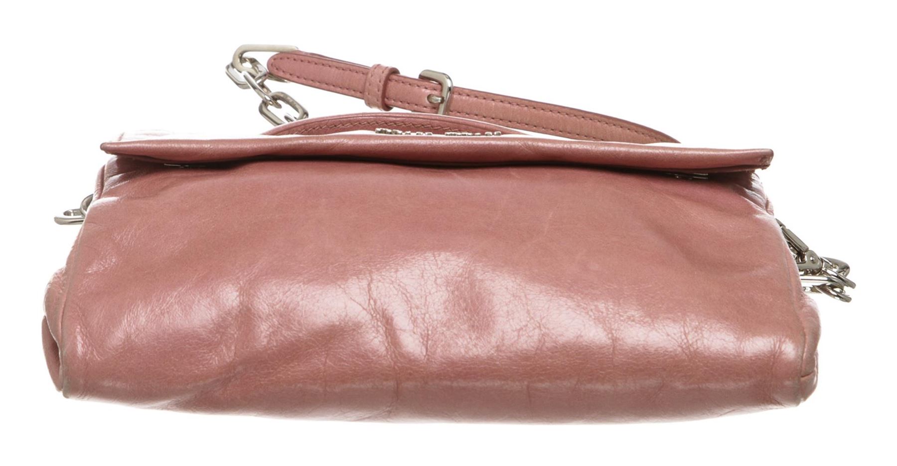 One Miu Miu Pink Leather Small Crossbody Handbag. Overall flap magnetic button closure, single flat handle, and silver-tone hardware. Interior is fabric lined and contains zipper pocket.