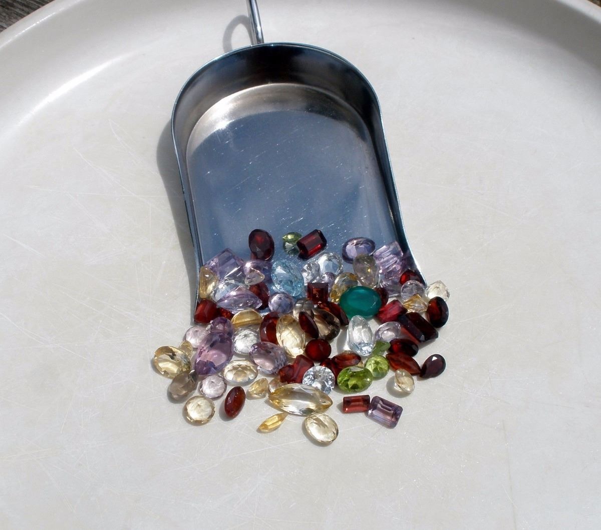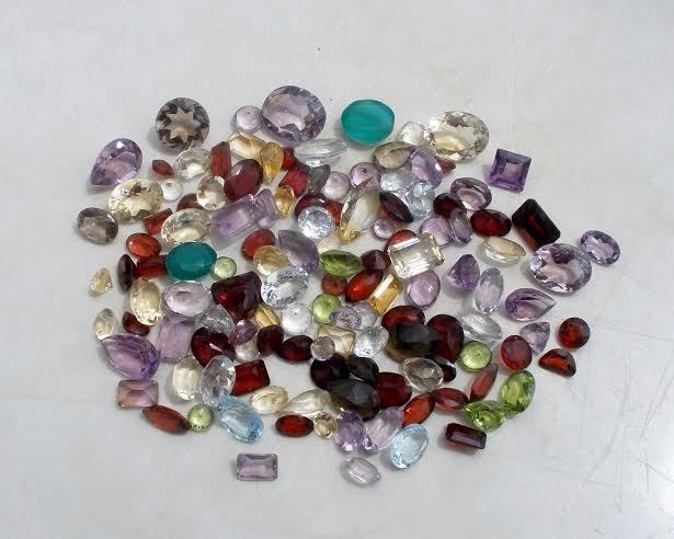 Mix Gems..... amethyst, citrine, garnet, carnelian, green agate, peridot, yellow quartz, smoky quartz, white topaz, and sky blue topaz. Size range of gems in this mix is 3mm to as large as 14mm. 25 carats will be random scoop from this lot. We have 10 thousand Carats mix lot available. if you are looking for more quantity then please contact me.