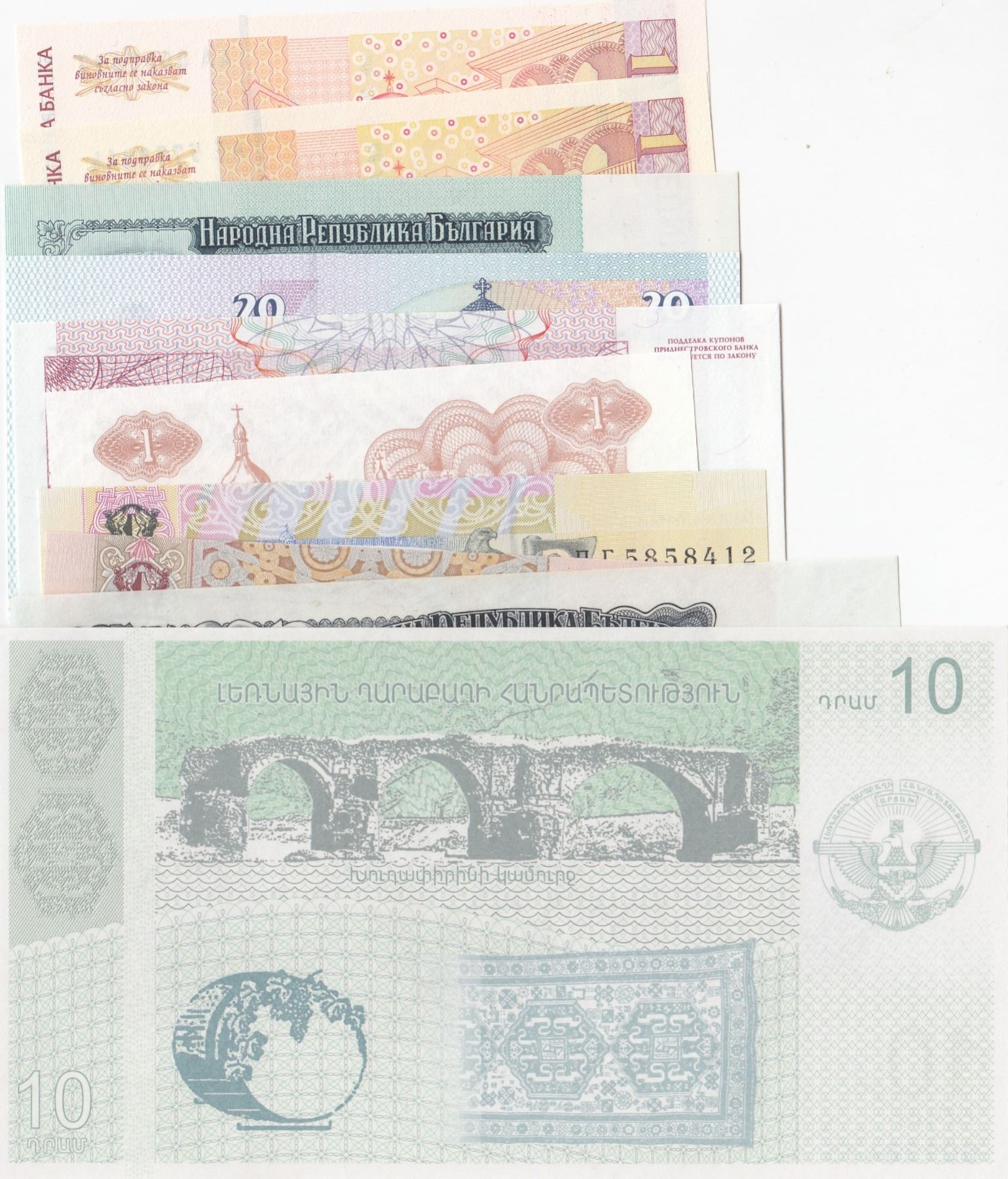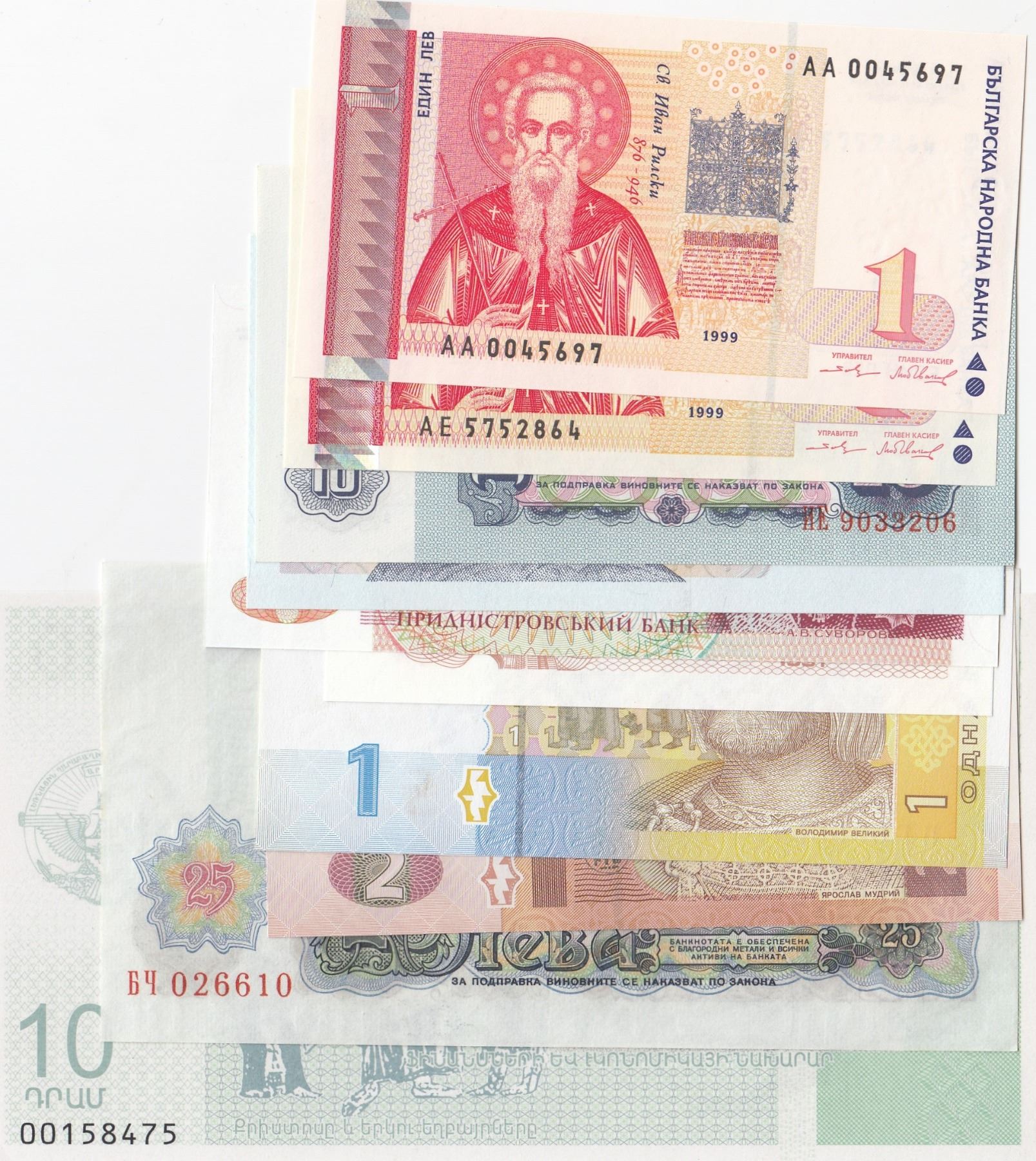 Mix Lot, 10 banknotes in whole UNC conditionbr/Bulgaria, 1 Lev (2), Bulgaria, 10 Leva, Bulgaria, 20 Leva, Bulgaria, 25 Leva, Ukraine, 1 Hrivni, Ukraine, 2 Hrivni,