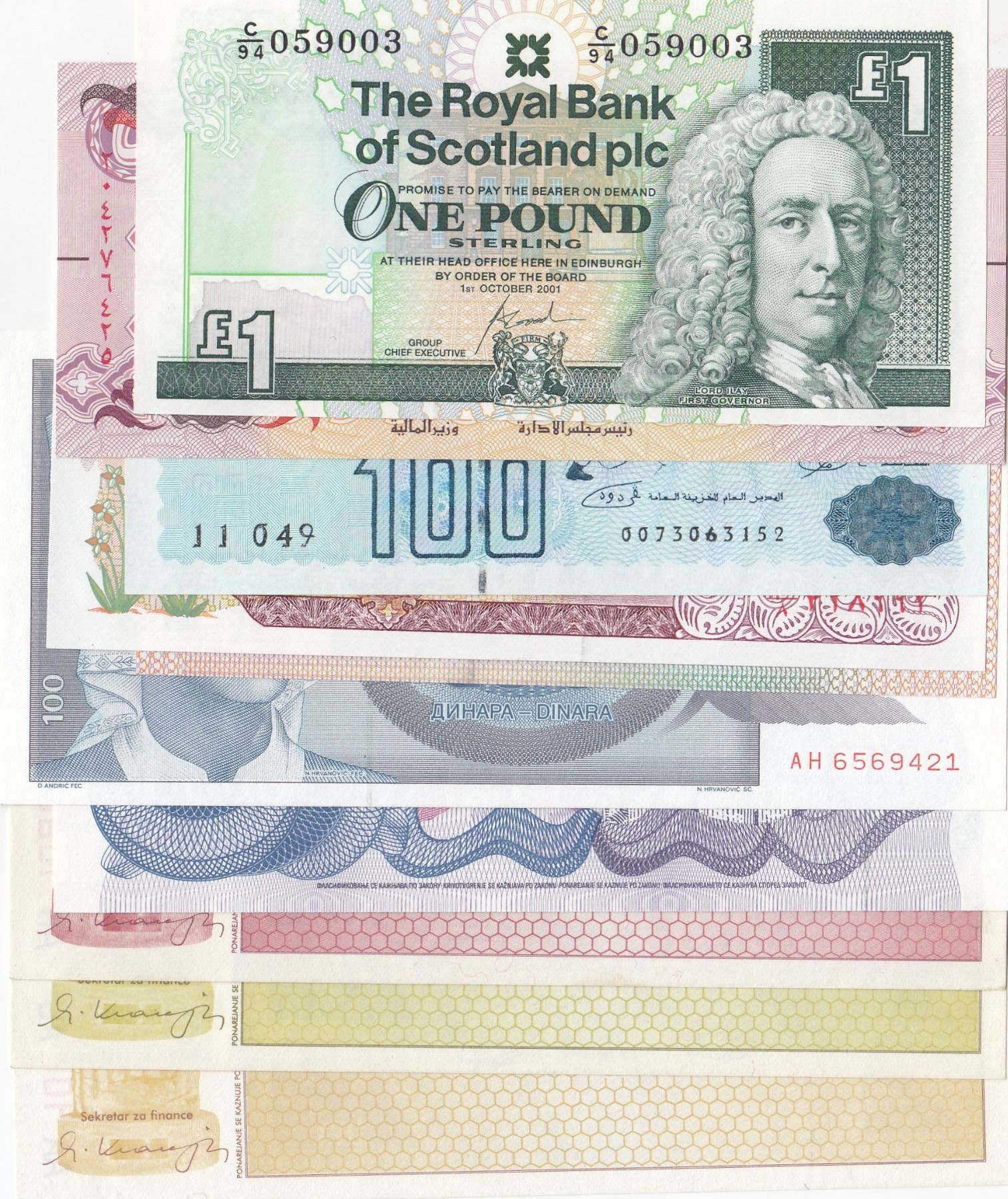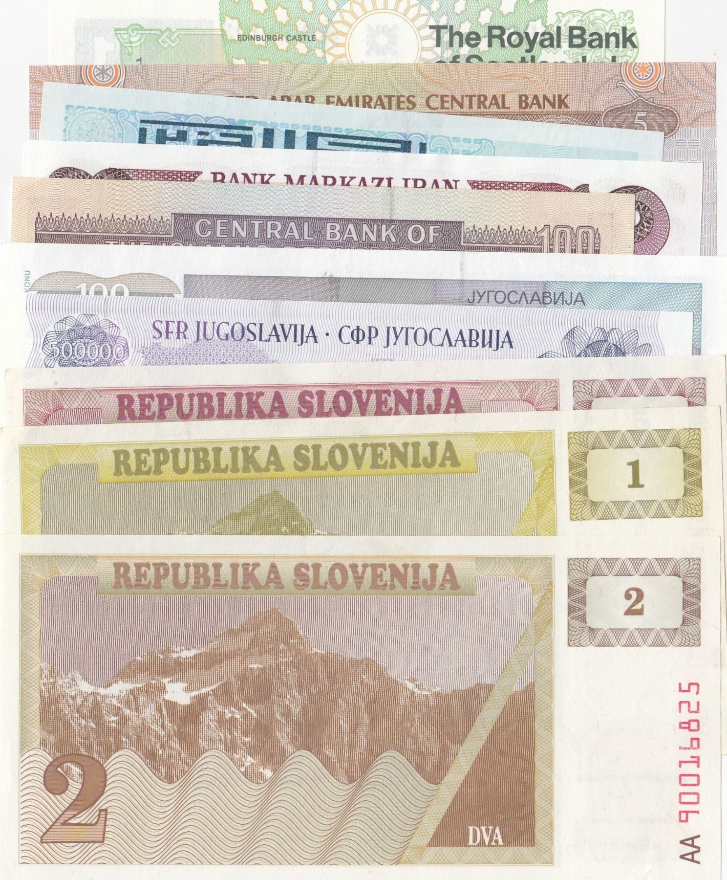 Mix Lot, 10 different banknotes, all in UNC conditionbr/Slovenia, 1 Tolar, 1990; Slovenia, 2 Tolarjev, 1990; Slovenia, 5 Tolarjev, 1990; Yugoslavia, 500.000 Dinara, 1989;