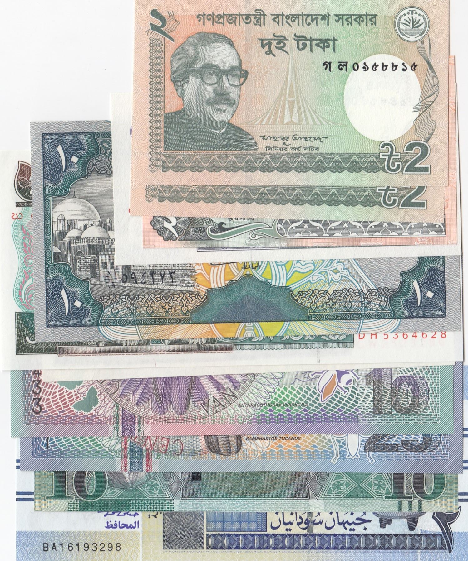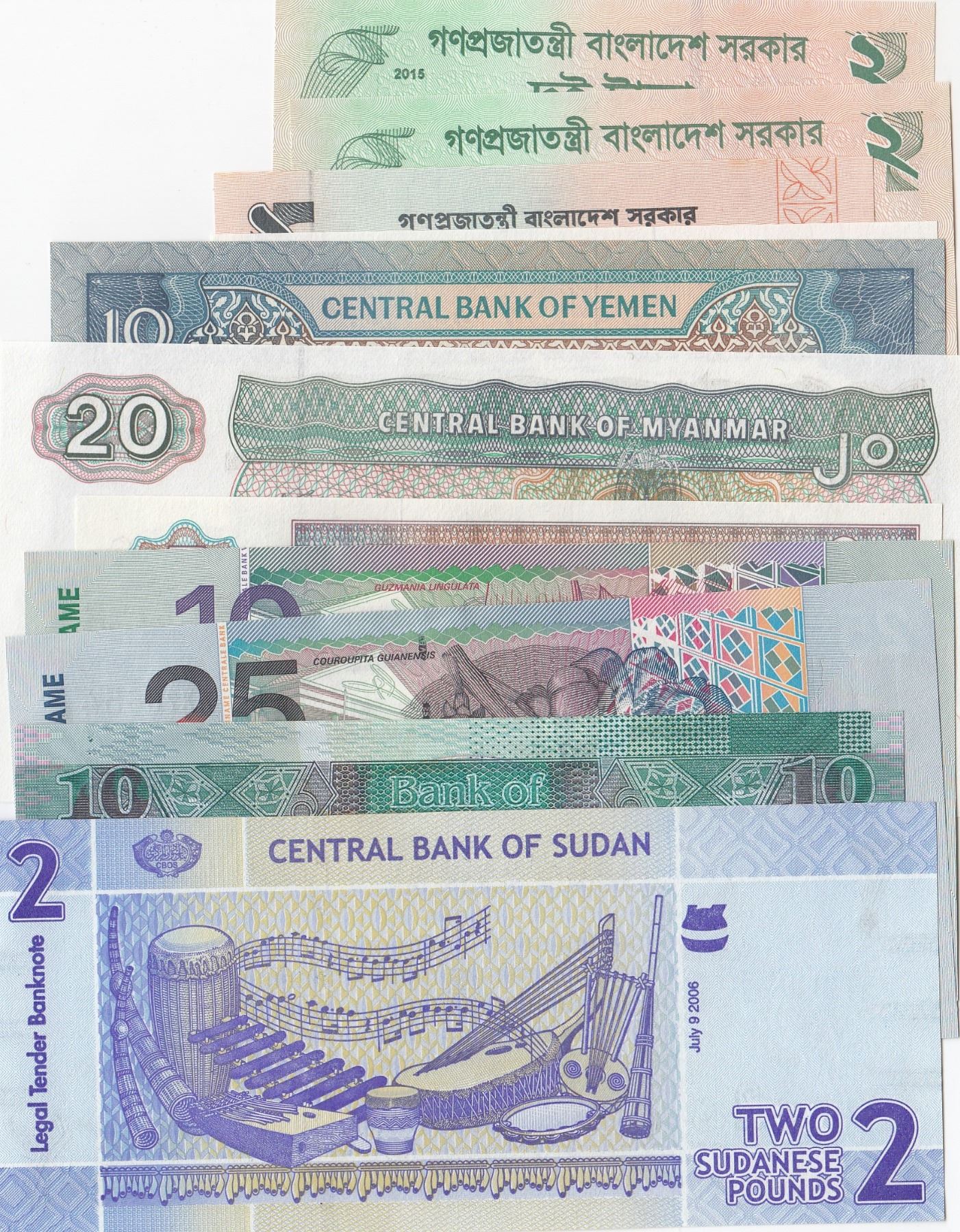 Mix Lot, 11 banknotes in whole UNC conditionbr/Sudan, 2 Pounds, Sudan, 10 Pounds, Suriname, 10 Gulden, Suriname, 25 Gulden, Myanmar, 1 Kyat,