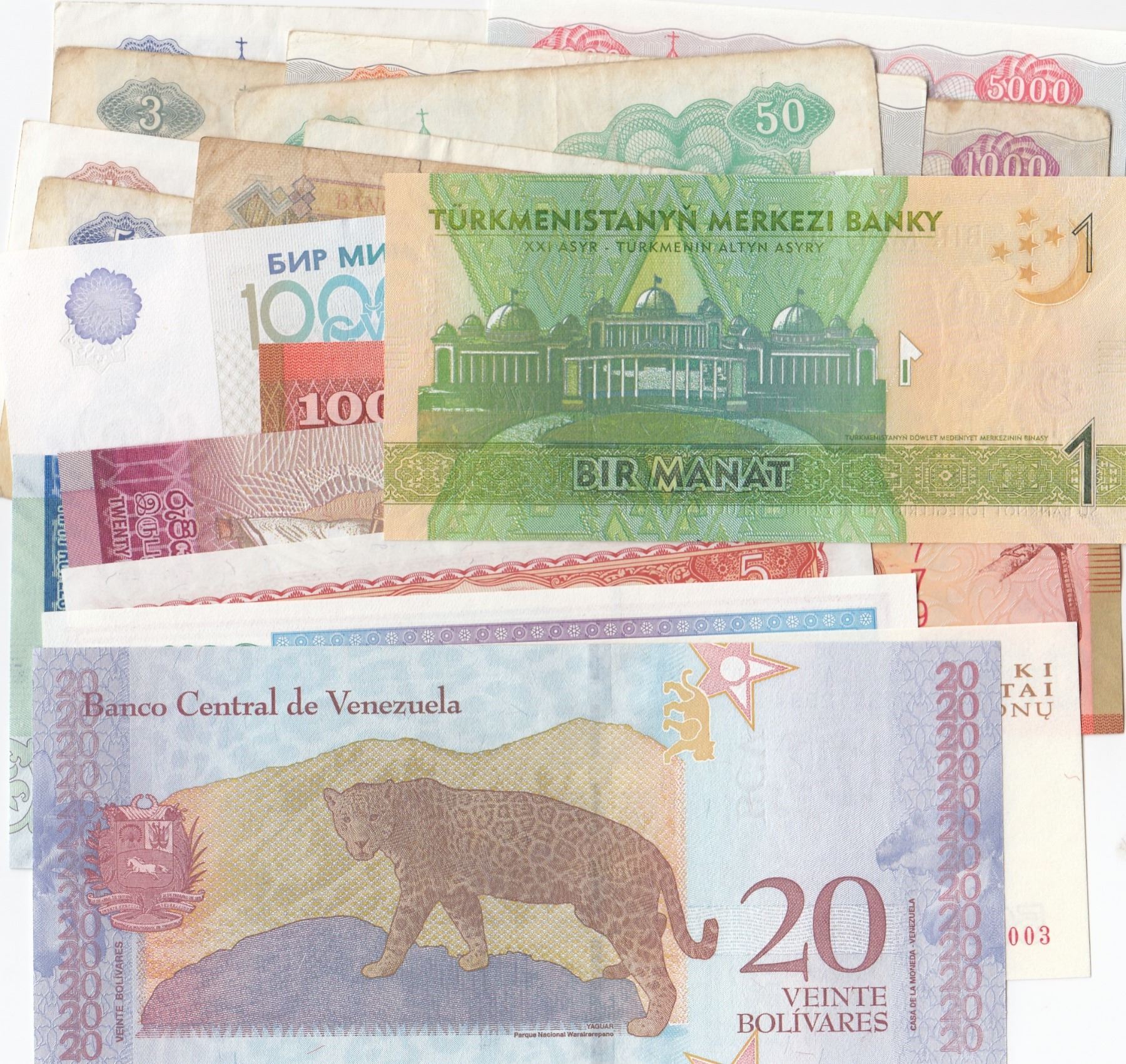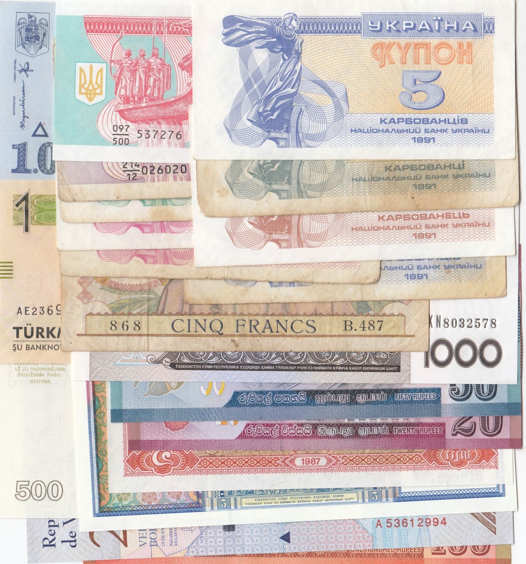 Mix Lot, 21 different banknotes between FINE and UNC conditionbr/French Indo-China, 5 Francs, 1934, Fine; Romania, 1.000 Lei, 1998, Unc; Uzbekistan, 5 Som, 1994, Unc; Cambodia, 5 Riels, 1987, Unc; Uzbekistan, 1.000 Som, 2001, Unc; Turkmenistan, 1 Manat, 2014, Aunc; Litvanyia, 500 Talonu, 1993, Unc; Venezuela, 20 Bolivares, 2018, Unc; Sri Lanka, 20 Rupees, 2010, Aunc; Sri Lanka, 50 Rupees, 2016, Aunc; Sri Lanka, 100 Rupees, 2010, Unc; Ukraine, 1-3-5-5-10-10-50-100-1.000 and 5.000 Karbovantsi, 1991, vf/Unc