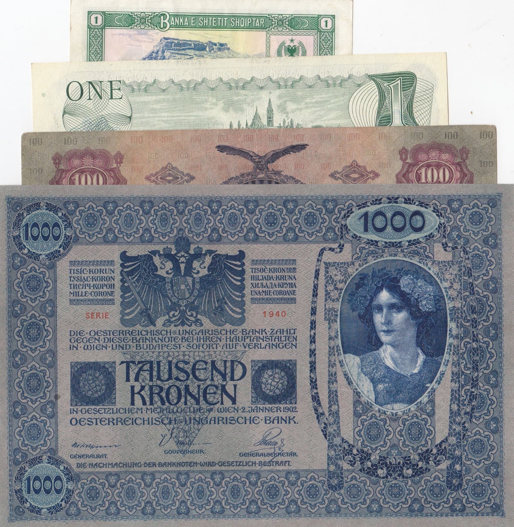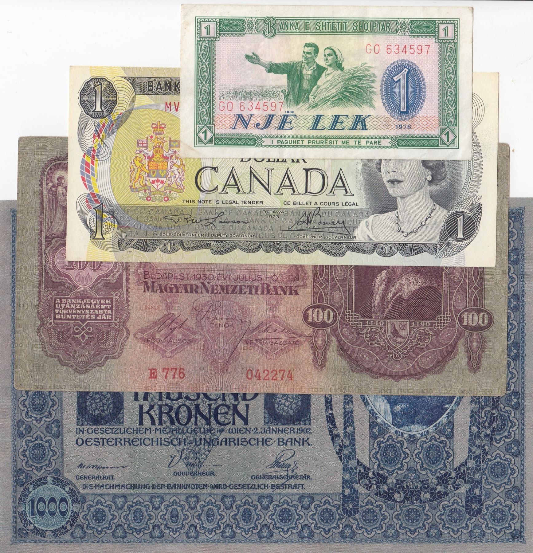 Mix Lot, 4 banknotes from different countriesbr/Albania, 1 Lek, 1976, xf; Canada, 1 Dollar, 1973, Unc; Hungary, 100 Pengö, 1930, vf; Austria, 1.000 Kronen, 1902, Unc