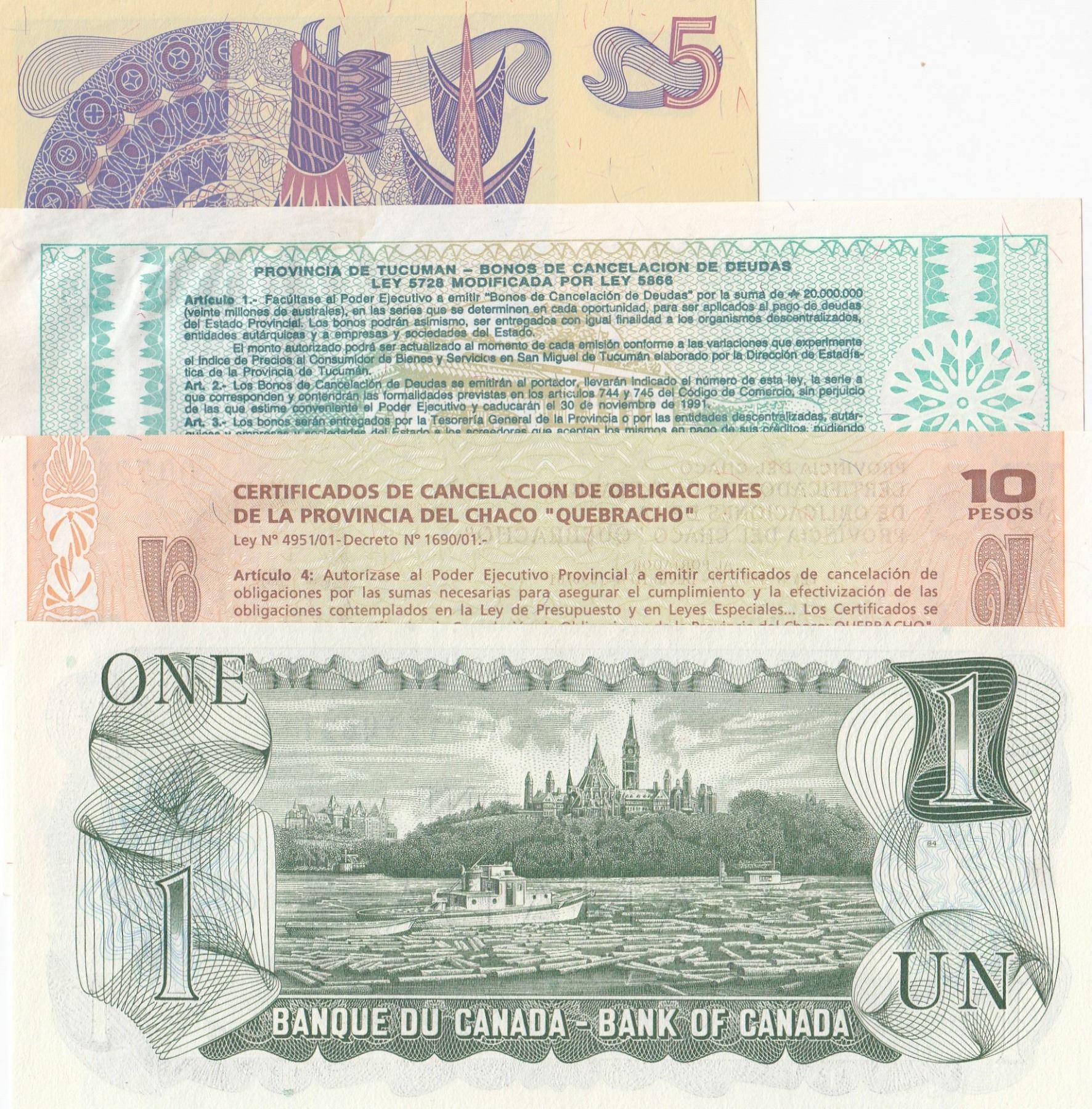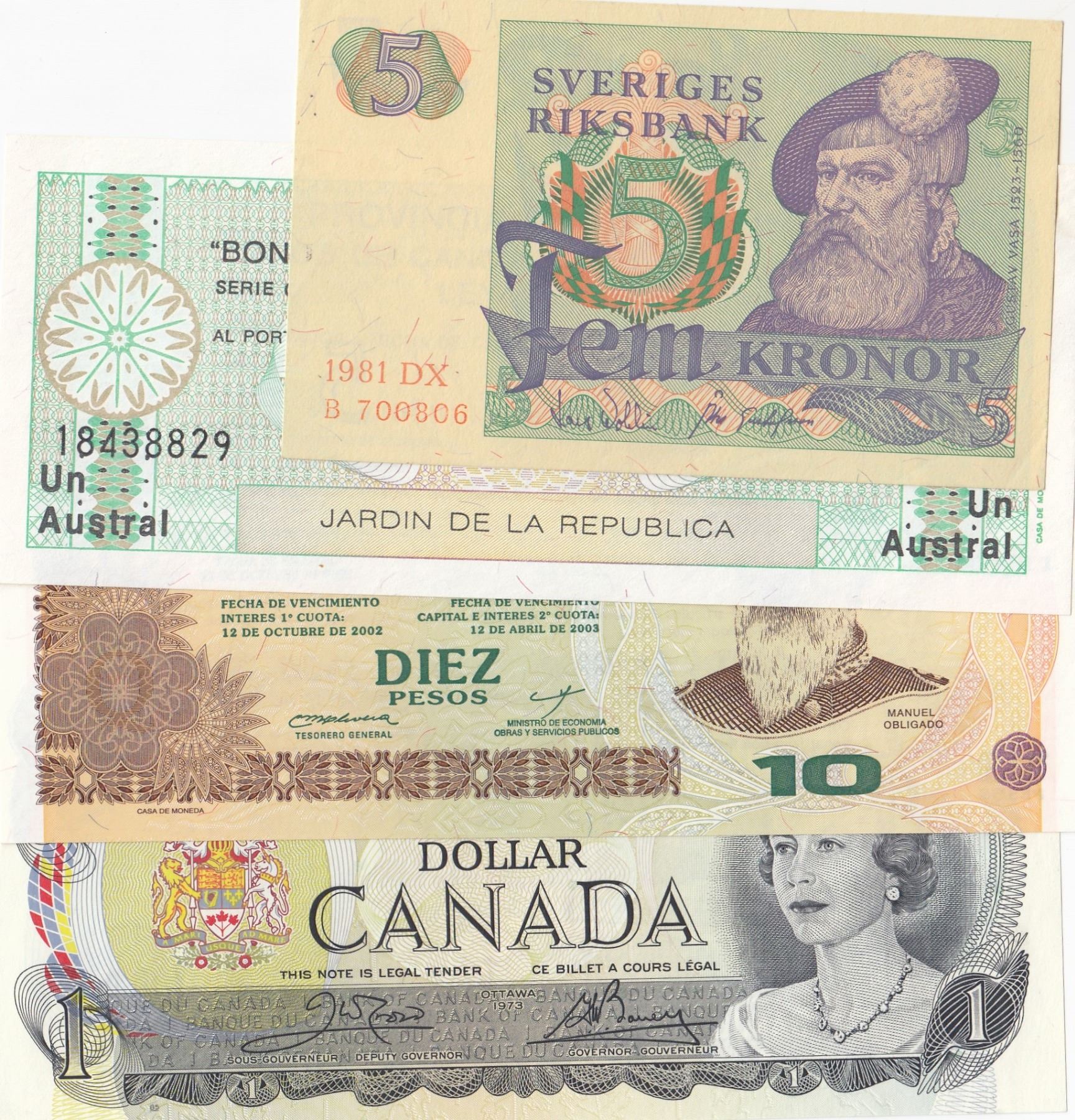 Mix Lot, 4 banknotes in whole UNC conditionbr/Canada, 1 Dollar, Sweden, 5 Kronor, Argentina, 10 Pesos (Cancelled), Argentina, 1 Austral (Tucuman)