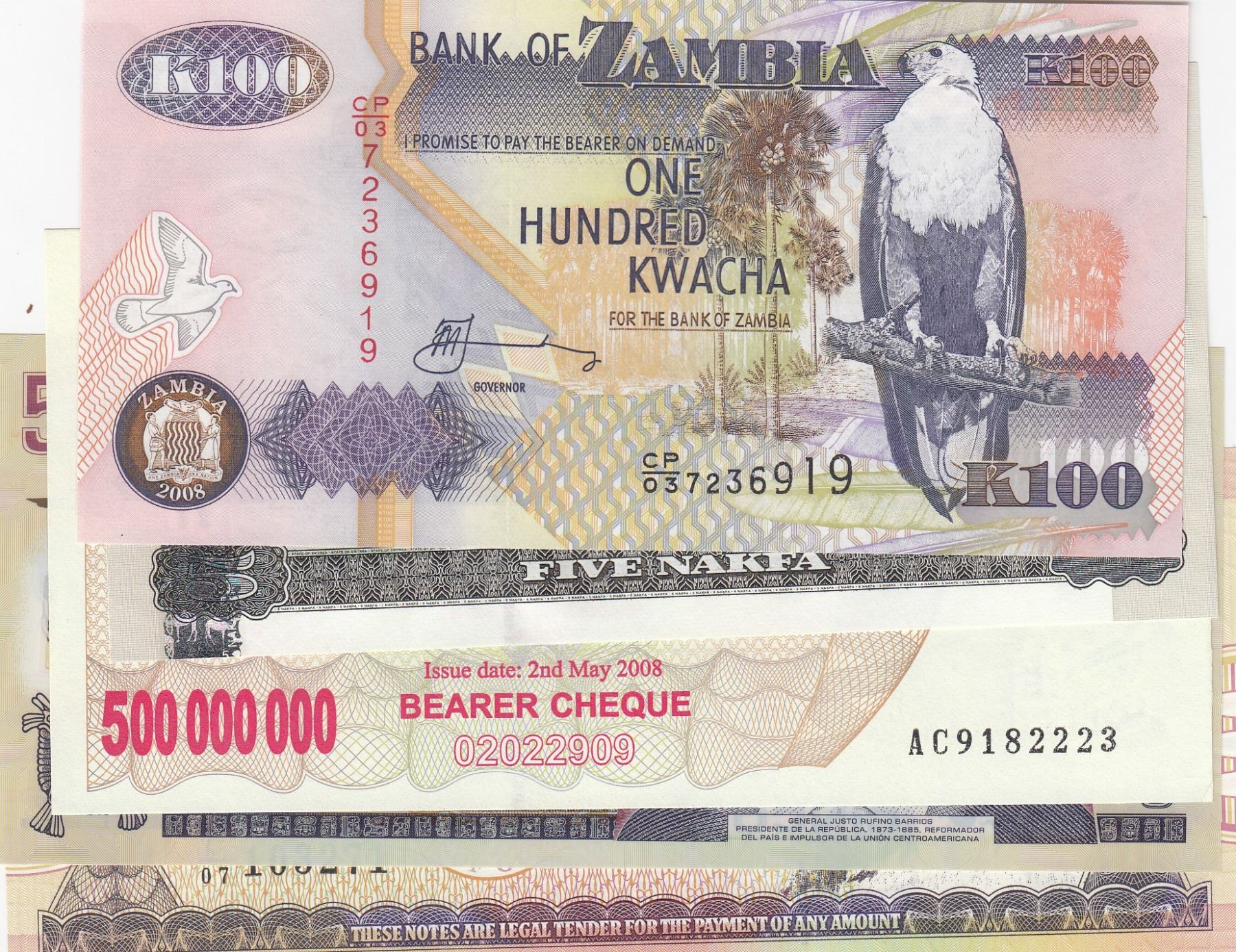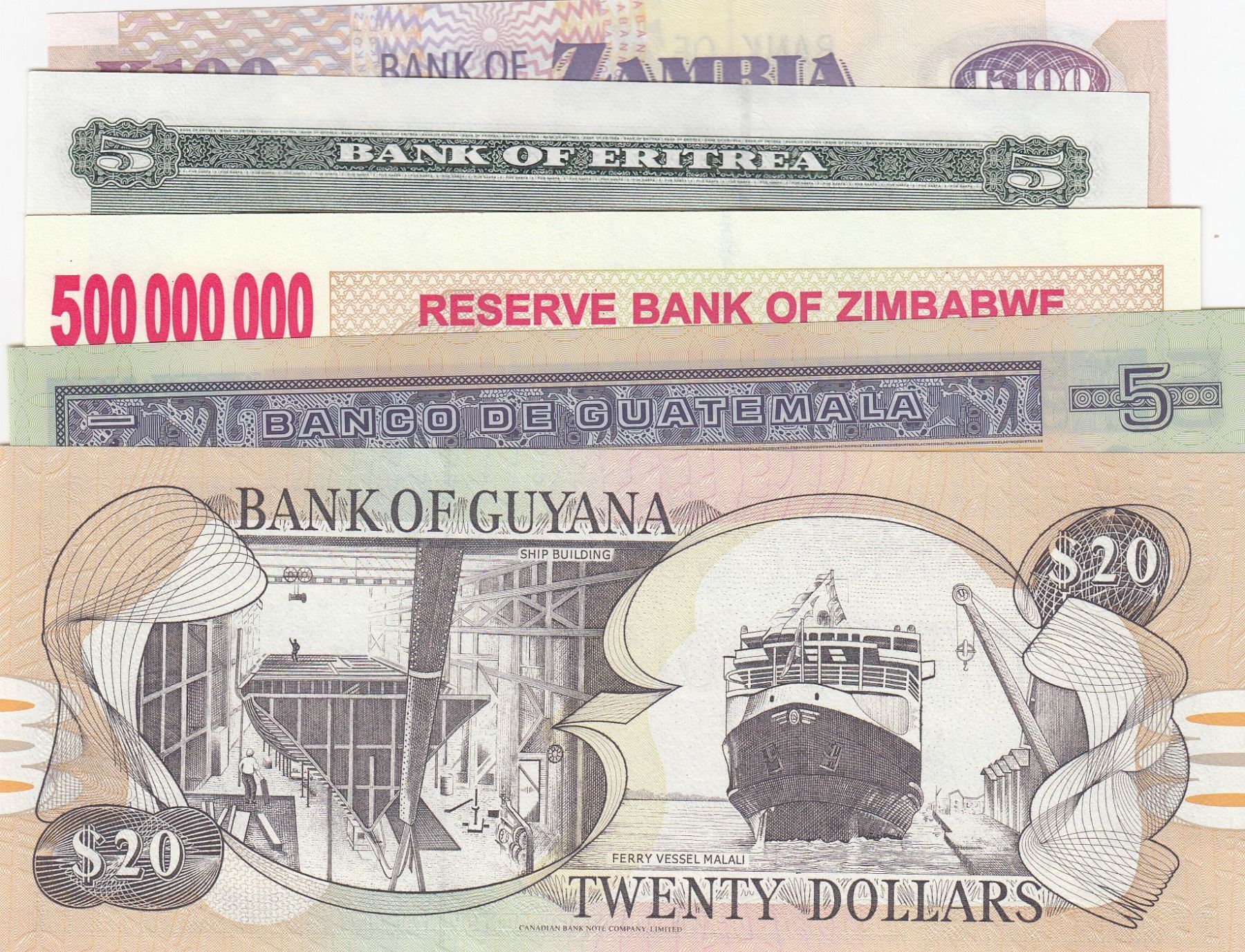 Mix Lot, 5 banknotes in whole UNC conditionbr/Guyana, 20 Dollars, Guatemala, 5 Quetzales, Zambia, 100 Kwacha, Eritrea, 5 Nakfa, Zimbabwe, 500000000 Dollars