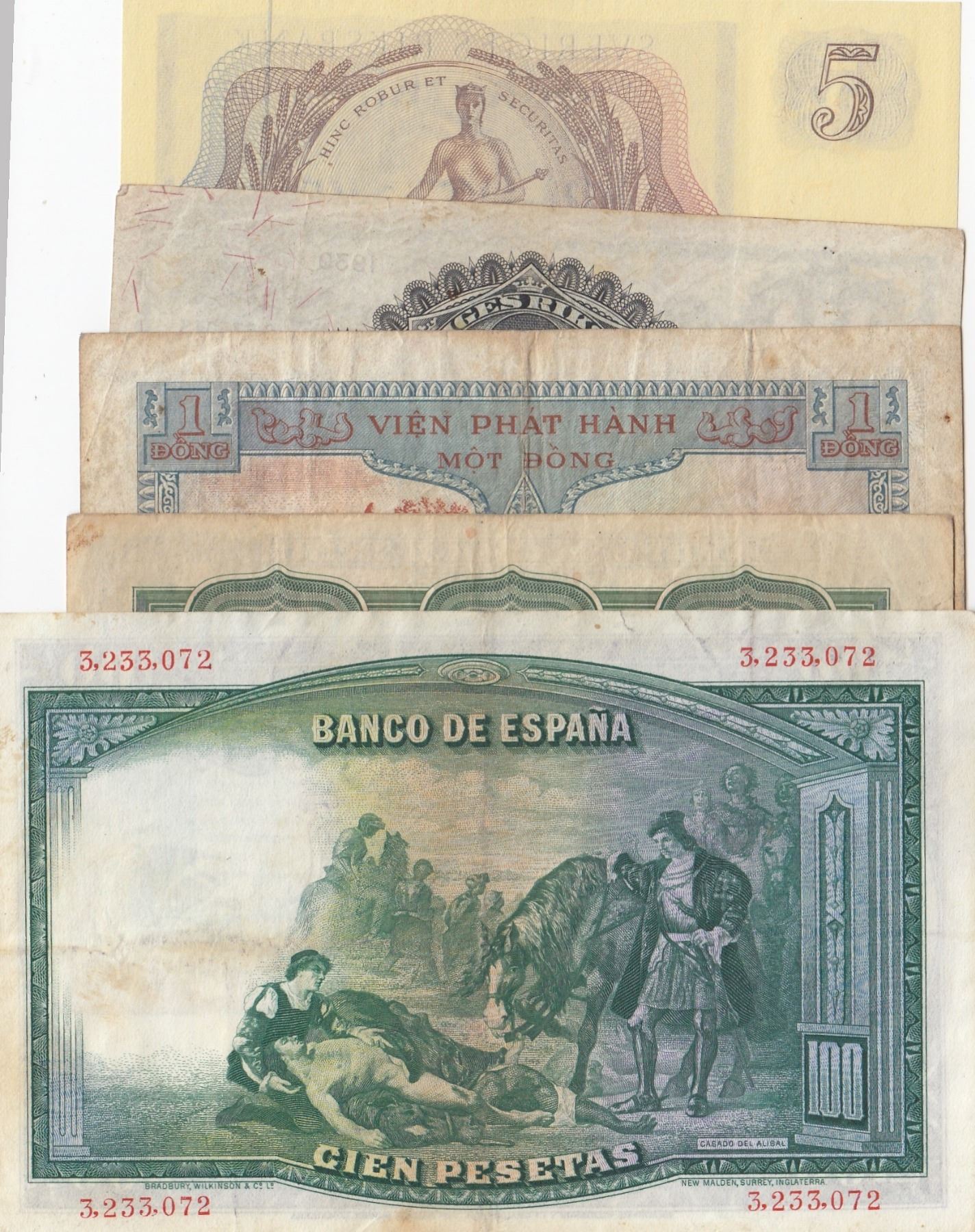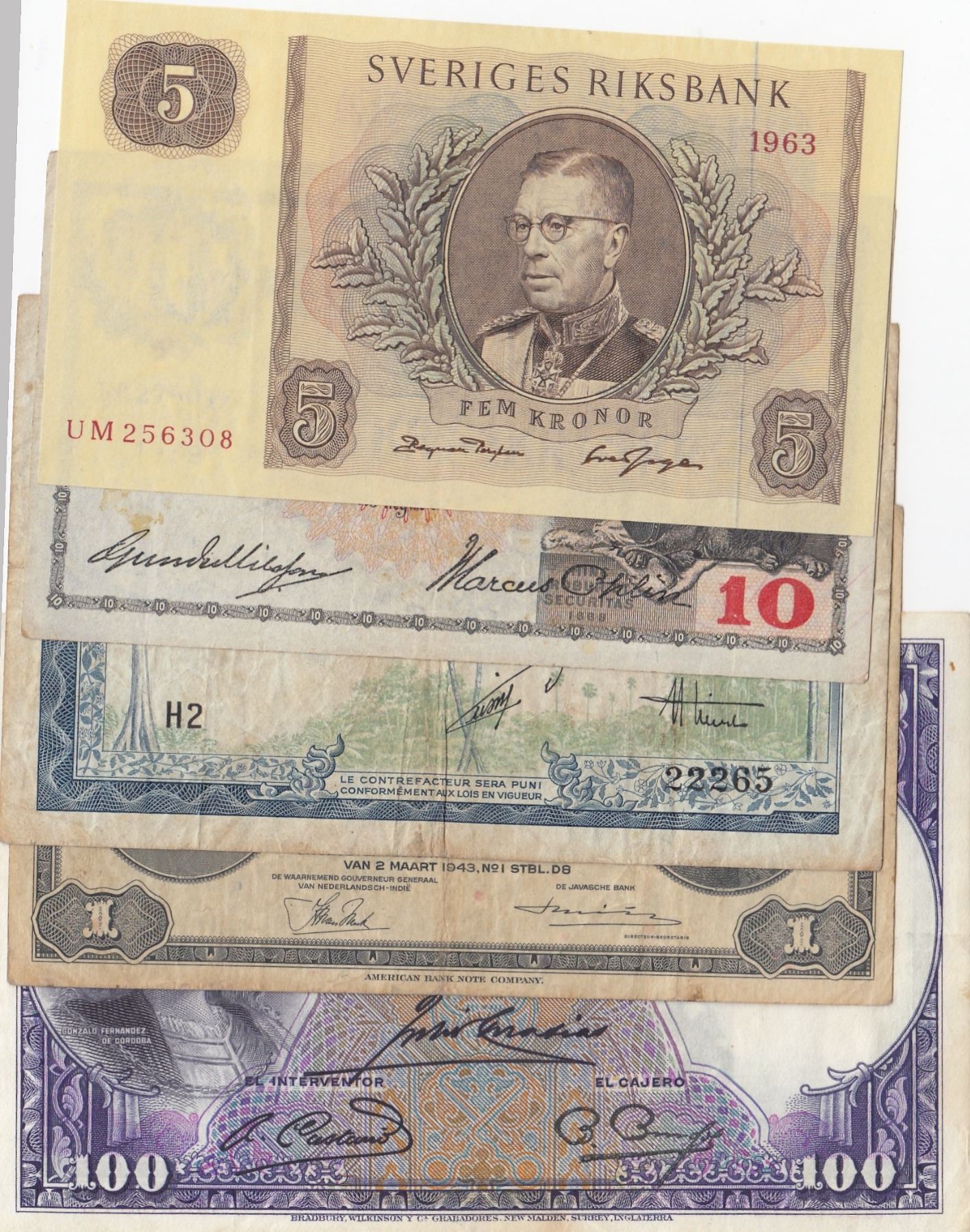 Mix Lot, 5 different banknotes.br/NEDERLANDSCH INDIE, 1 Gulden, 1943, FINE; French indi China, 1 Dong, 1954, VF; Swedish, 5 Kronor, 1963, UNC;
