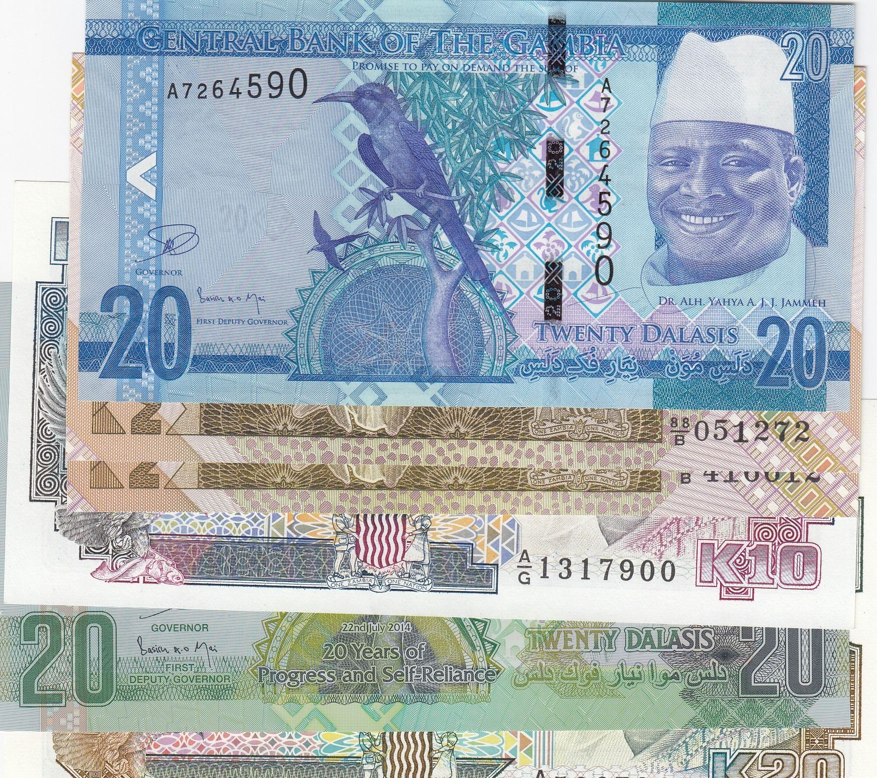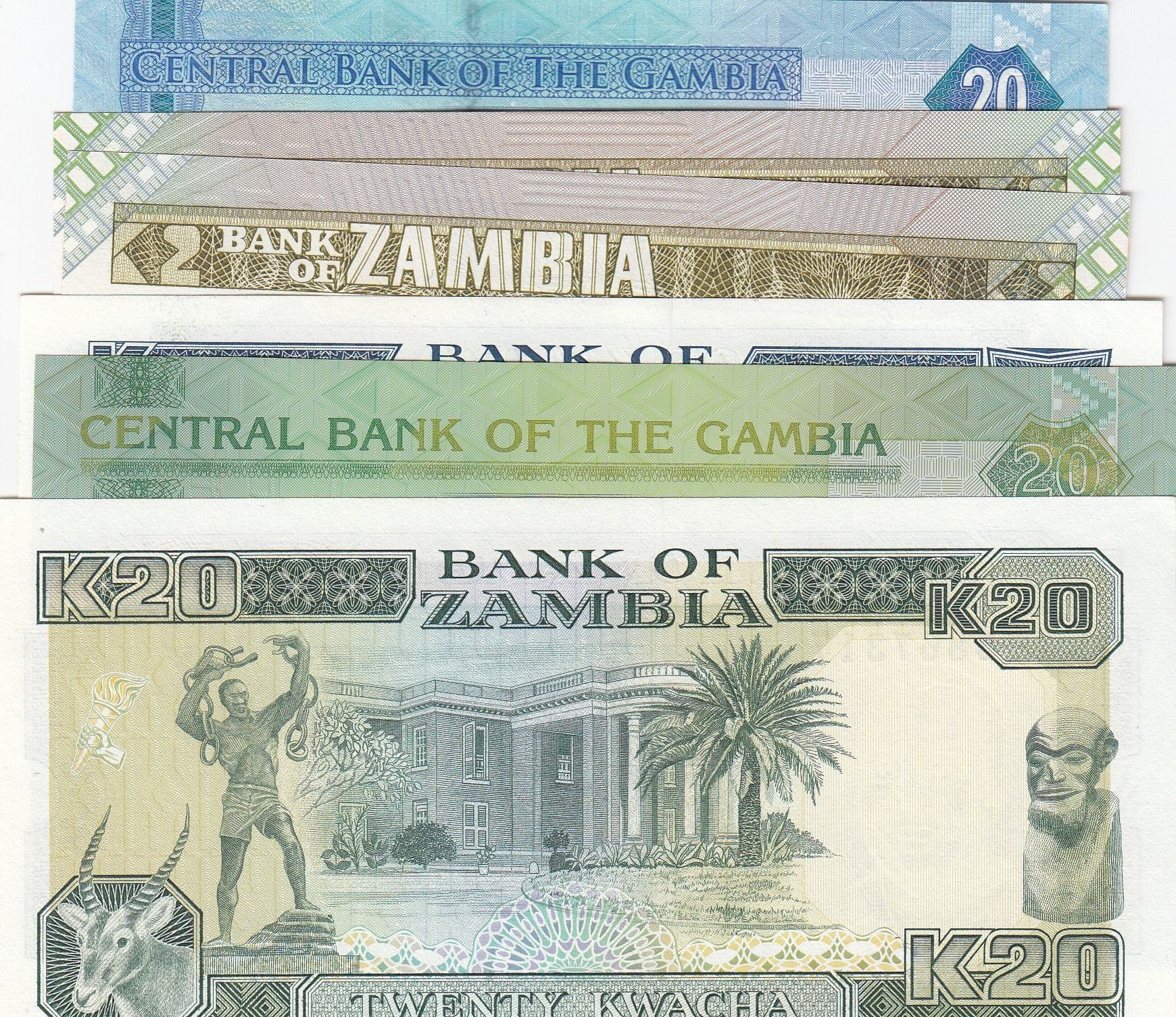 Mix Lot, 6 banknotes in whole UNC conditionbr/Zambia, 2 Kwacha (2), Zambia, 10 Kwacha, Zambia, 20 Kwacha, Gambia, 20 Dalasis (2)