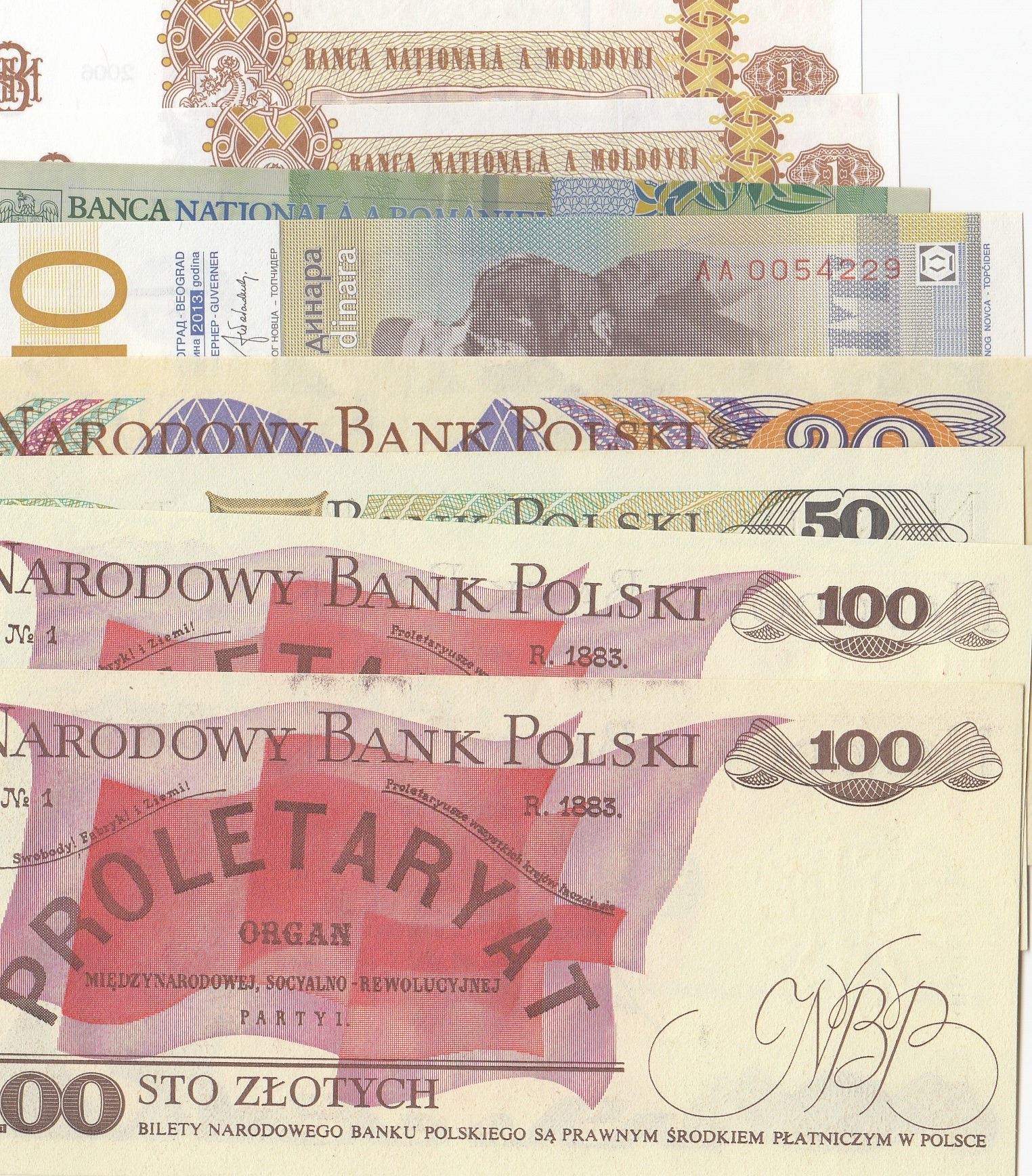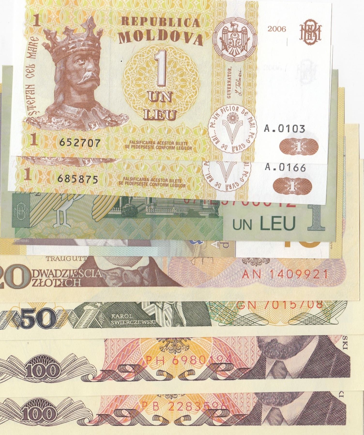 Mix Lot, 8 banknotes in whole UNC conditionbr/Serbia, 10 Dinara, Romania, 1 Leu, Moldova, 1 Leu (2), Poland, 2 Zlotych, Poland, 50 Zlotych, Poland, 100 Zlotych (2)