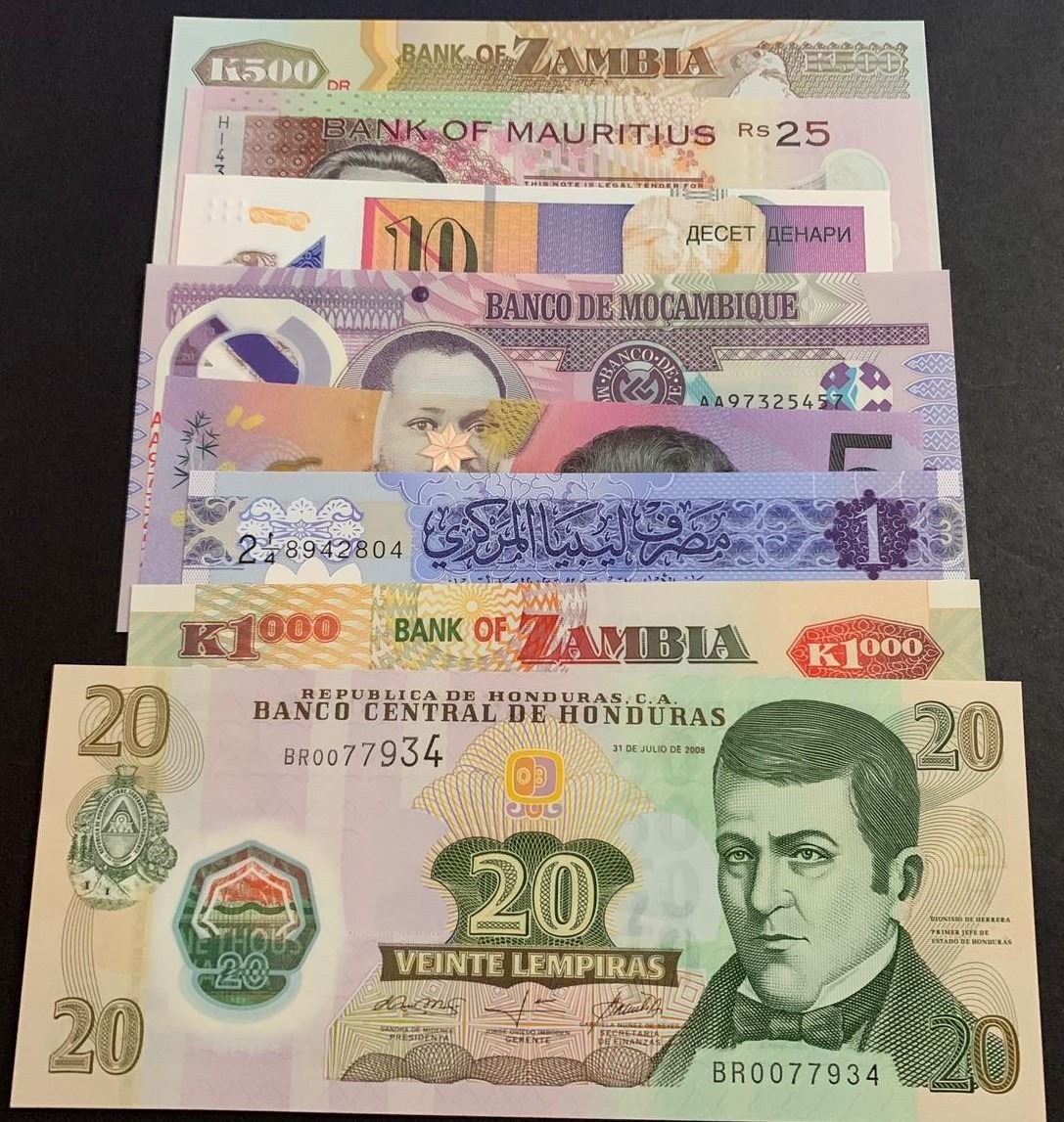 Mix Lot, 8 pieces of UNC polymer banknotesbr/Australia, 5 Dollars, 2016, Unc; Libya, 1 Dinar, 2019, Unc; Macedonia, 10 Dinar, 2018, Unc;