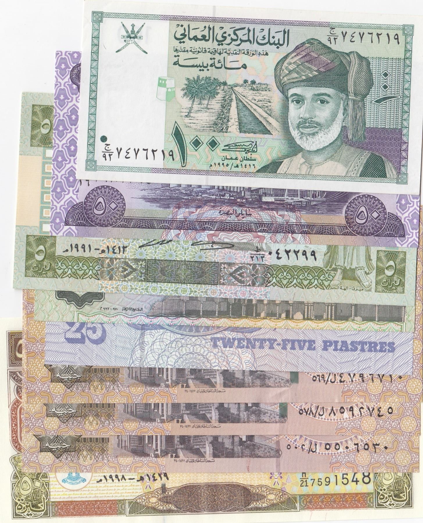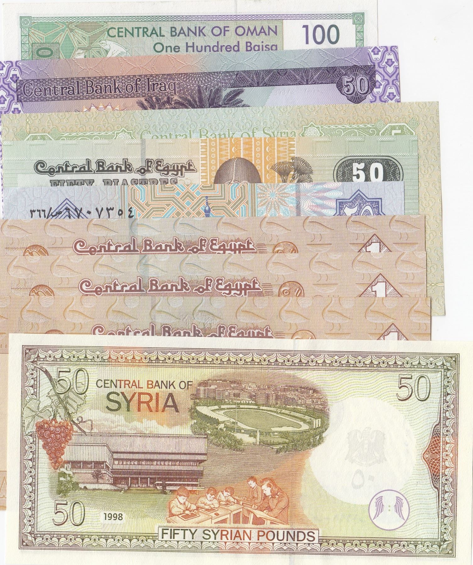 Mix Lot, 9 banknotes in whole UNC conditionbr/Egypt, 1 Pound (3), Egypt, 25 Piastres, Egypt, 50 Piastres, Iraq, 50 Dinars, Syria, 5 Pounds, Syria, 50 Pounds, Oman, 100 Baisa