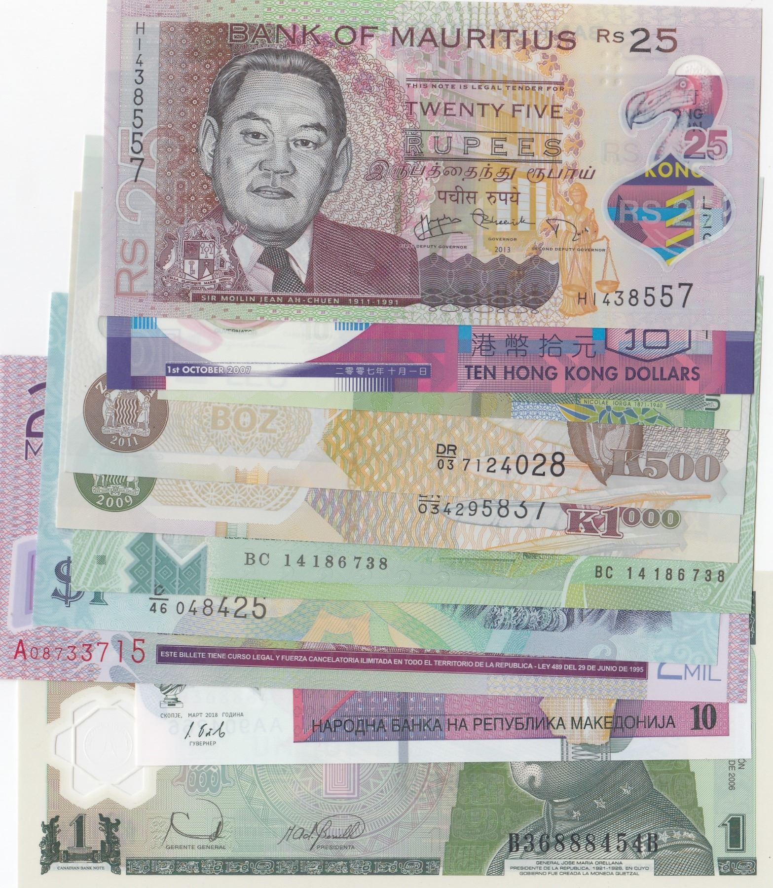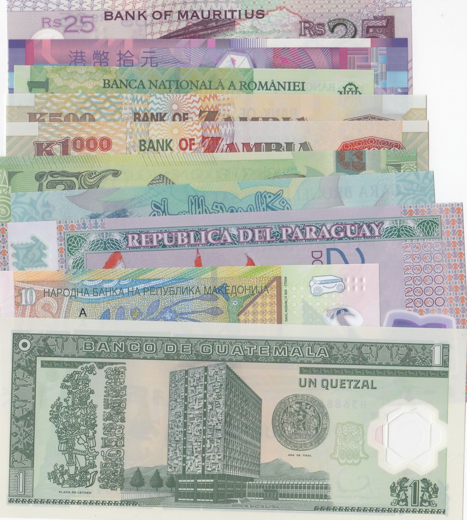 Mix Lot, POLIMER banknote set consisting of 10 banknotes of different countries, all in UNC conditionbr/Romania, 1 Leu, 2005; Hong Kong, 10 Dollars, 2007; Guatemala, 1 Quetzal, 2006; Paraguay, 2.000 Guaranies, 2008;