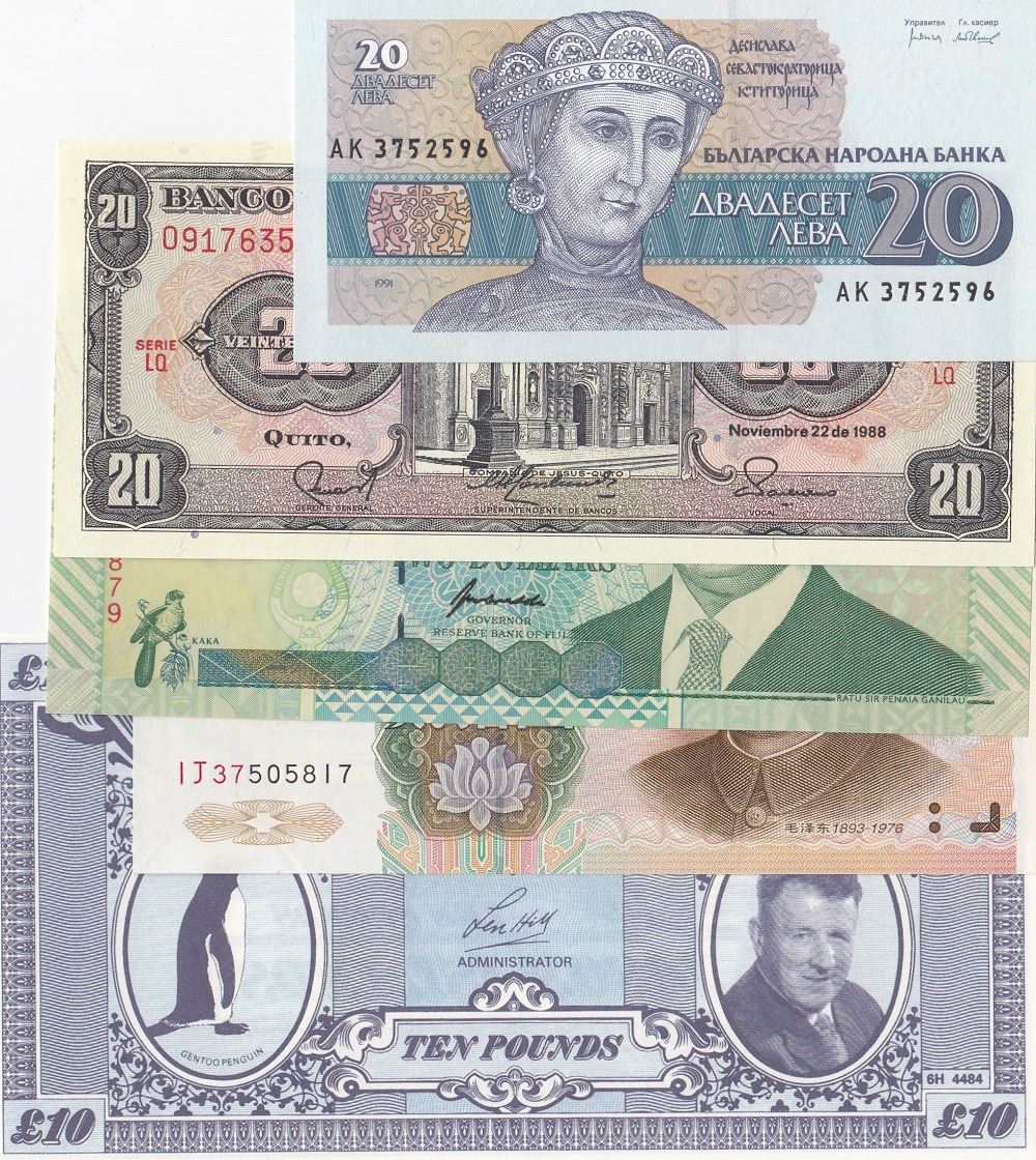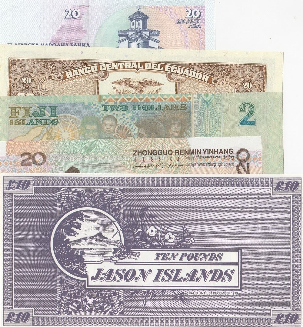 Mix Lot, Total 5 pcs of UNC banknote from different countriesbr/Fiji, 2 Dollars 2000; Ecuador, 20 Sucres, 1988; Bulgaria, 20 Leva, 1991; China, 20 Yuan, 1999;