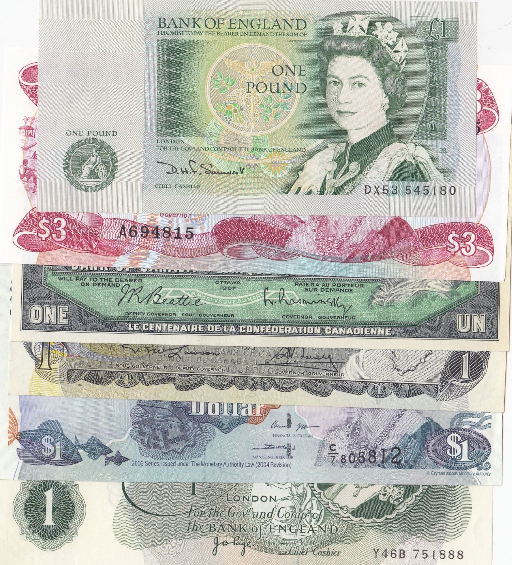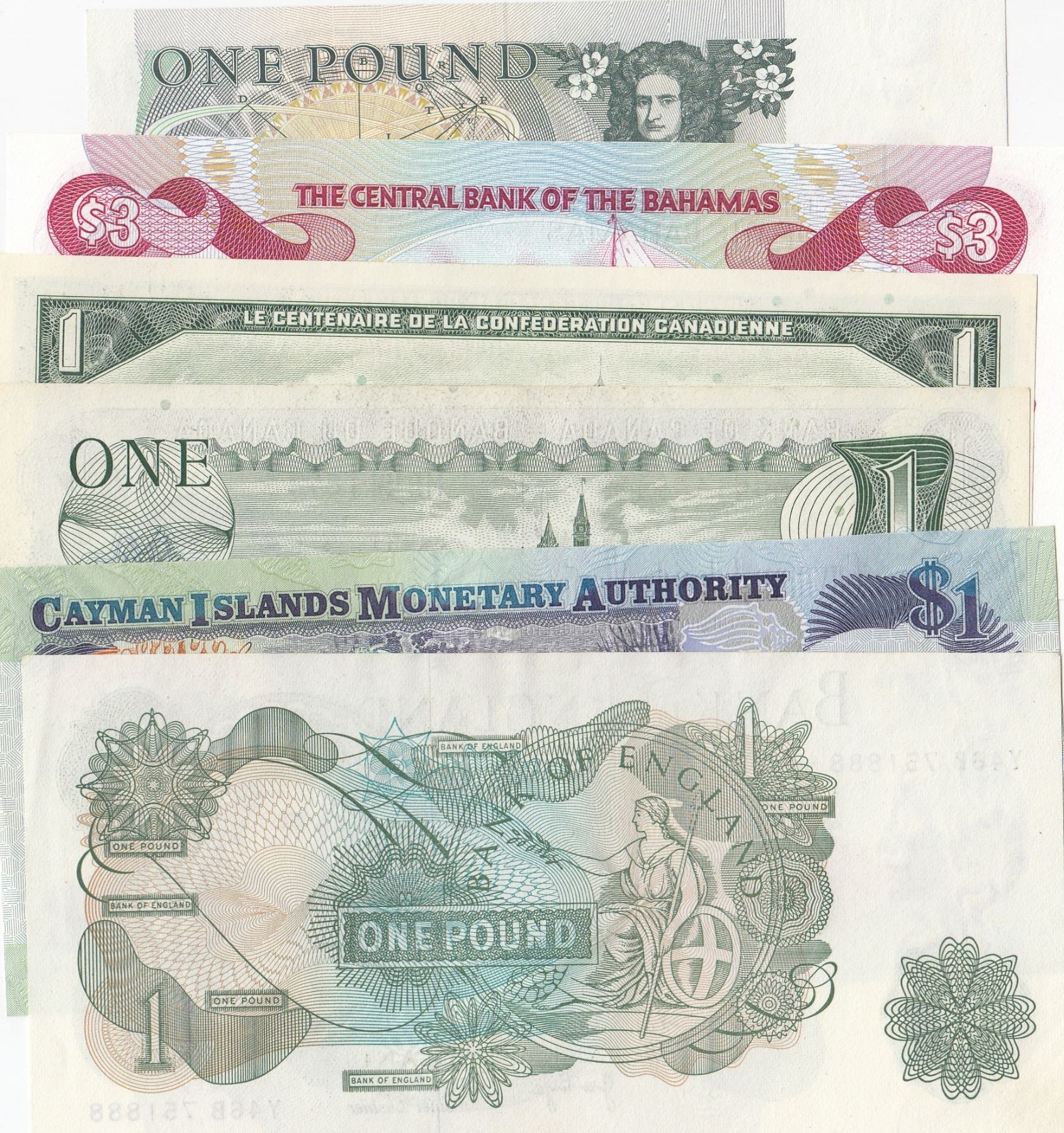 Mix Lot, Total 6 pcs UNC condition "QUEEN ELIZABETH II" banknotesbr/Canada, 1 Dollar, 1973; Canada, 1 Dollar, 1954; Bahamas, 3 Dollars, 1984; Great Britain, 1 Pound, 1970;