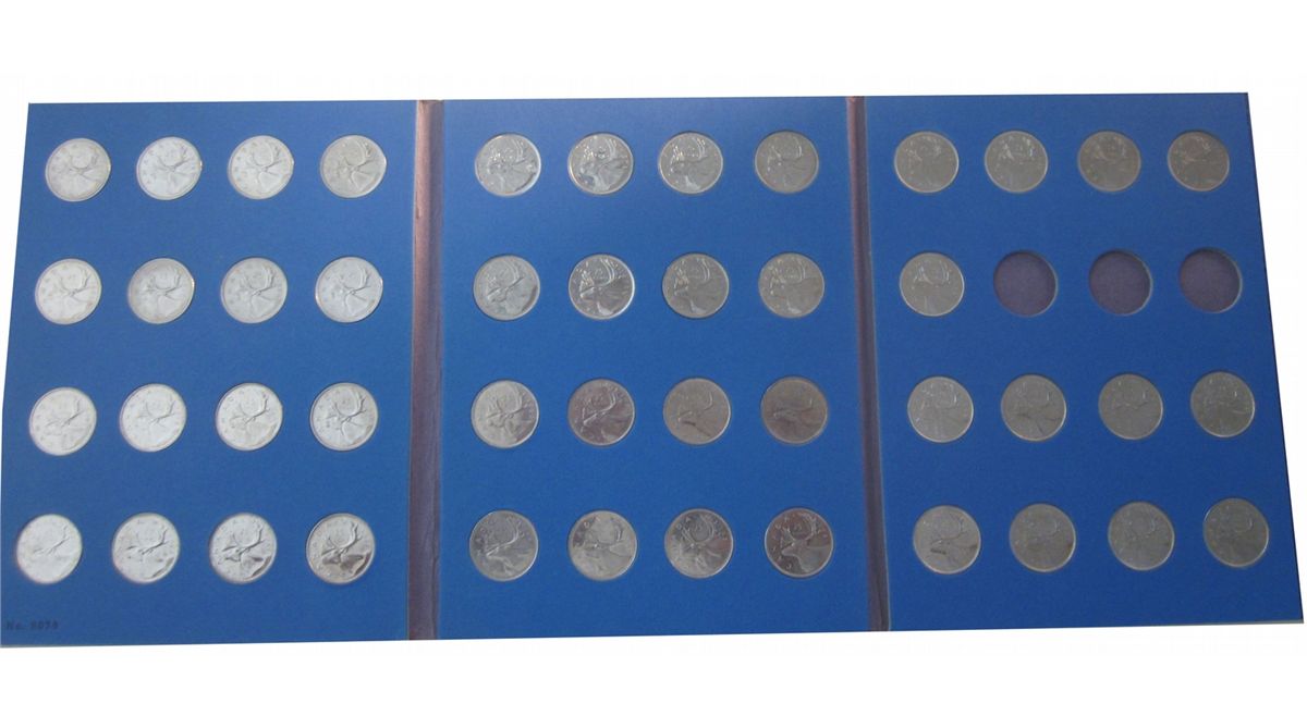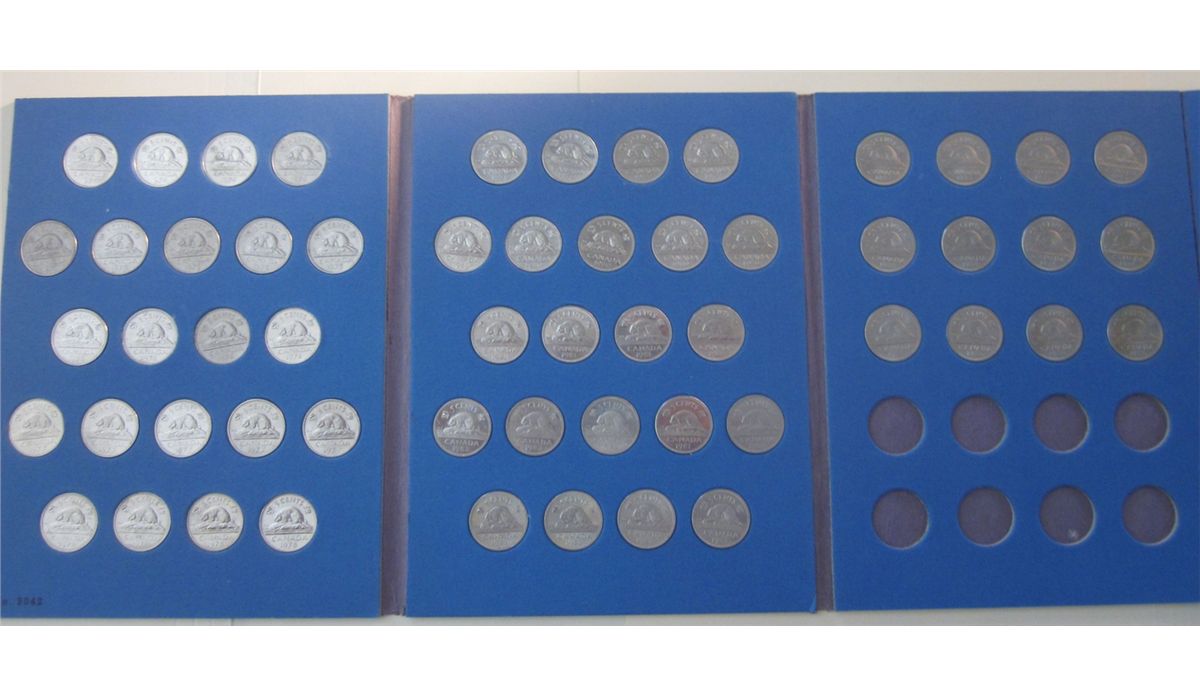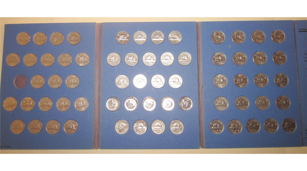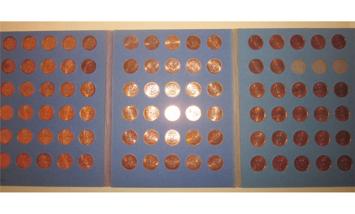 Mix lot; 1 cent 1974 to 1991 inclusively in Whitman album, 5 of each date in BU, 5 cents 1959 (4), 1960 (5), 1961 (3), 1962 (5), 1963 (4), 1964 (4), 1965 (5), 1966 (4), 1967 (5), 1968 (4), 1969 (4) 1970 (4), 1971 (4), 1972 (4), 1973 (5), 1974 (4), 1975 (5), 1976 (4), 1977 (5), 1978 (4), 1979 (4), 1980 (5), 1981 (4), 1982 (5), 1983 (4), 1984 (4), 1985 (4) & 1986 (4) in 2 Whitman album mostly BU some circulated, 10 cents 1974 to 1986 inclusively in Whitman album, 5 of each date mostly BU, 25 cents 1974 to 1985 4 of each date except 1983 only 1 in Whitman album, all BU. Lot of 317 coins.