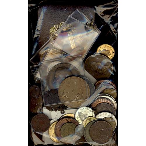 Mix lot of 78 medals, tokens and coins from cross Canada and a few from the United States. See scan