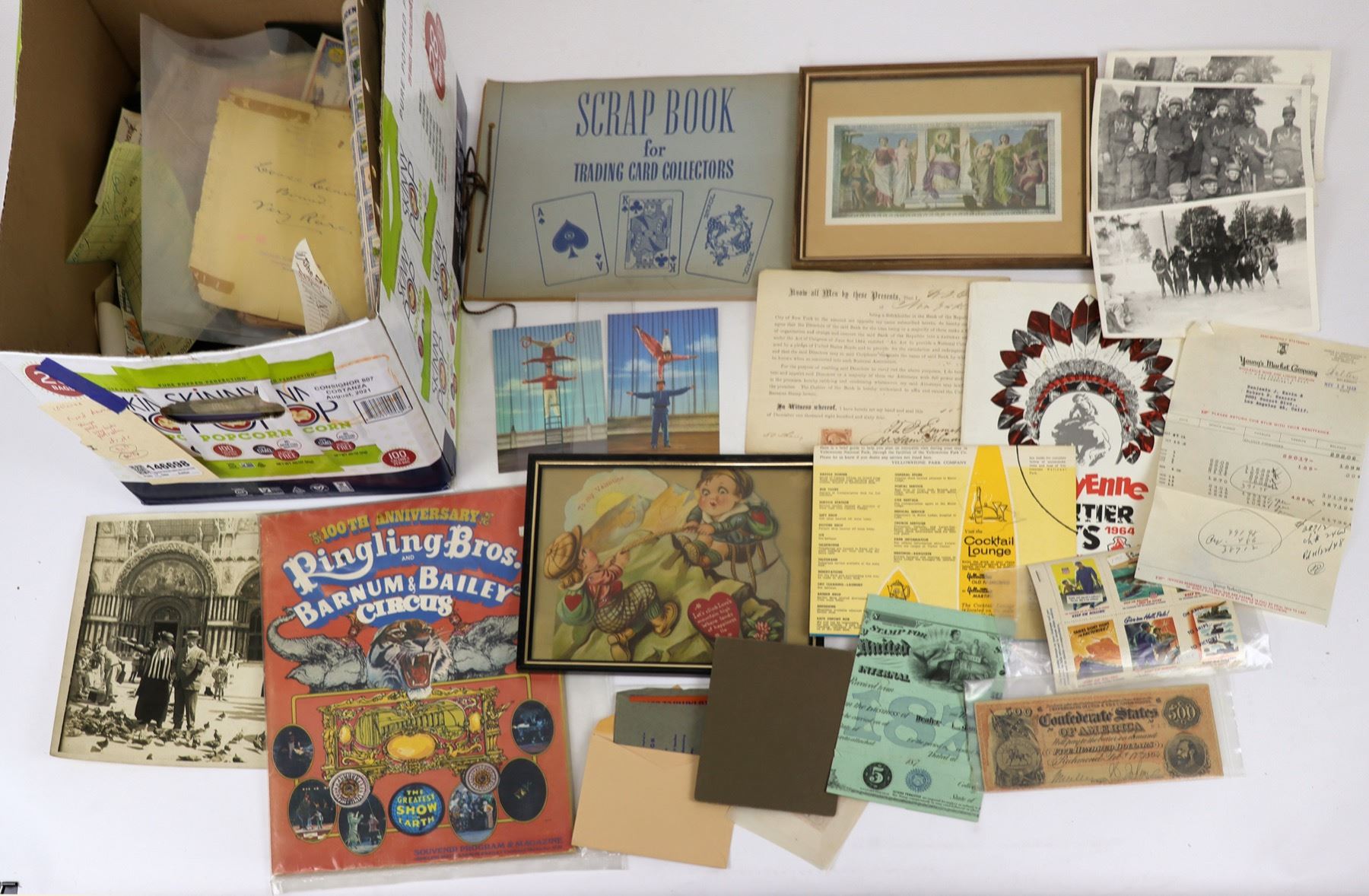 Box containing uncounted number of items, includes a mix of stamps, photos, scrap books, photo albums, framed prints, post cards, booklets, billheads, and a variety of other ephemera and collectibles from 19th and 20th century America. Random example: small booklet, 2 3/4" x 5 1/4", titled Washington Monitor and Freemason's Guide to the Symbolic Degrees, published by Authority of The Grand Lodge of Washington, 1917, includes handwritten member initiation on Oct 5, 1921. and became a Master Mason on Nov 22, 1921. Box size 16" x 12" x 9 1/4". A real grab box of potpourri for any collector of Americana. City: State: Date:
