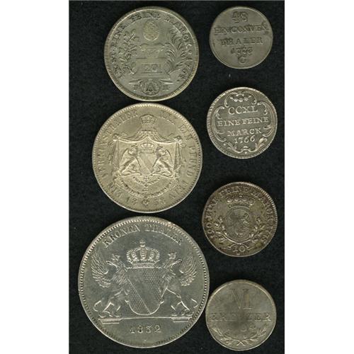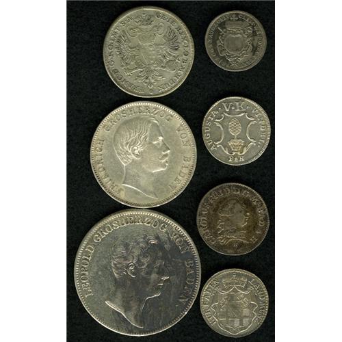 <B>Mixed Augsburg and Baden lot including:</B></I> Augsburg 5 Kreuzer 1766, KM186, lustrous AU; Augsburg 1/48 Taler 1773, KM27, VF; Augsburg 20 Kreuzer 1765, KM177, VF; Baden 6 Kreuzer 1804, KM138, VF, very scarce; Baden 10 Kreuzer 1775HW, KM122, EF; Baden Taler 1858, KM240, XF details with numerous contact marks; and a Baden Kronenthaler 1832, KM195.2, harshly cleaned with possibly mount removed. <B>Sold as is, no return lot.</B></I><BR><I>From the Blue Ridge Collection</B></I><BR><BR><b>Shipping:</b> Coin/Currency (<a target="_blank" href="http://www.heritageauctions.com/common/shipping.php">view shipping information</a>) <BR><BR><B>Important notice:
