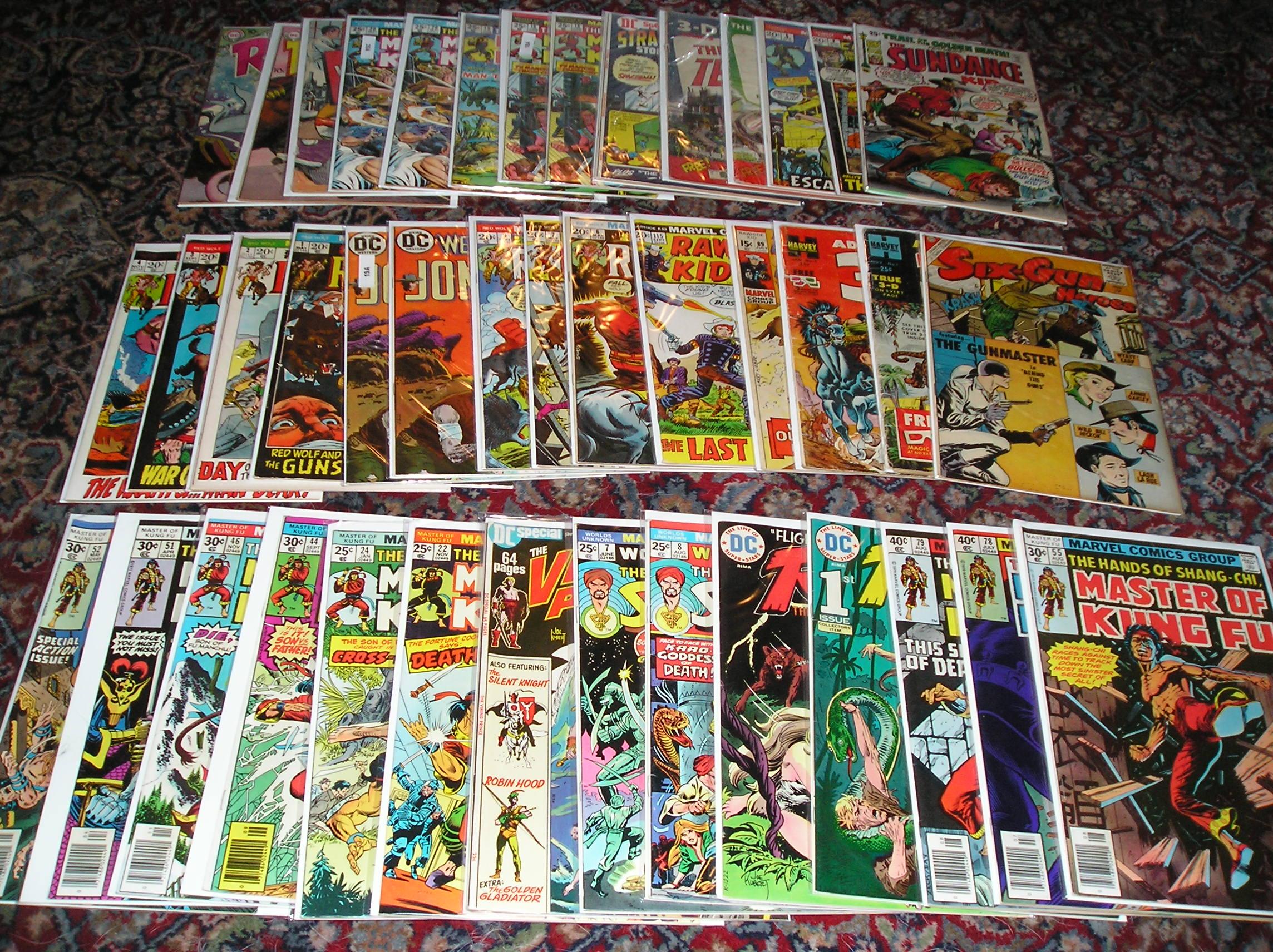 Weird Western Tales #19 (x2), Red Wolf #1-4, 6-7, 9, Rawhide Kid #89, 115, Six Gun Heroes #58, Adventures in 3-D #1-2, Rex The Wonder Dog #42, 45, Wonder Book of Rubber, Poll Parrot in "Jungle Bungle", Buster Brown #43, Buster Brown Goes To Mars, Wanted #5, 7, The Champions #2-3, 11, Prez #3, Do You Believe In Nightmares #1, The Unexpected #125, 150, Western Kid #17, Two-Gun Kid #99, Mighty Marvel Western #26-27, All Star Western #115, 117, The Sundance Kid #2, Combat Kelly #2, 5, 3-D Comics #1-2, Strangest Sports Stories Ever Told #13, Master of Kung Fu #18 (x2), 19, 20 (x2), 22, 24, 44, 46, 51-52, 55, 78-79, Rima the Jungle Girl #1-2, Worlds Unknown #7-8, DC Special #12. 61 issues total, avg condition ranges from FN to VF
