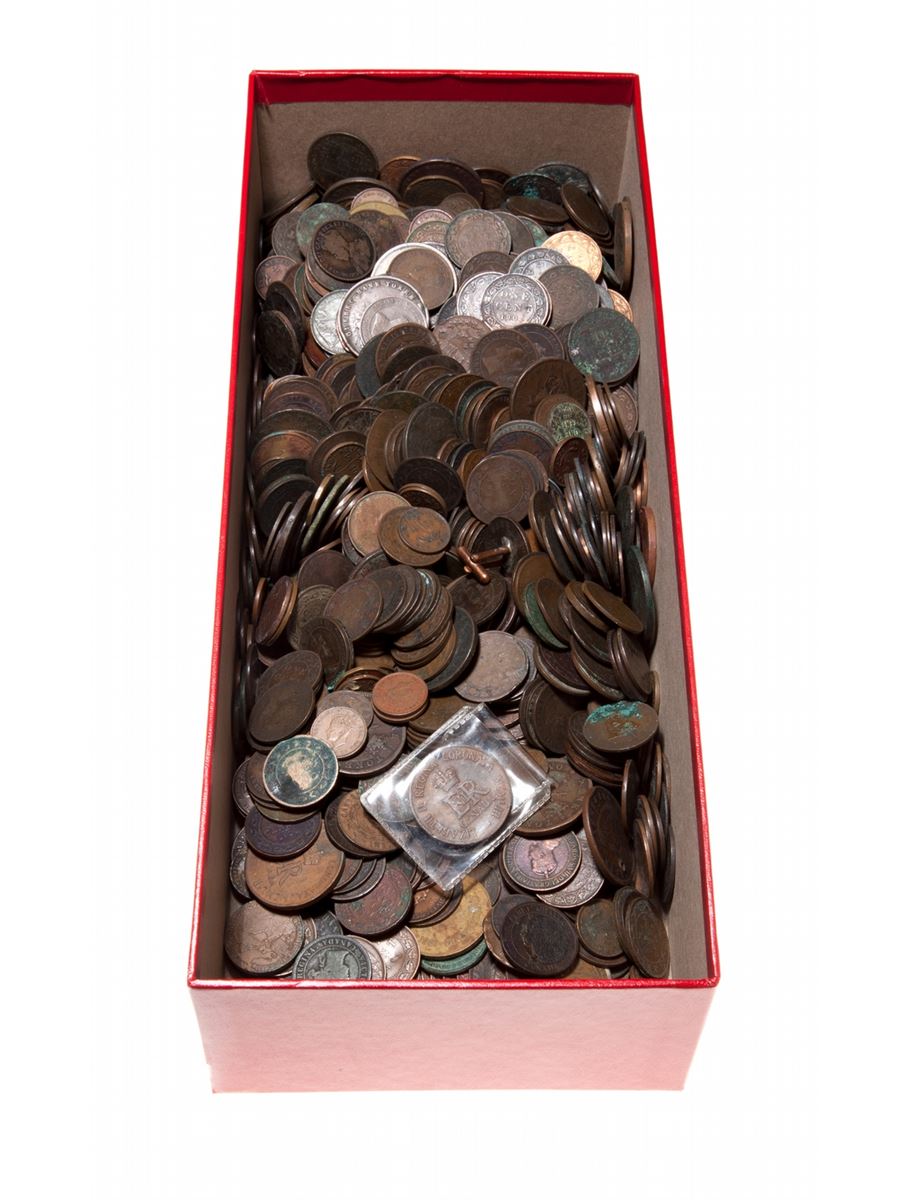 Mixed Canadian Copper Lot. 1858-1920. Mostly 1 cent Canada, 1858 - 1920, NFLD to 1940's. Also includes Pre-Confederation 1/2 Penny and Penny tokens. Grades are generally aG to VG, with a few choicer pieces. Weight 6.8 kg, approx. 1,200 - 1,500 pcs. Viewing highly recommended. Sold as-is, no returns.