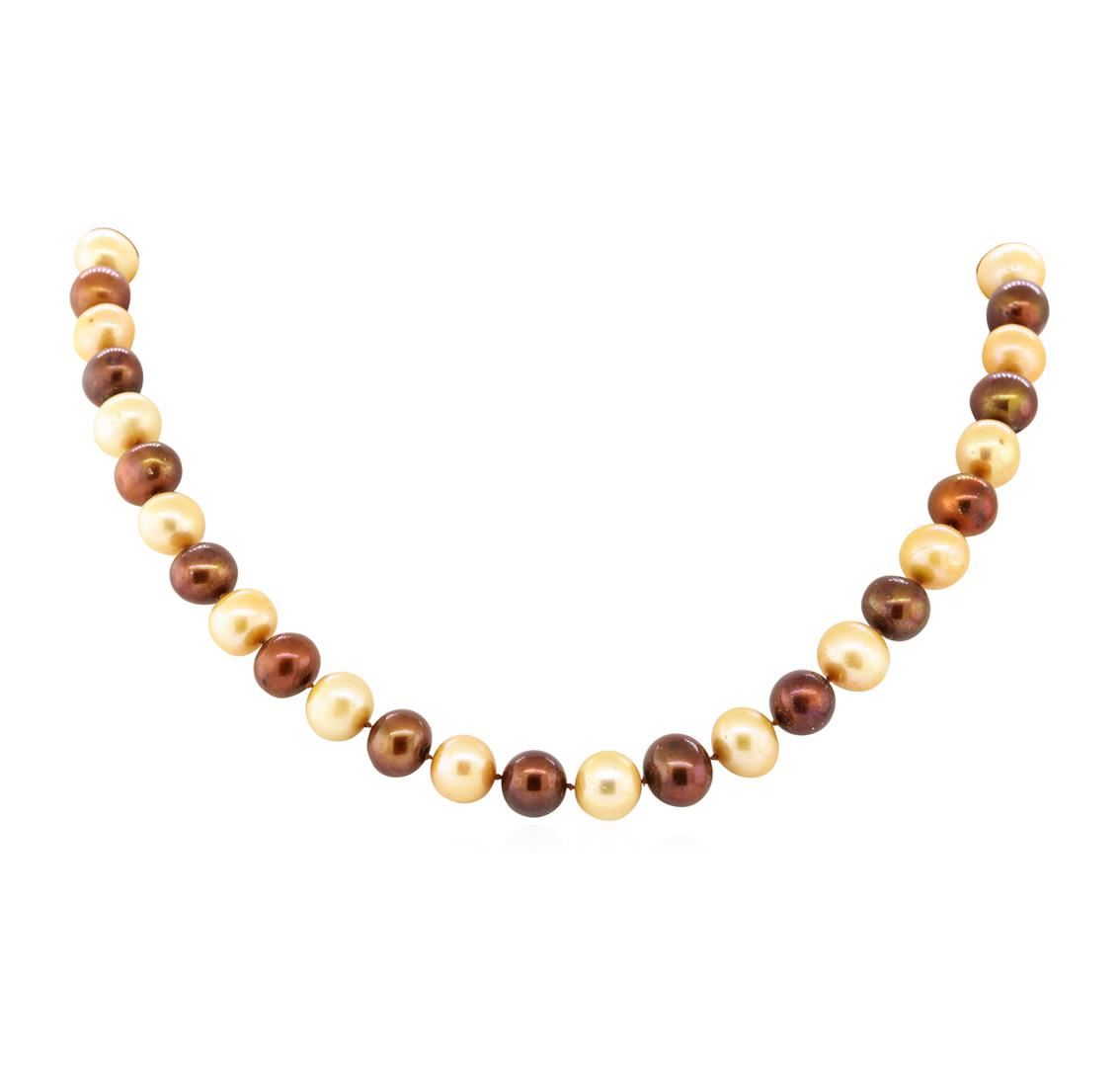 One mixed color chocolate pearl necklace measuring approximately twenty inches in length featuring: pearls measuring approximately 12.0 millimeters with a 14KT yellow gold clasp weighing 2.0 grams and a total weight of 87.2 grams.