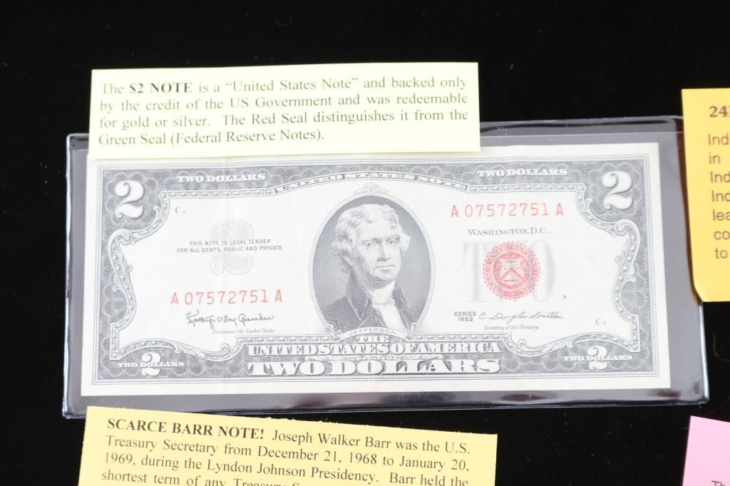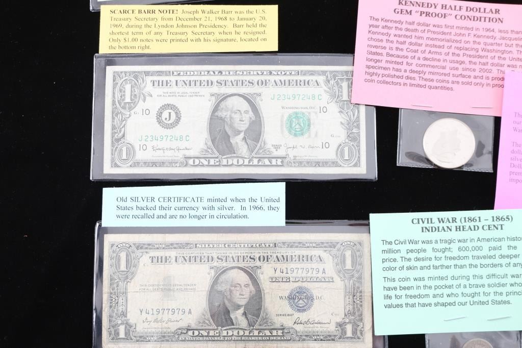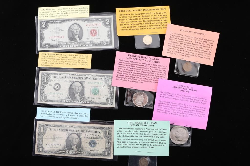 Includes 1909 Lincoln Head cent in plastic protector, a Civil War Indian head cent, a Kennedy Half Dollar Gem proof condition. A 24kt Gold Plated Indian Head Cent, a Eisenhower sliver dollar. A scarce 1 dollar Barr note in plastic protector. A two dollar note with red seal, also included is a old silver certificate minted in 1966.