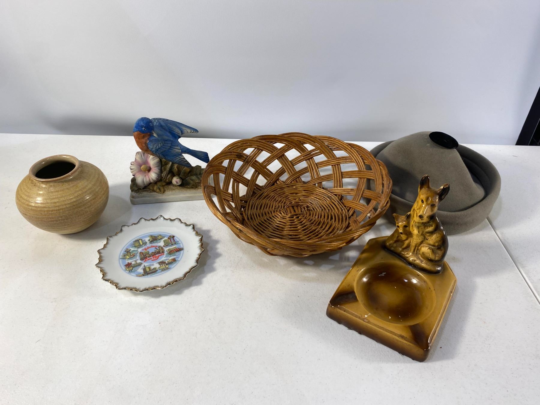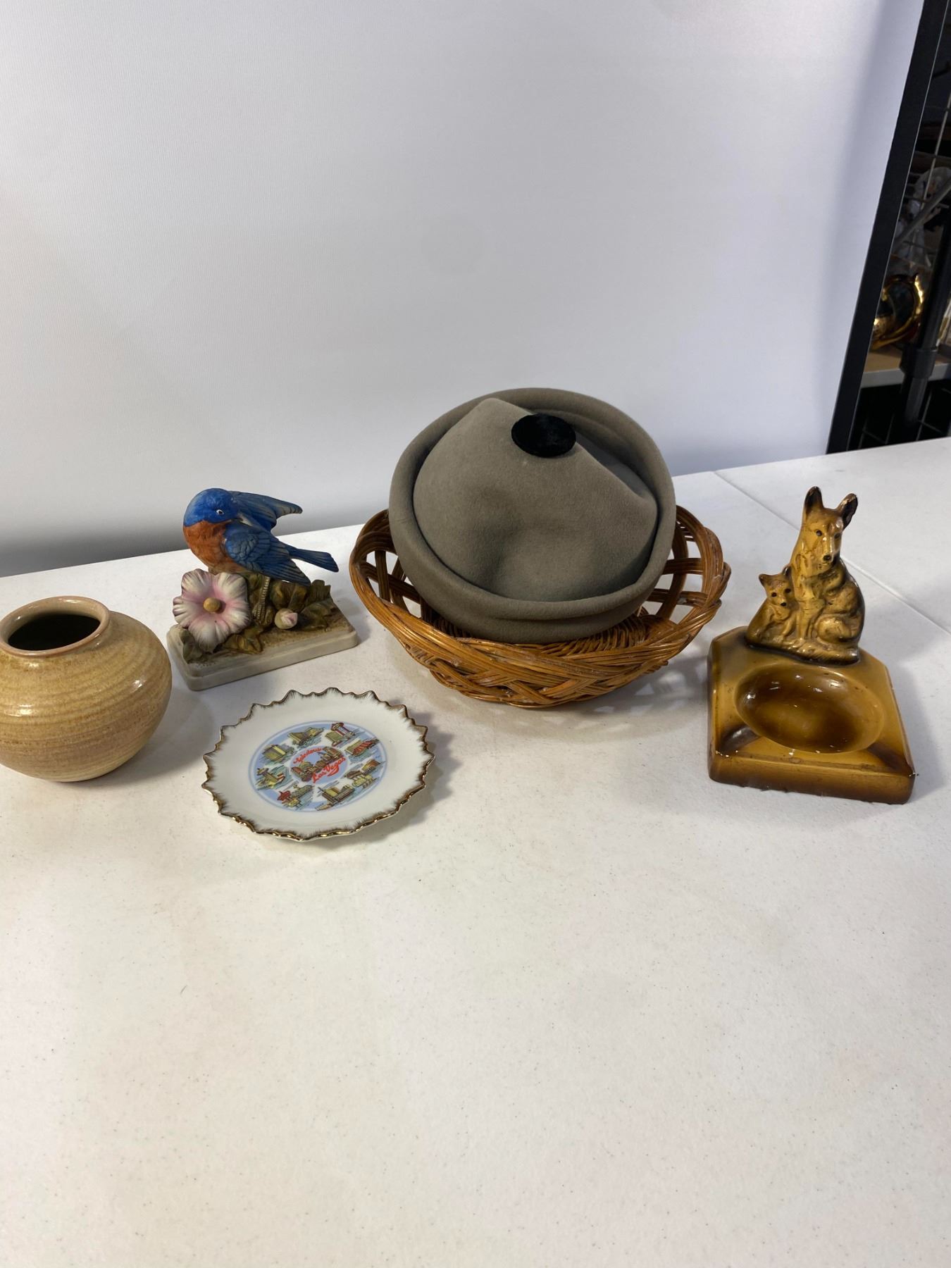 A charming mixed lot of vintage home decor including a ceramic vase, bird figurine, souvenir dish, wicker basket with fabric cover, and a small dog-themed ashtray. These mid- to late-20th-century pieces offer a warm, nostalgic feel and are ideal for decor enthusiasts or resellers looking for easy-to-style decorative accents with gentle age wear.