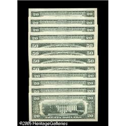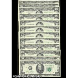 <B>Mixed Denomination Set.</B></I><BR>Fr. 2077-K, 2124-K $20, $50 1990 Federal Reserve Notes. Twelve Consecutive Notes. Choice Crisp Uncirculated or Better.</B></I><BR>This is one of the few sets known of this type of error, where stocks of one denomination get mixed in with a second denomination after the first and second printings, and then those sheets are sent to the overprinting press. Each note in this 12 note run is documented in <I>United States Paper Money Errors</B></I> by Dr. Frederick J. Bart. This consecutively numbered run consists of four $20s, four $50s, and then four more $20s.<BR> 12 notes Lot:15463