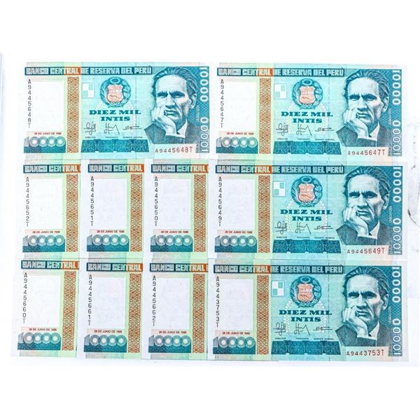 10 x Banco Central De Peru, 1988 Diez Mil Intis (10000) UNC In Sequence 8004077