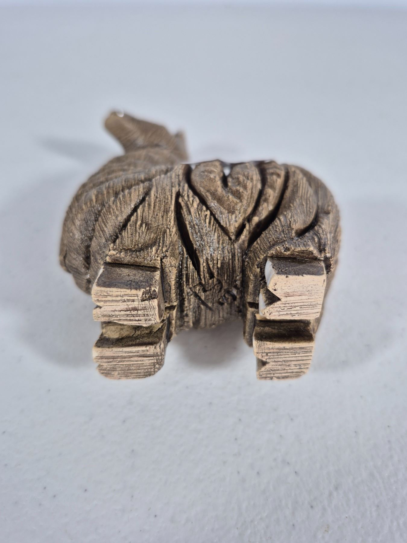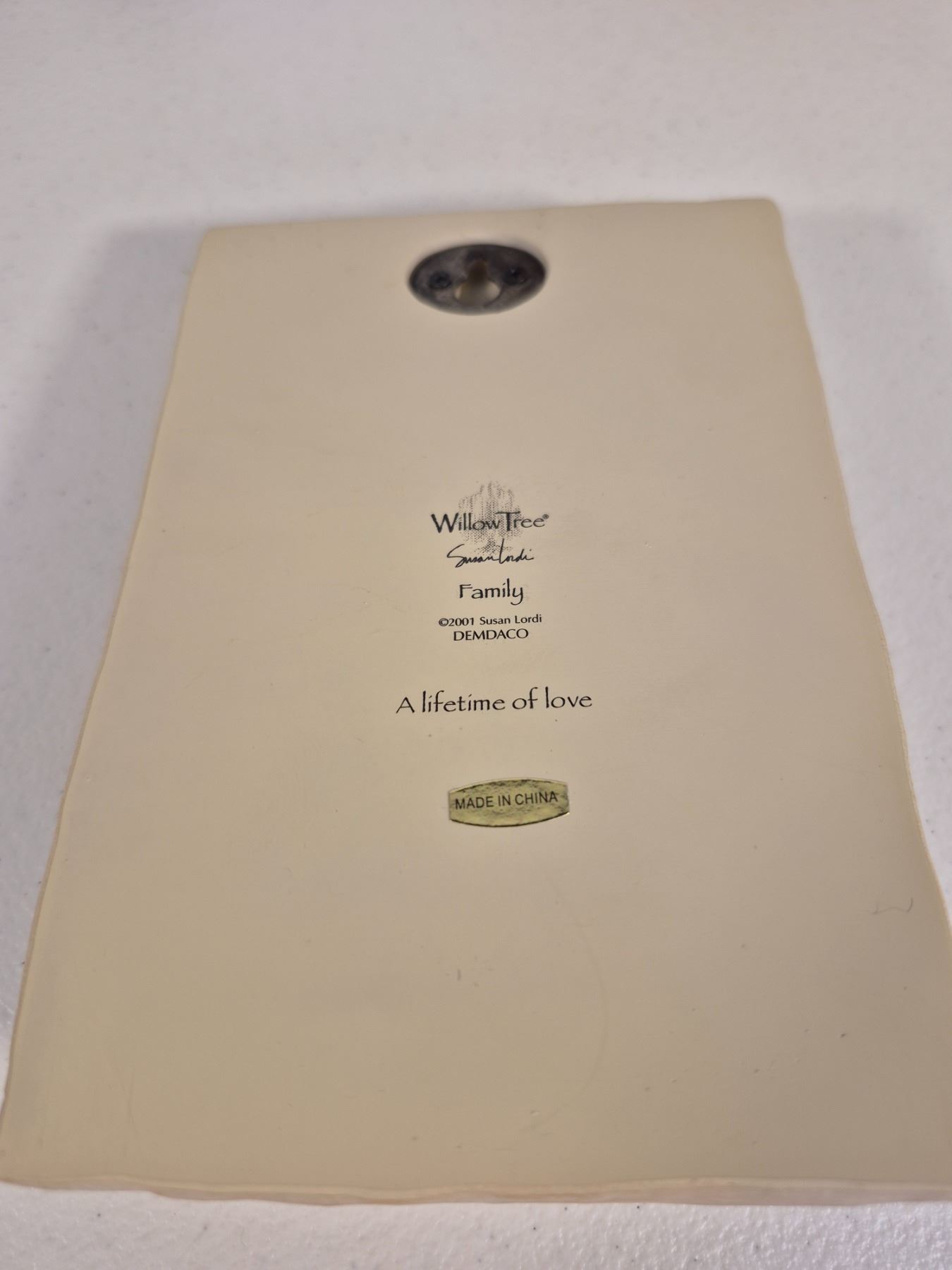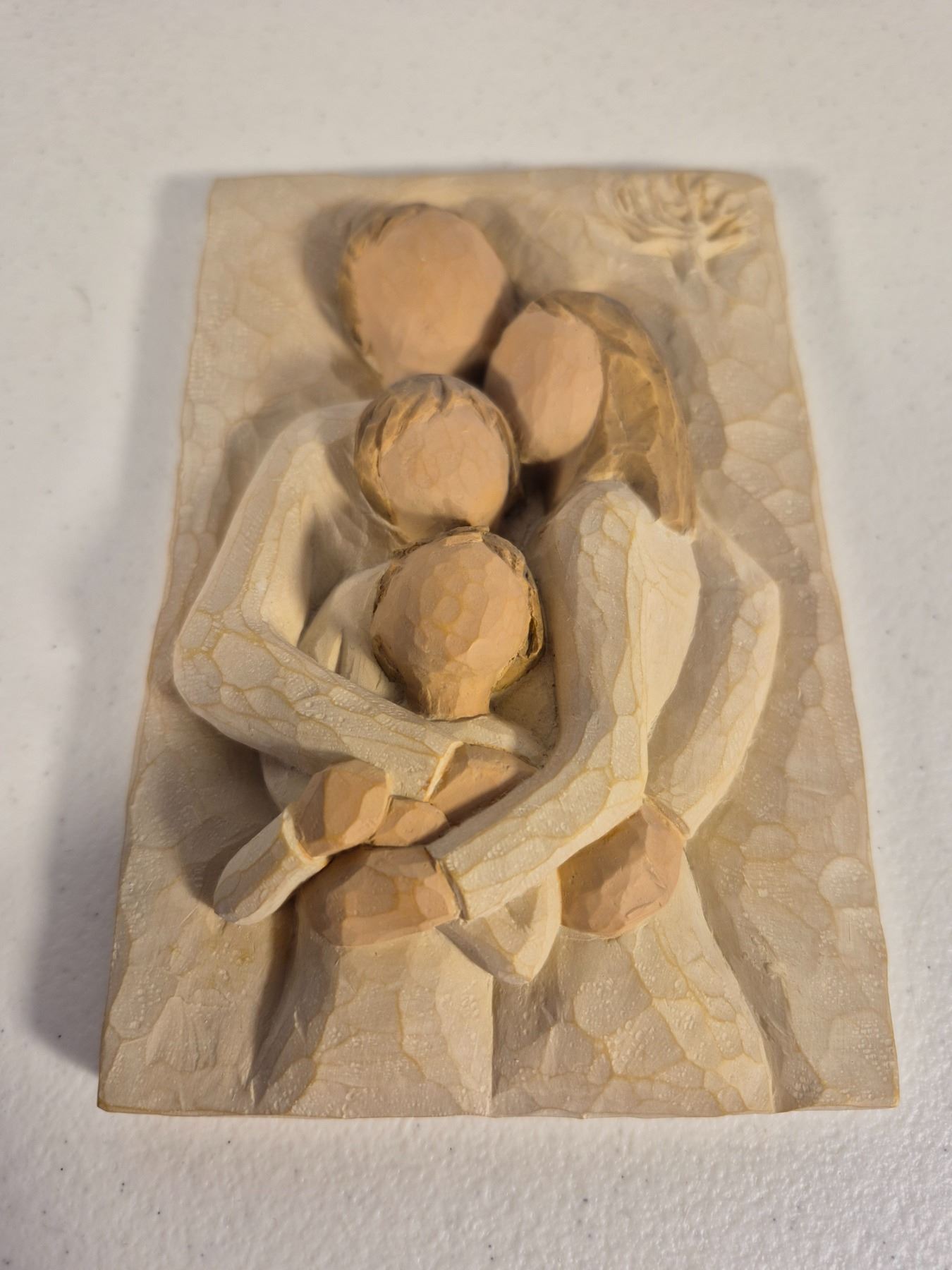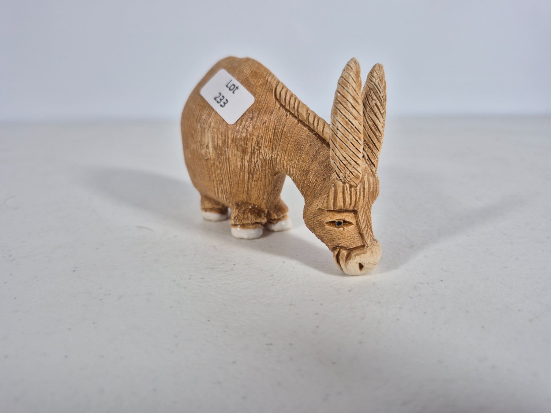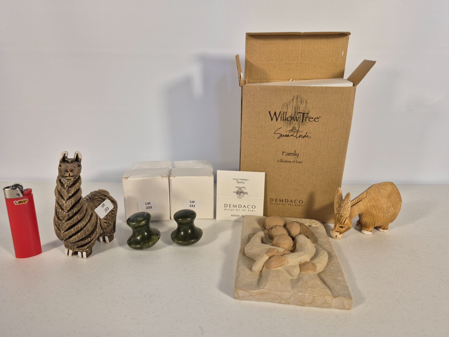 Assorted lot including Willow Tree Family figurine with box, two green soapstone carvings, and animal figures (llama and donkey). Variety of decorative and collectible items.