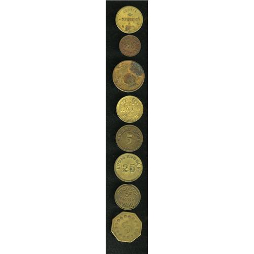 <B>Lot of Eight Merchant Tokens.</B></I> A group of assorted tokens, including several from bars and at least one from a bakery. Personal inspection is recommended.