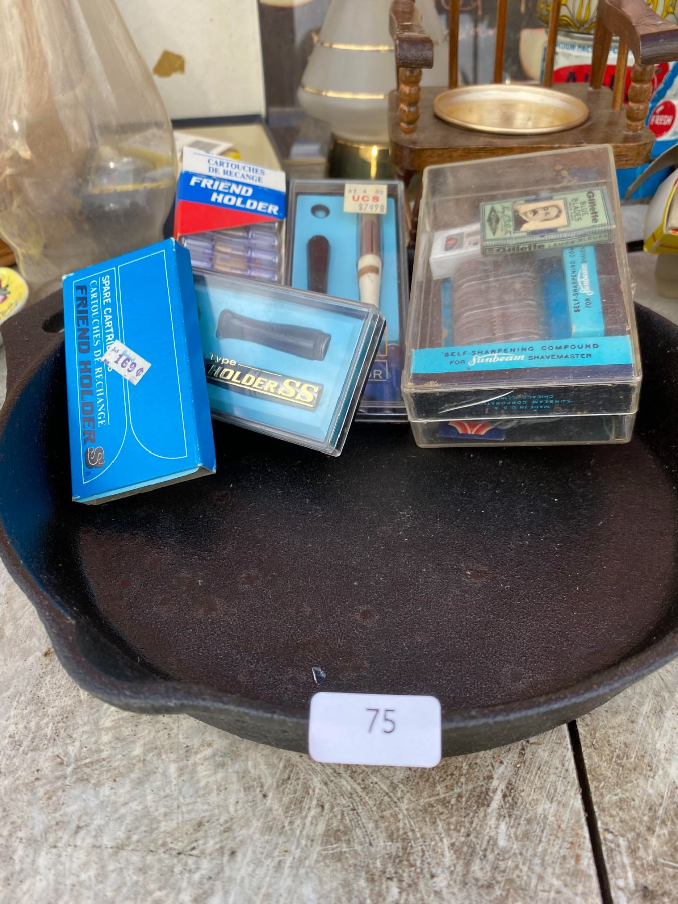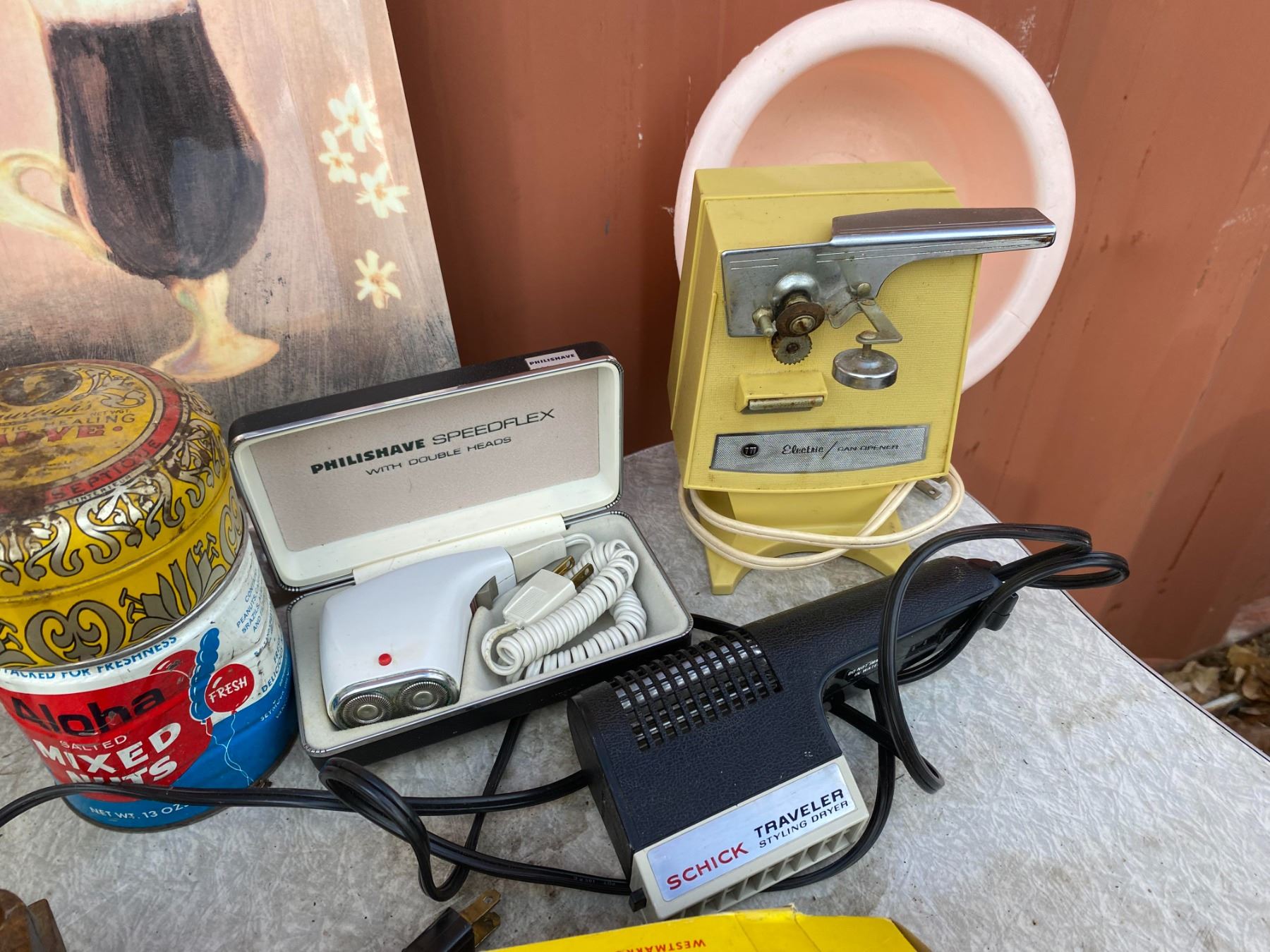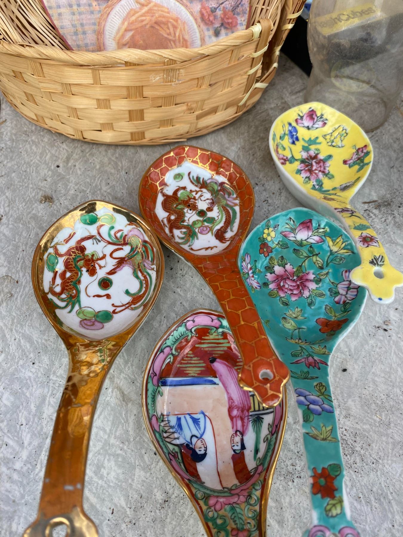 Large assorted household lot including baskets, decor trays, lamp, vintage tools, Asian-style spoon rests, kitchen gadgets, and cast iron pan. Great reseller bundle.