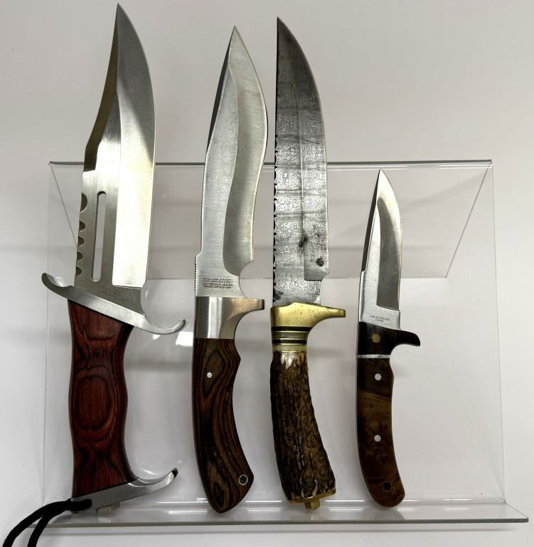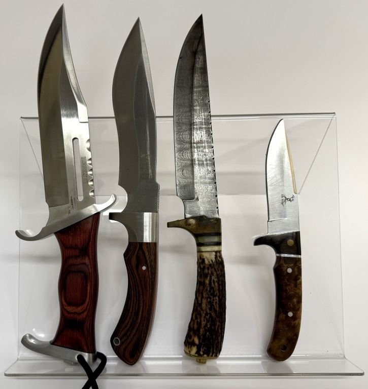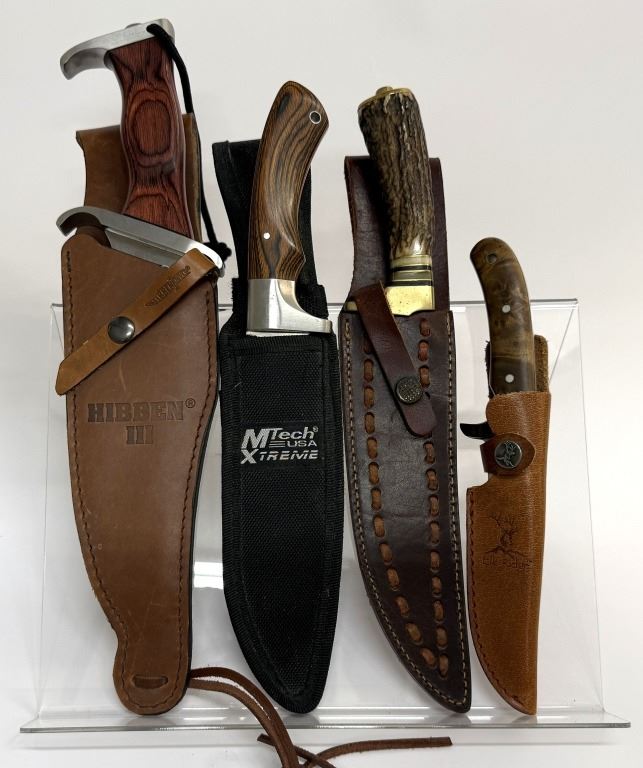 Item/Description: Four knives with stainless steel blades, wood/composite handles, and leather sheaths. Includes Hibben and M-Tech brands.