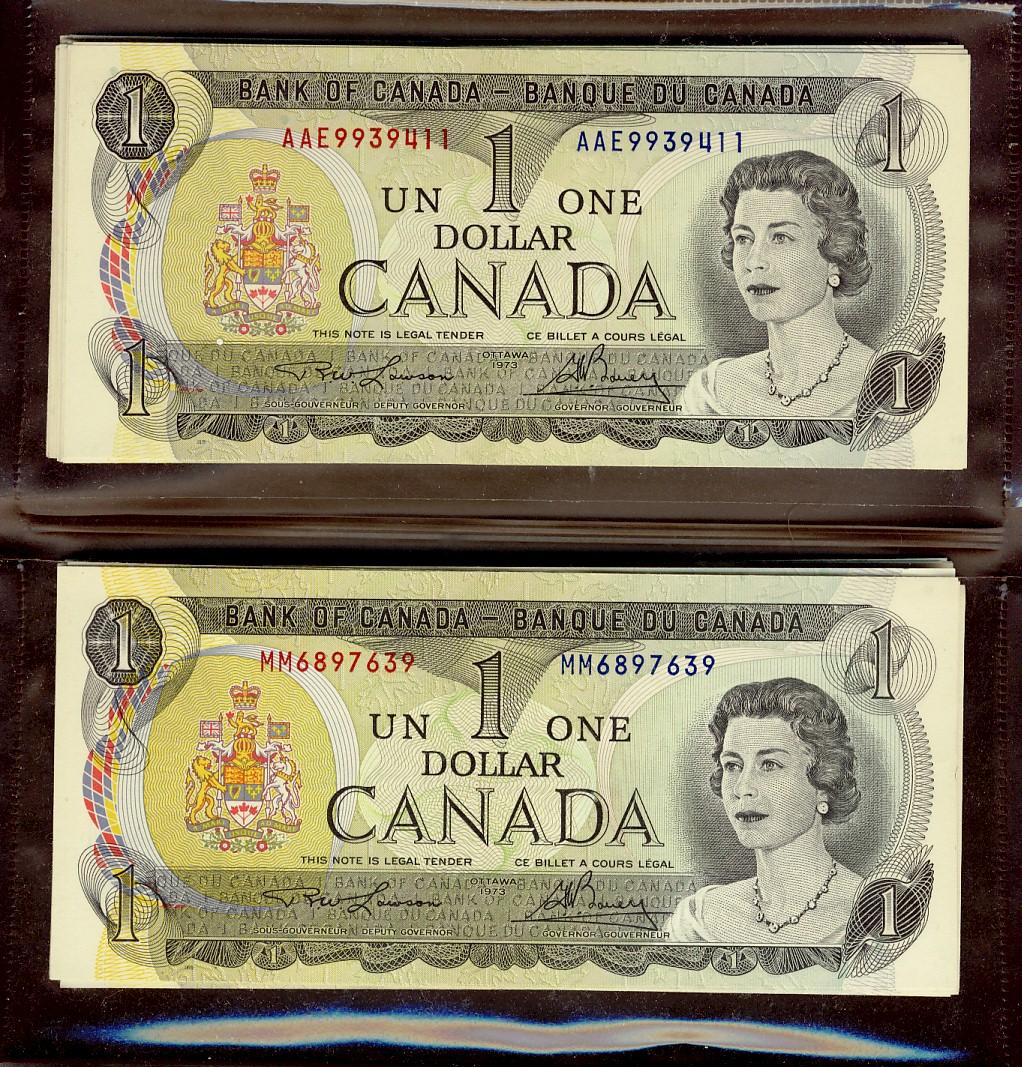 Mixed Lot, Bank of Canada issues, includes 1973 $1 BC-46a(69), 1974 $2 BC-47a(2), 1979 $5 BC-53a(2). Notes Grade AU to UNC, mainly in UNC.