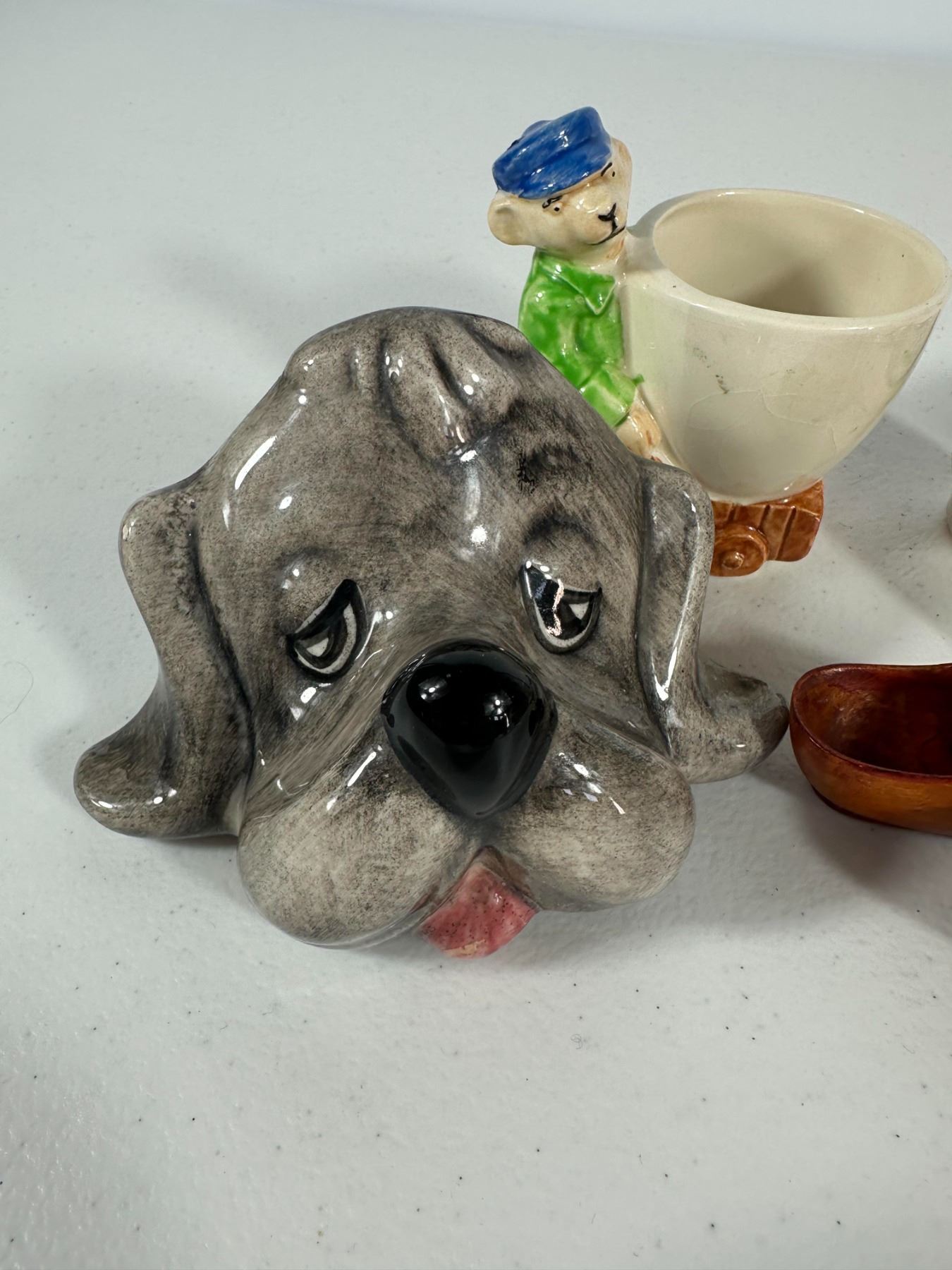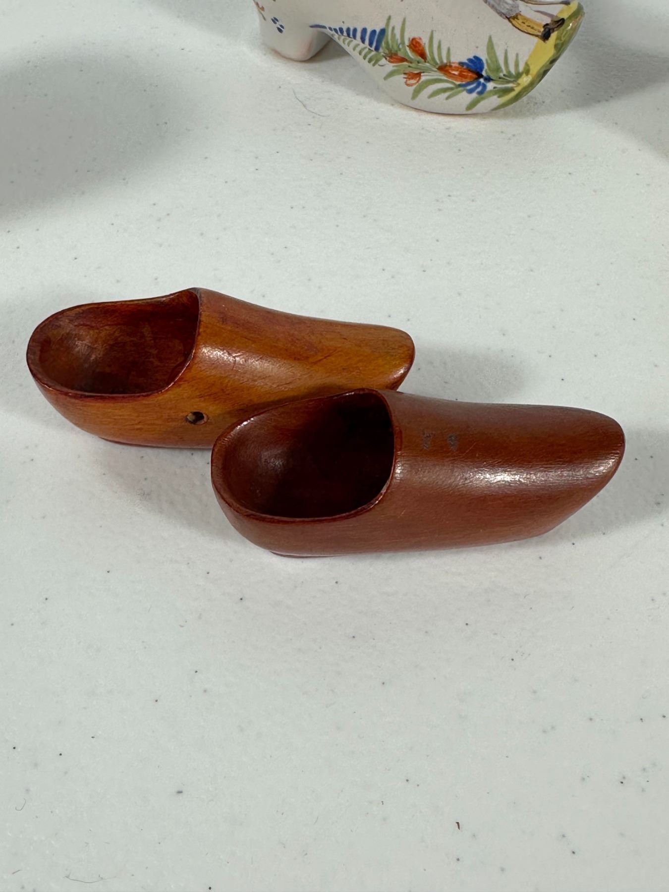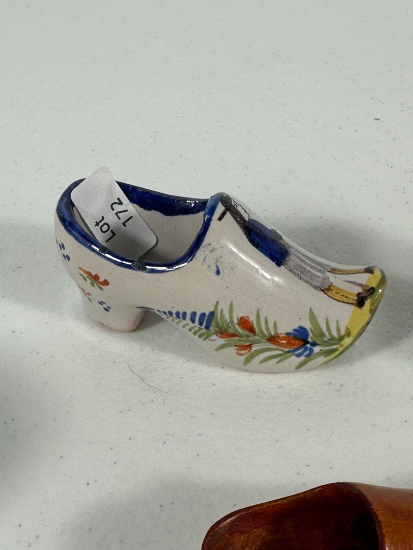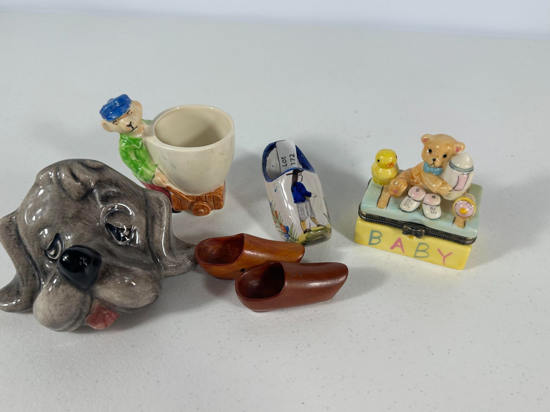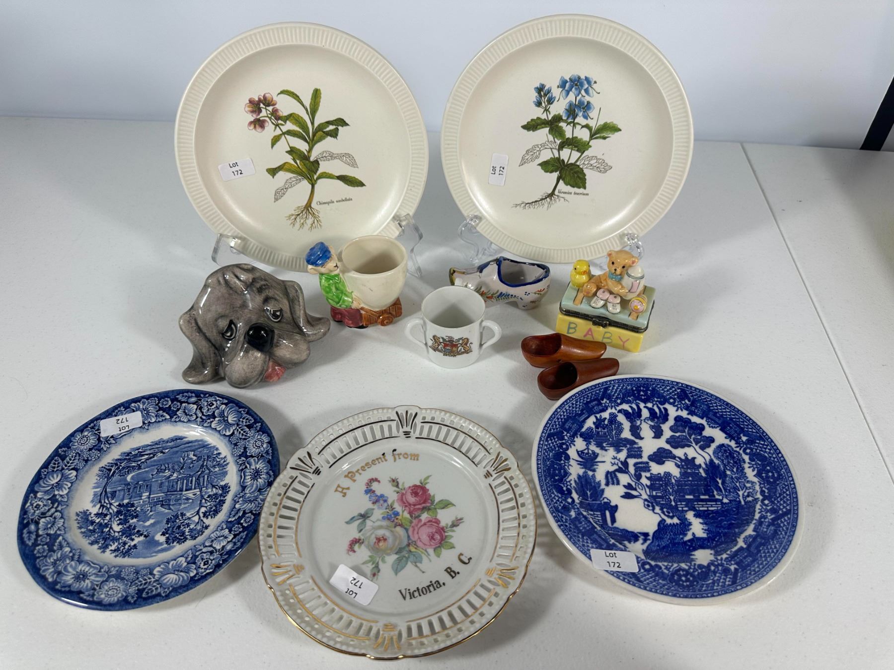 Two botanical print plates, two blue transferware plates, “Present from Victoria, B.C.” souvenir plate, ceramic dog head, small novelty figurines, miniature mugs, and carved wooden shoes.