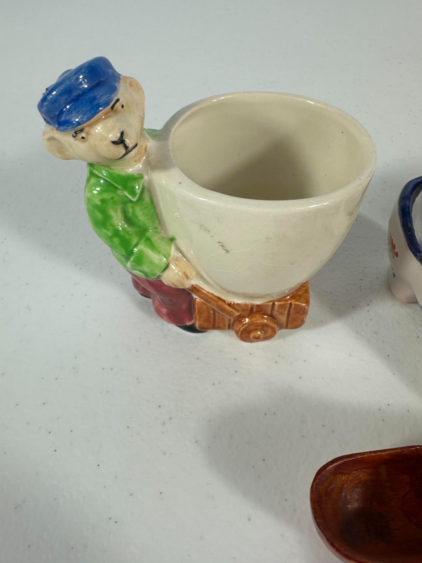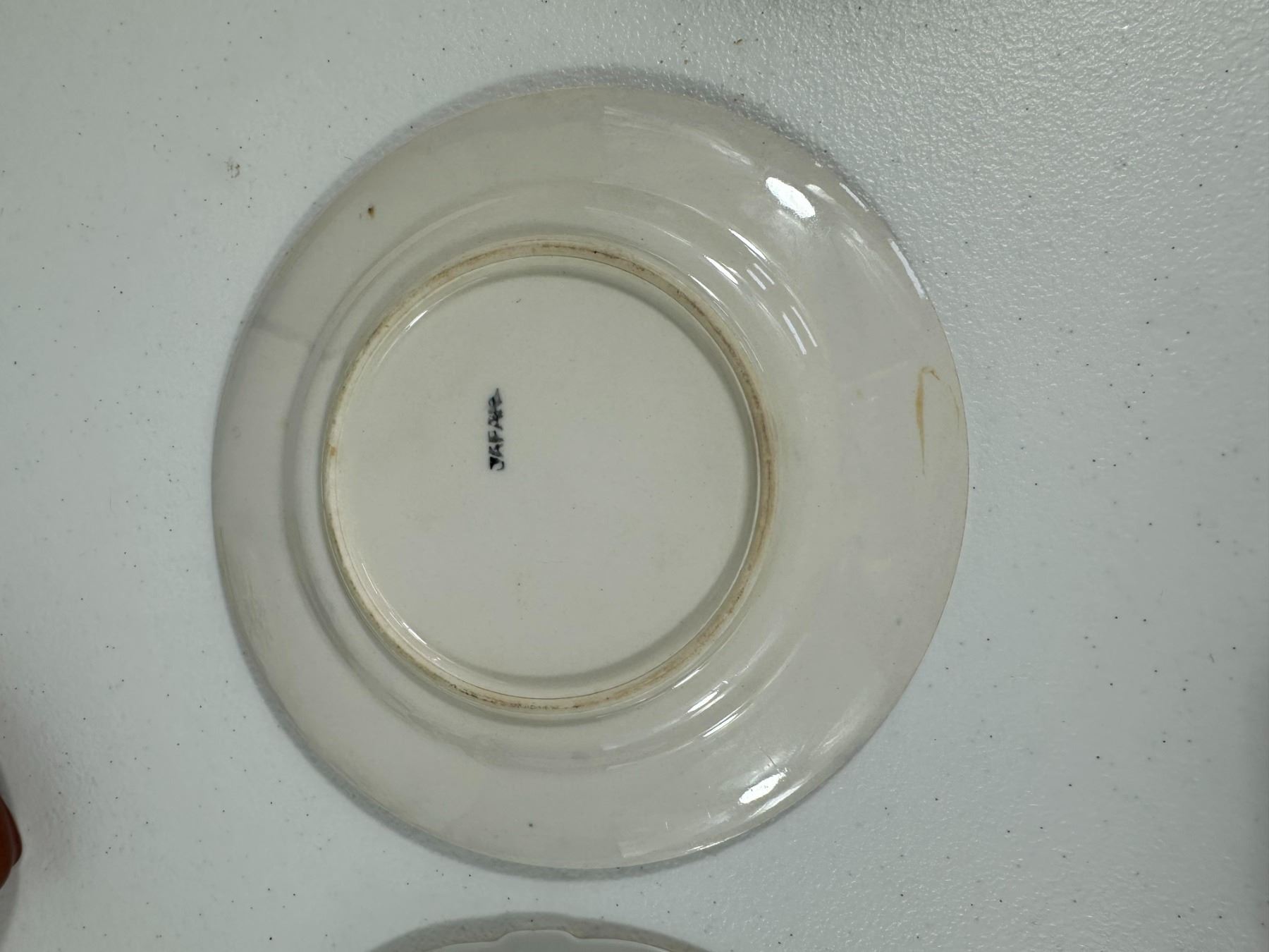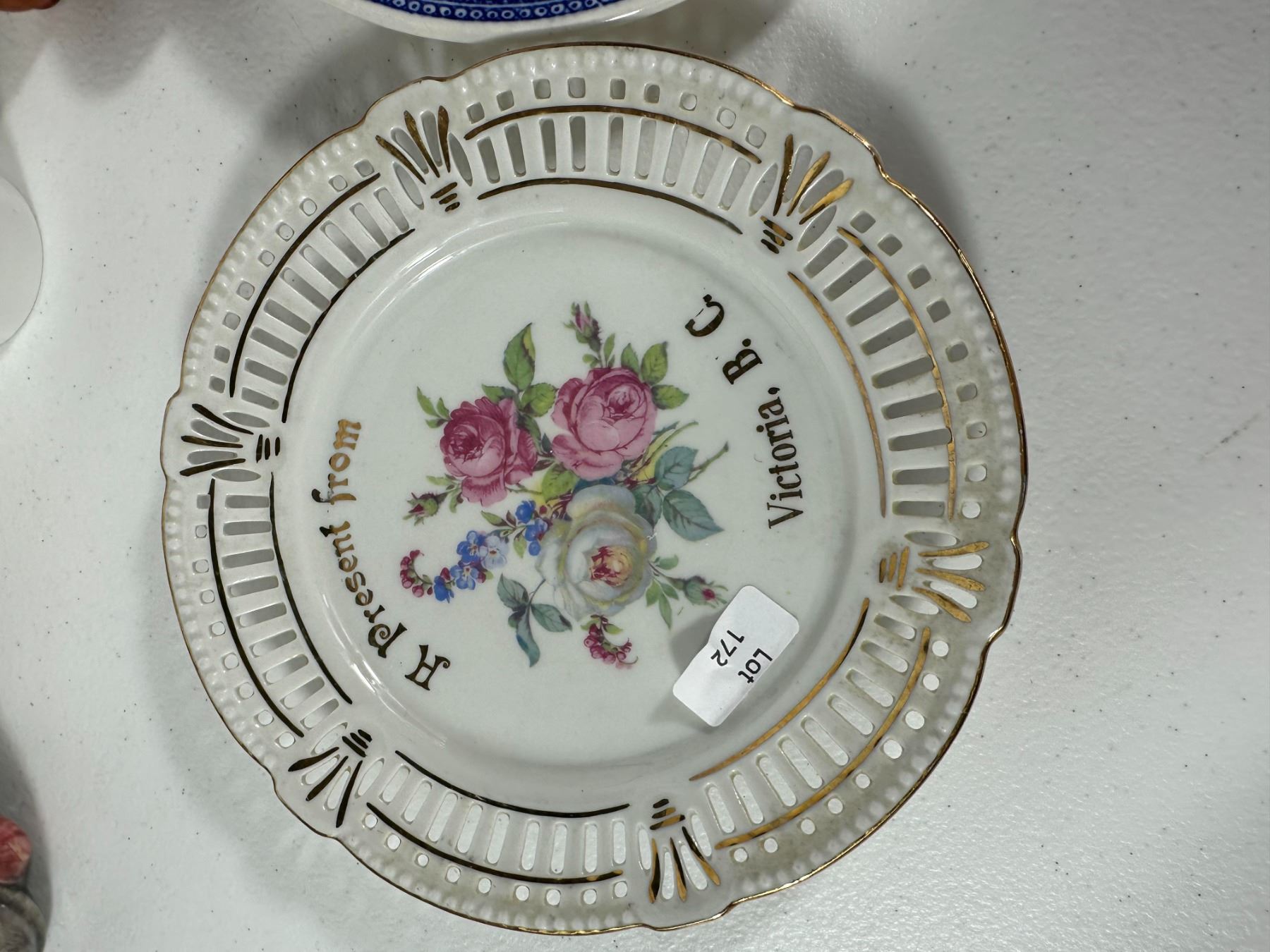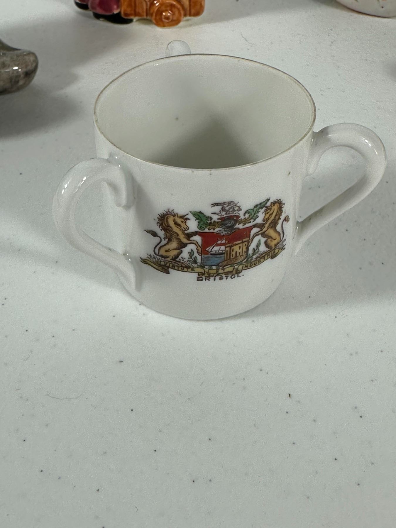 Two botanical print plates, two blue transferware plates, “Present from Victoria, B.C.” souvenir plate, ceramic dog head, small novelty figurines, miniature mugs, and carved wooden shoes.