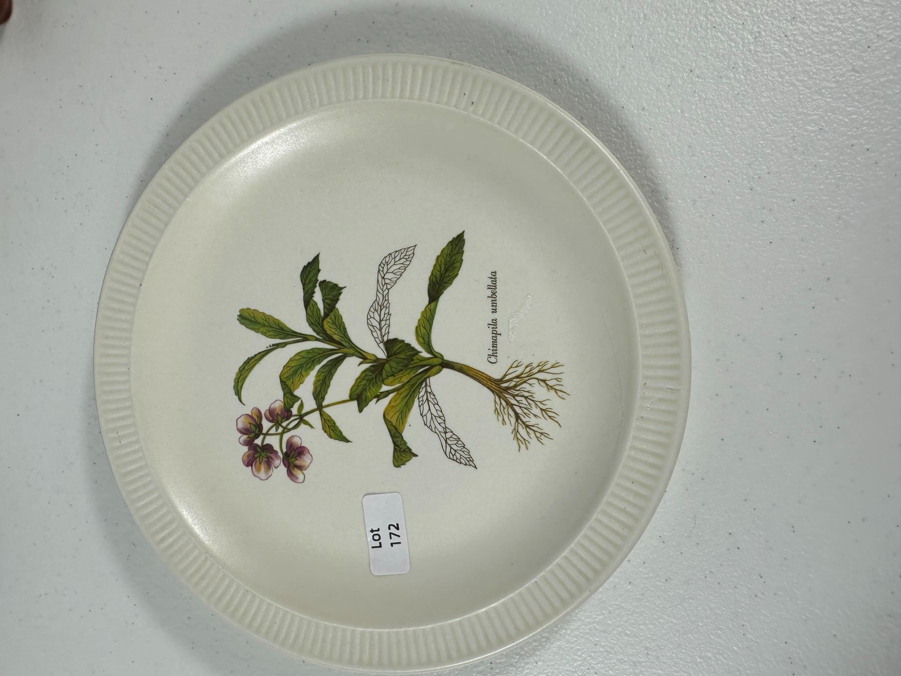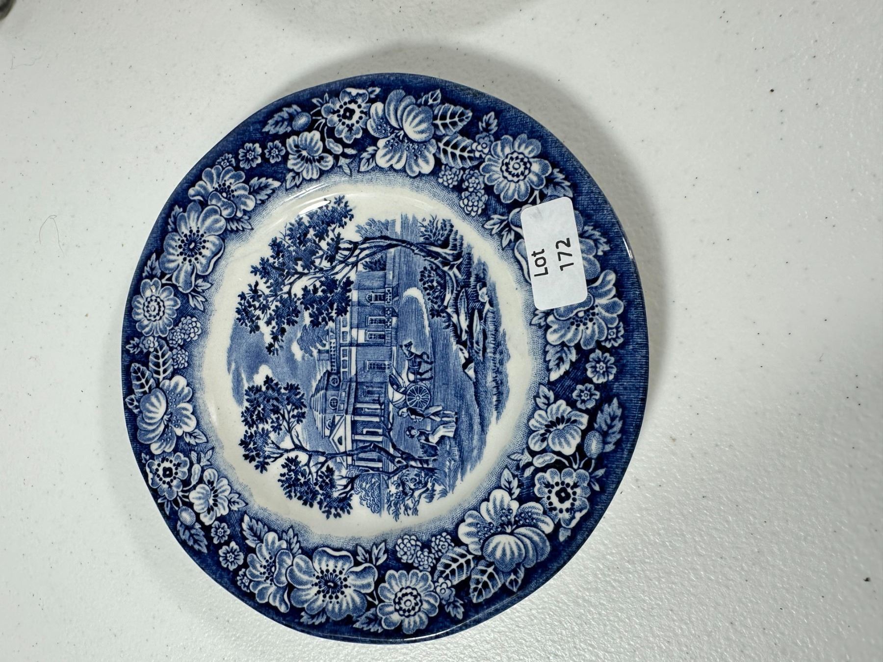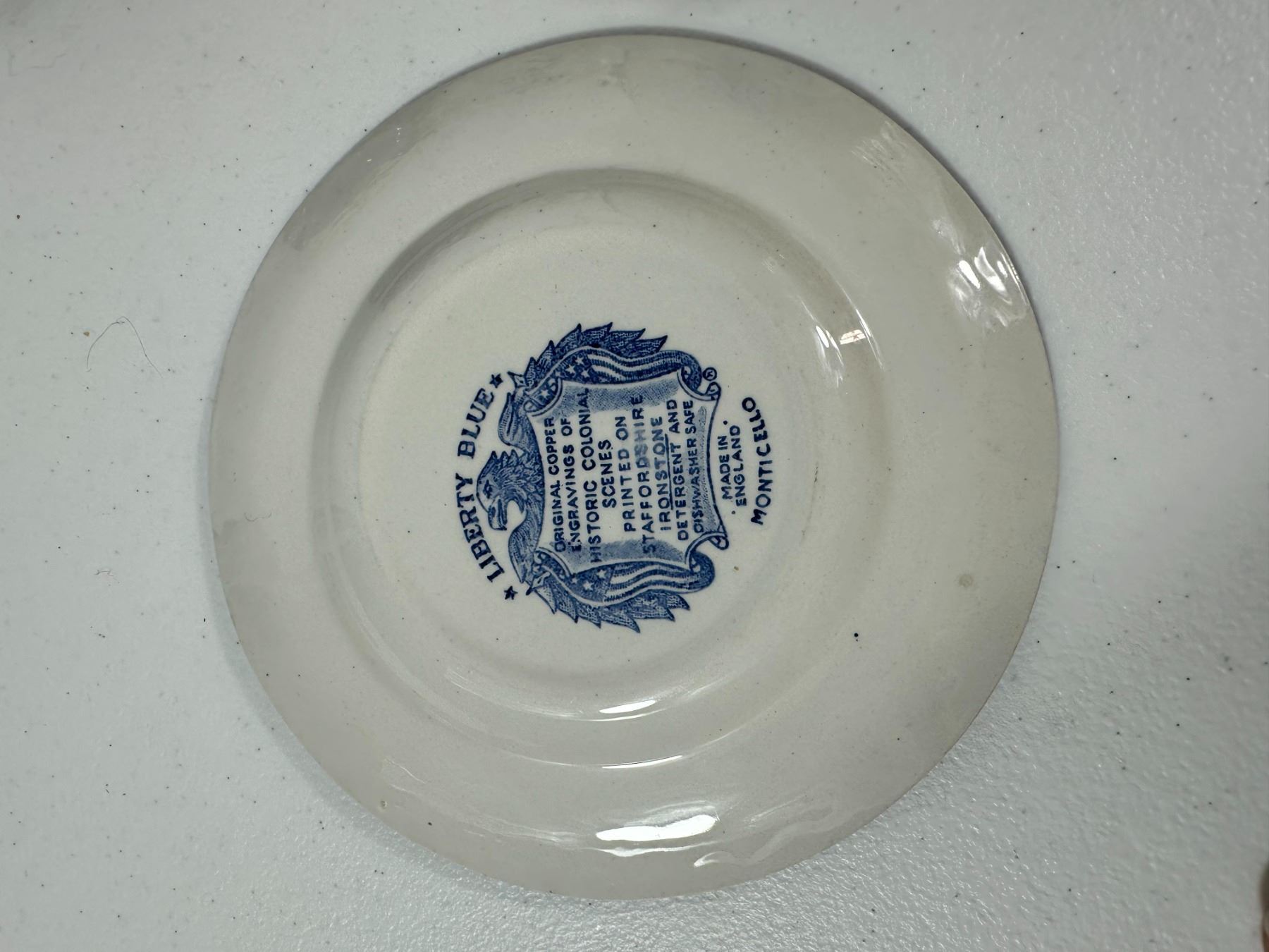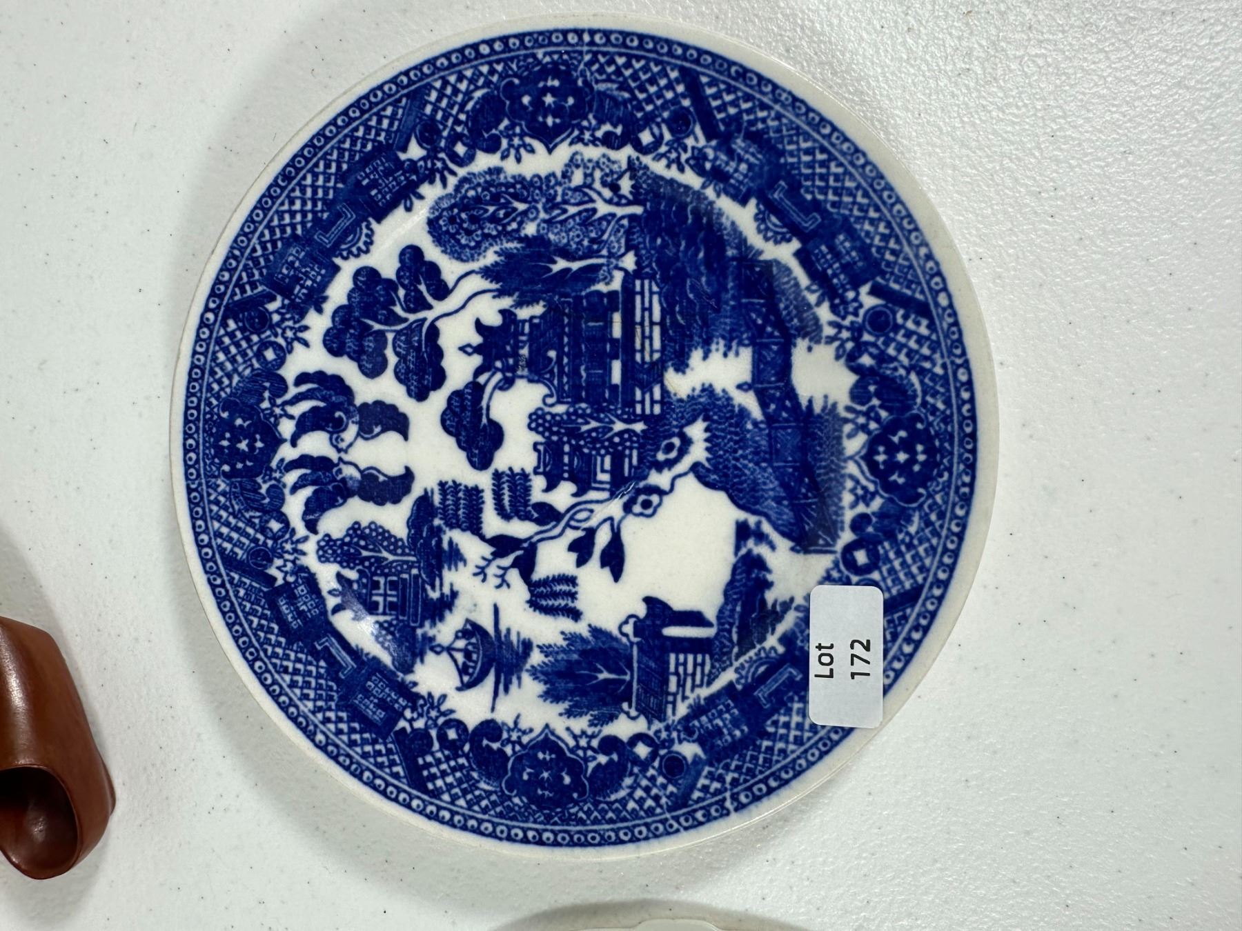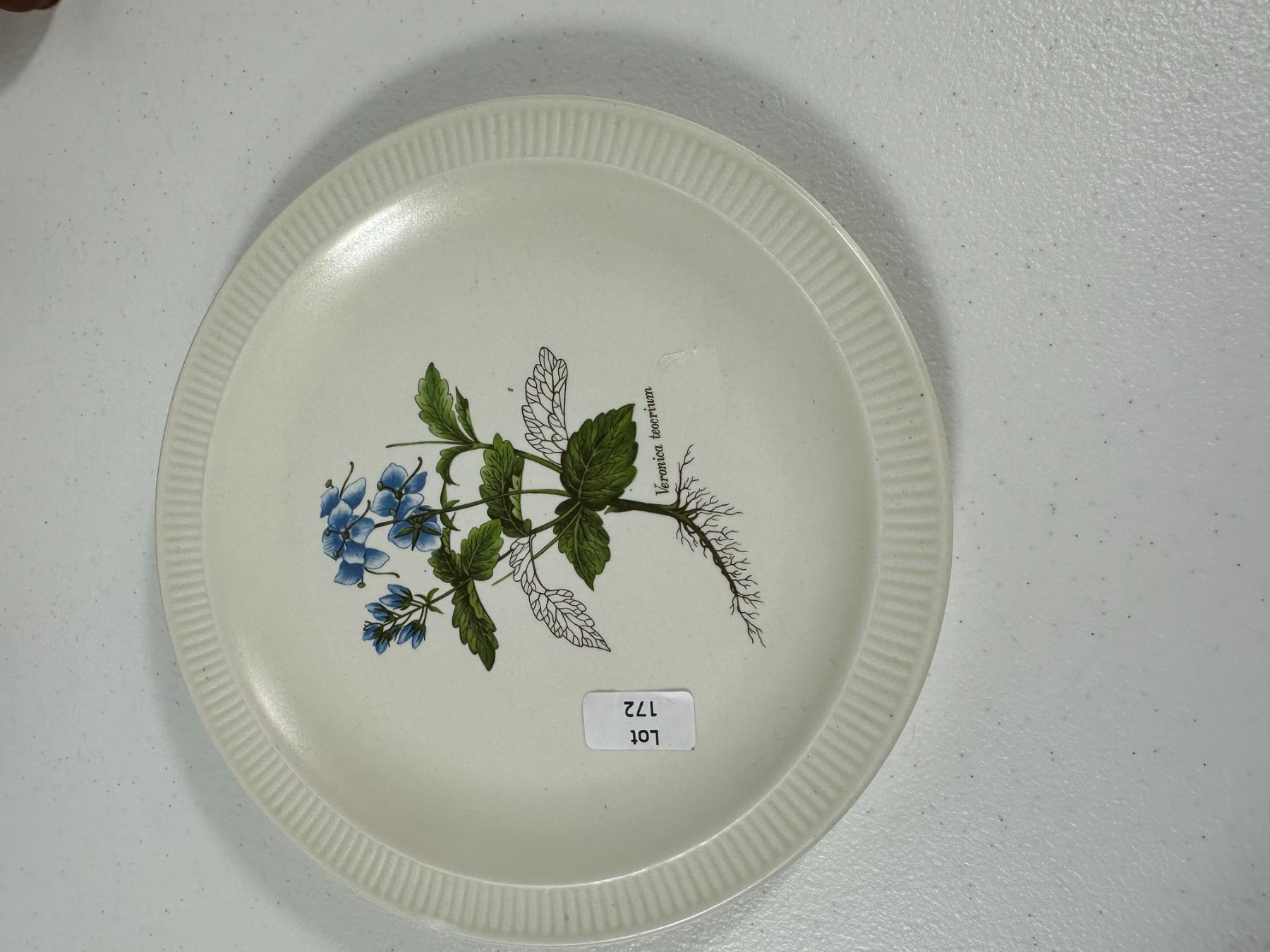 Two botanical print plates, two blue transferware plates, “Present from Victoria, B.C.” souvenir plate, ceramic dog head, small novelty figurines, miniature mugs, and carved wooden shoes.