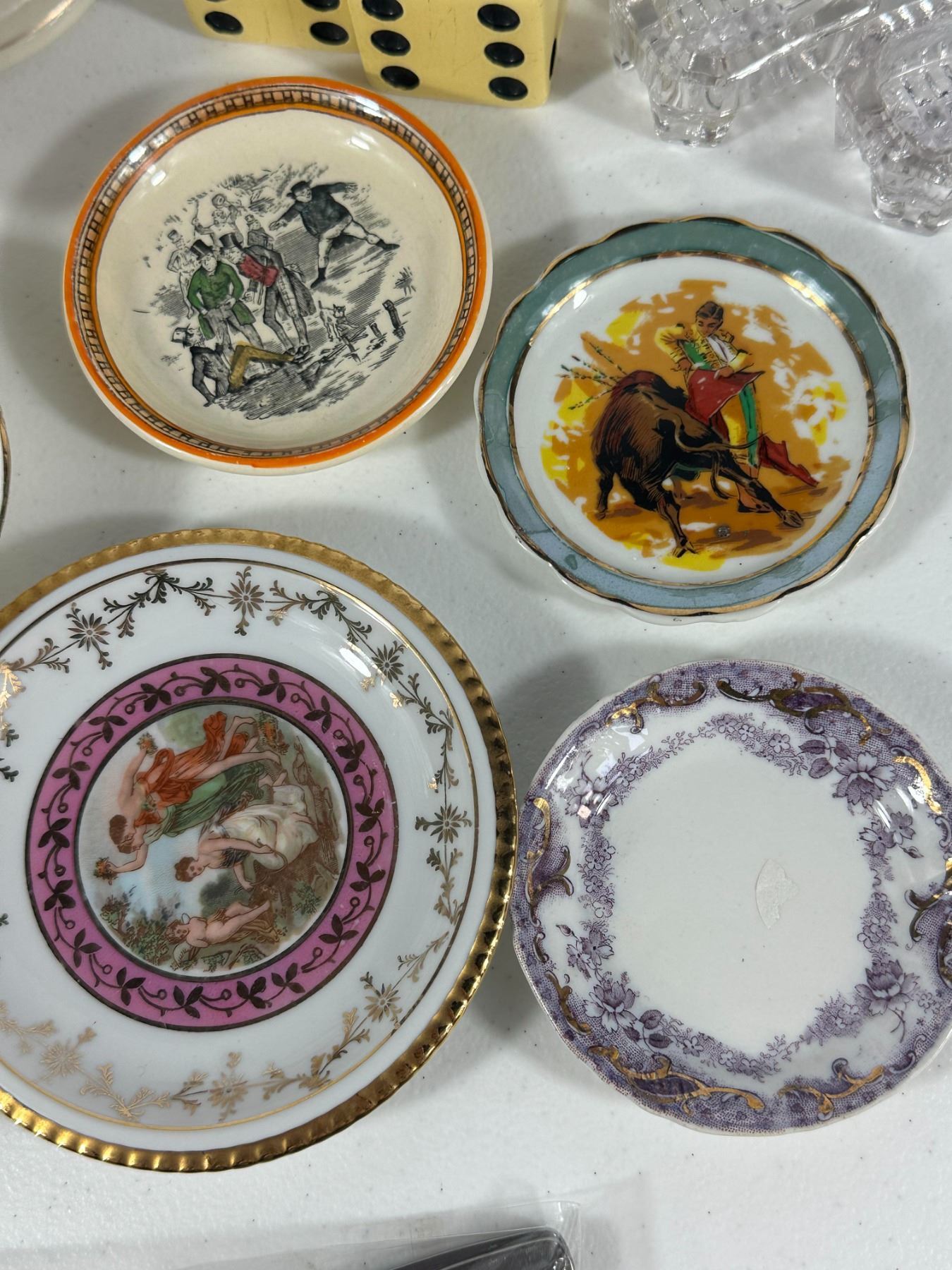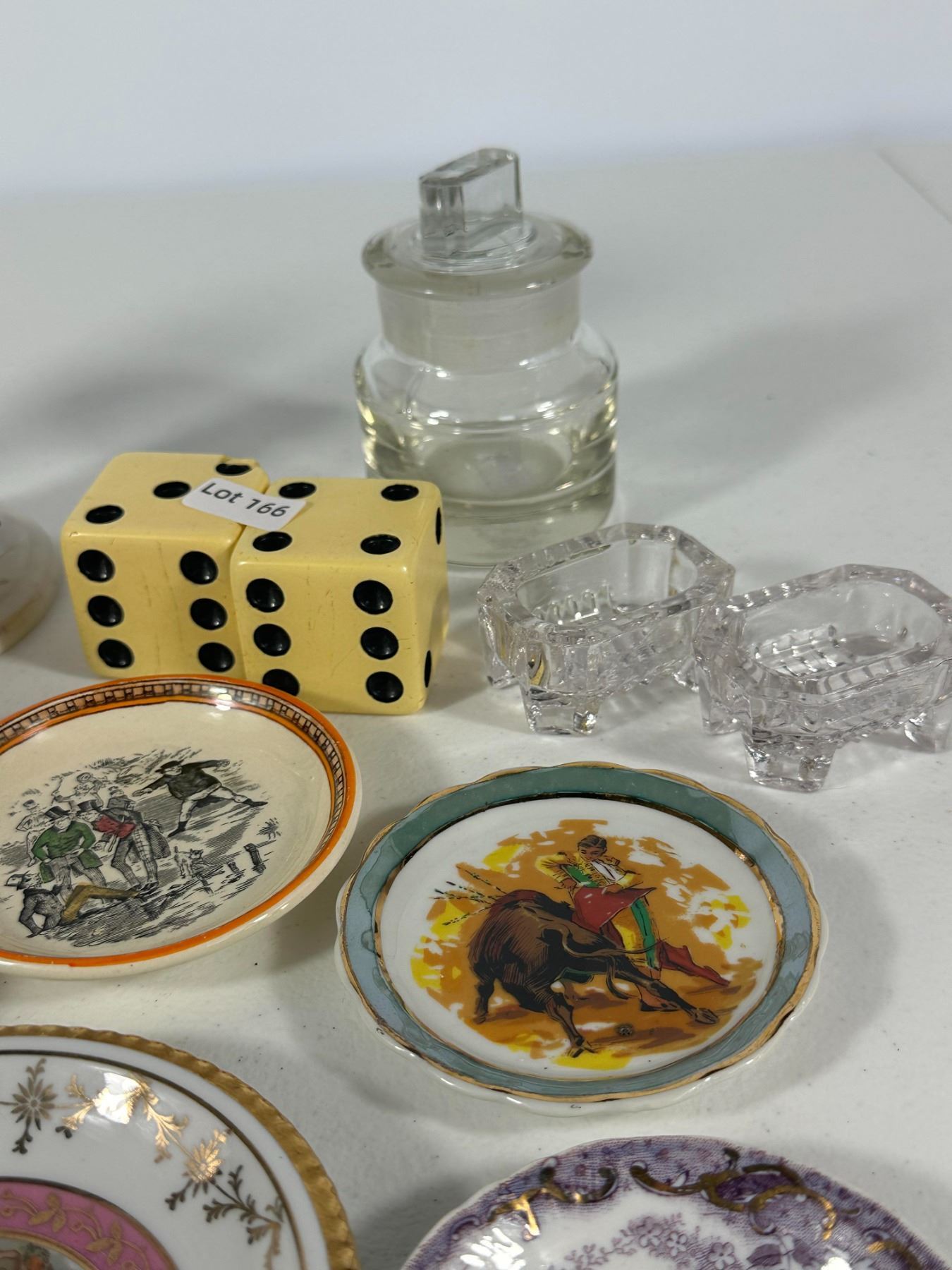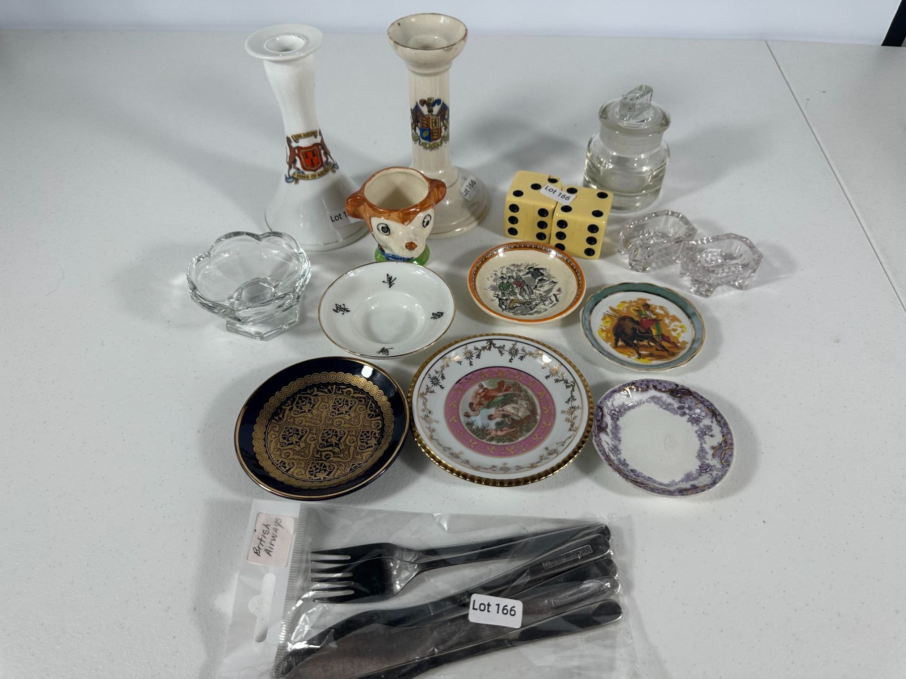 Assorted small decorative plates, two souvenir candlesticks, Bakelite Oversized Dice, glass lidded jar, crystal dishes, deer‑head novelty cup, and sealed stainless flatware.