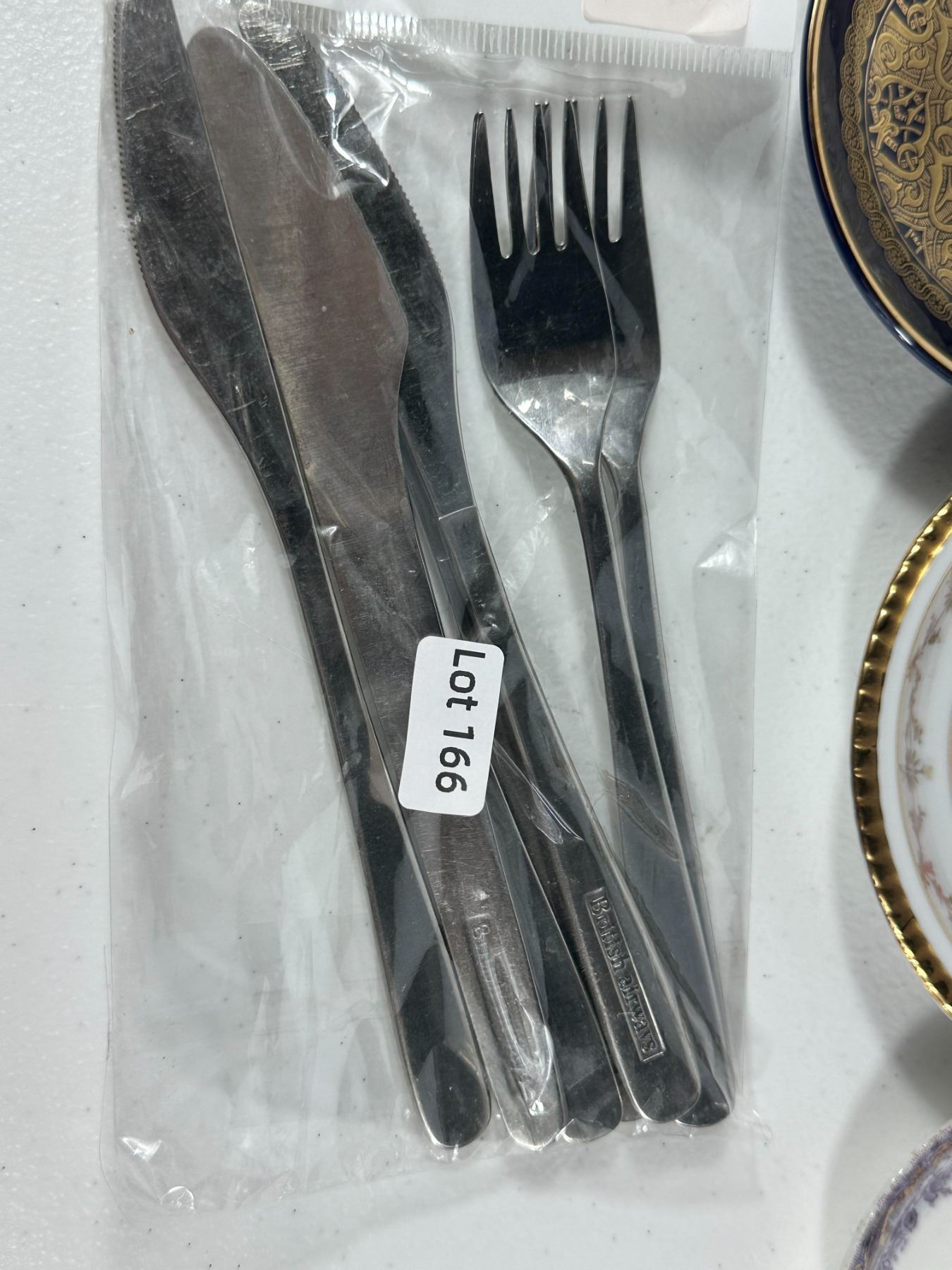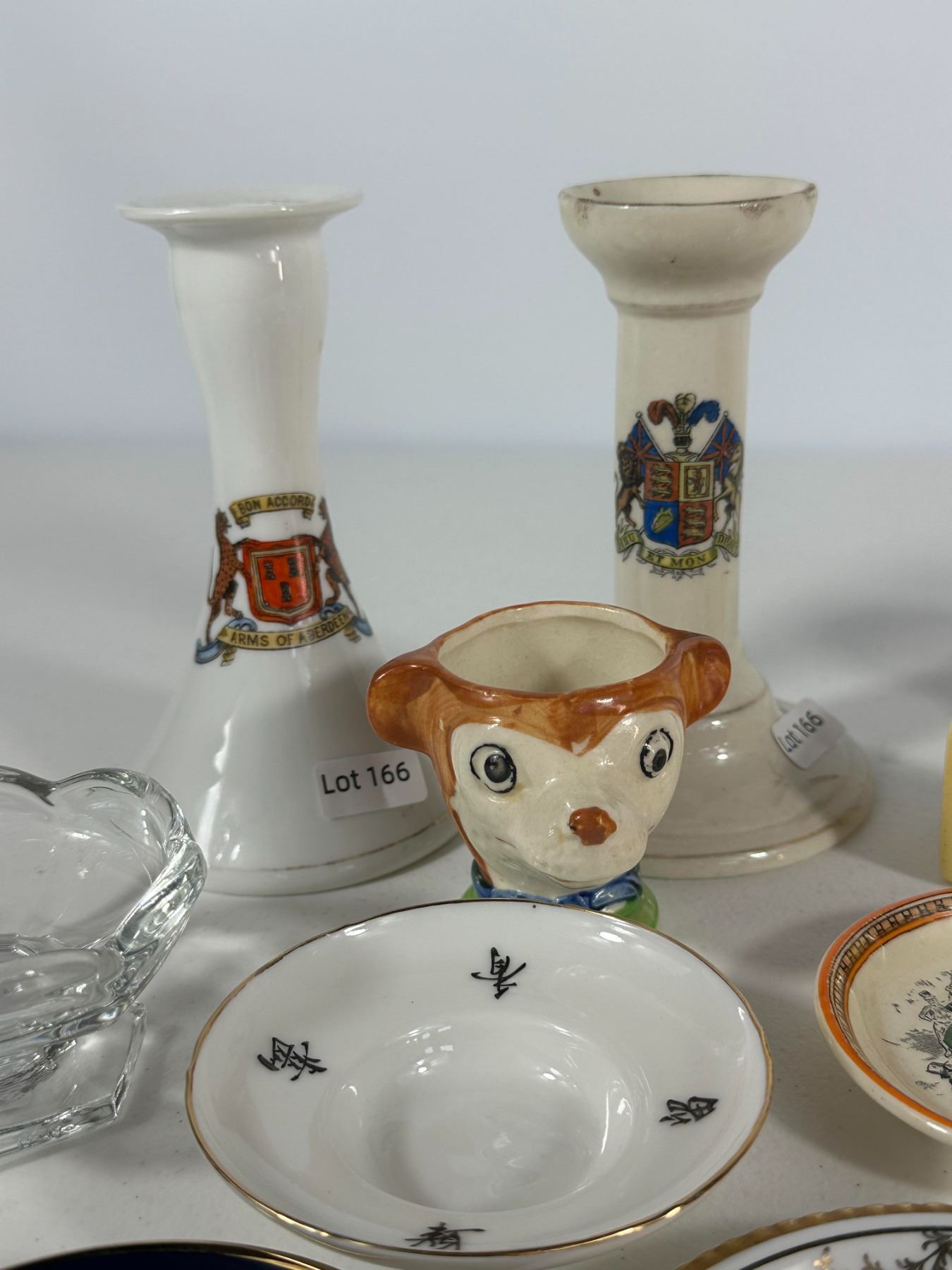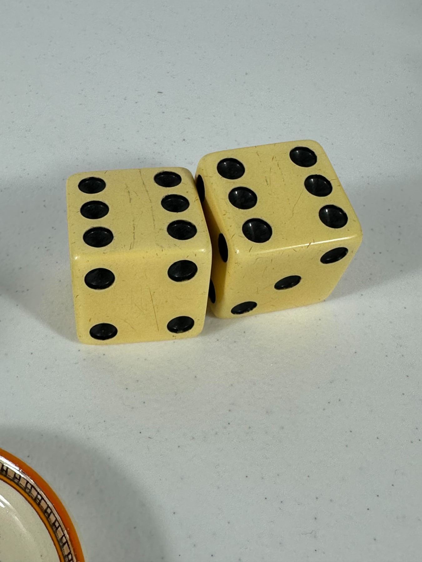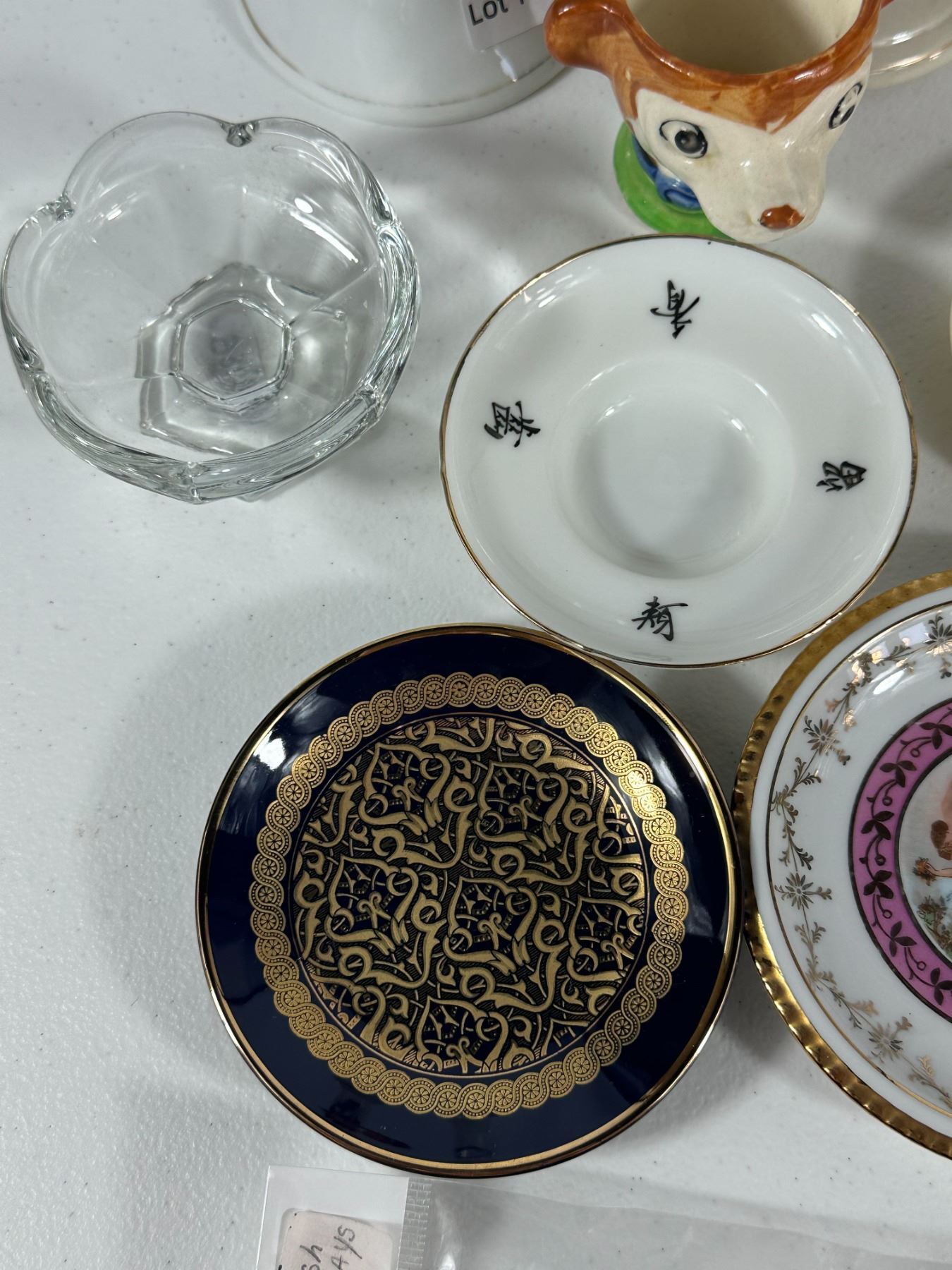 Assorted small decorative plates, two souvenir candlesticks, Bakelite Oversized Dice, glass lidded jar, crystal dishes, deer‑head novelty cup, and sealed stainless flatware.