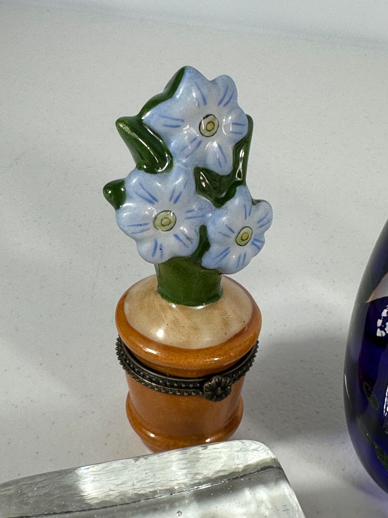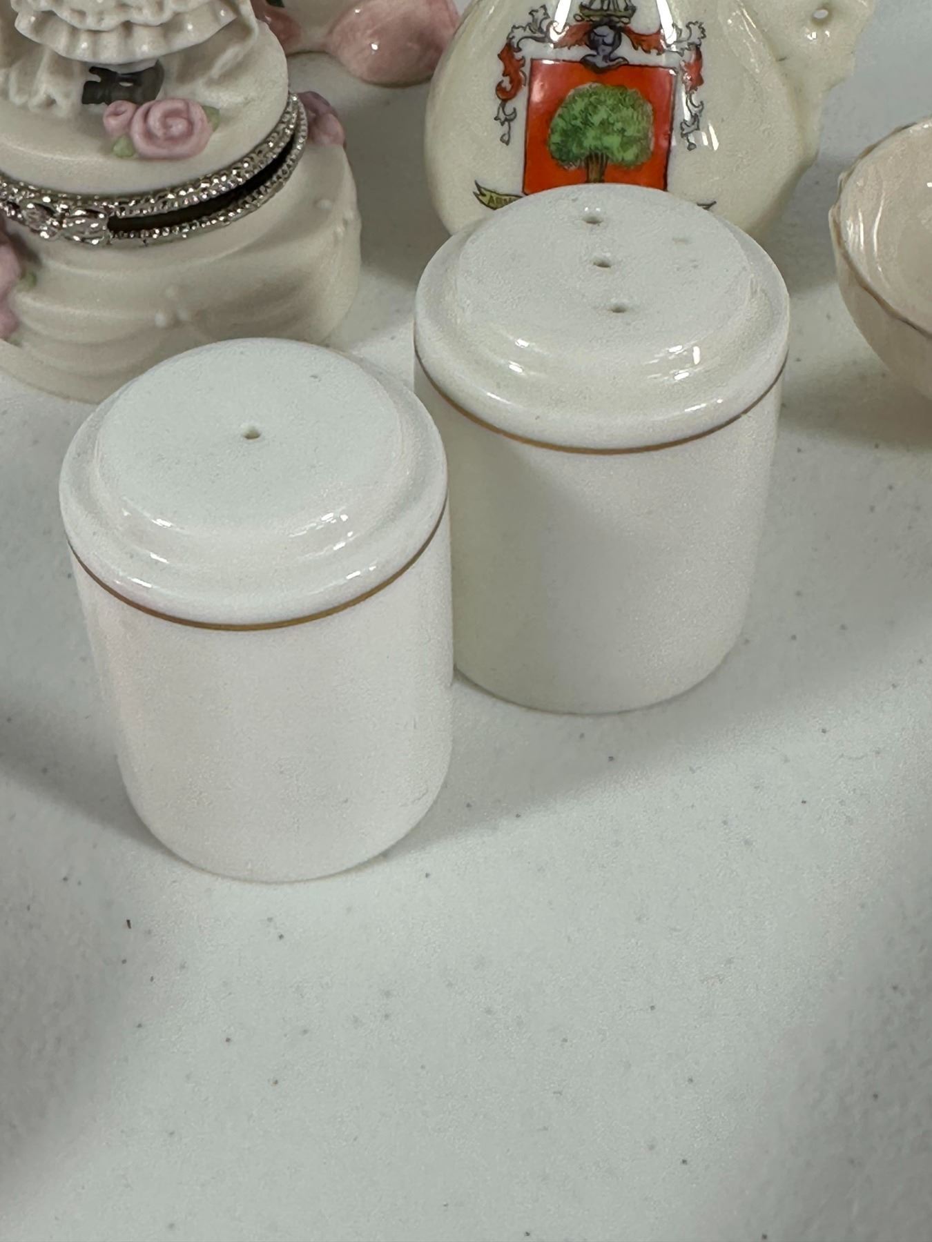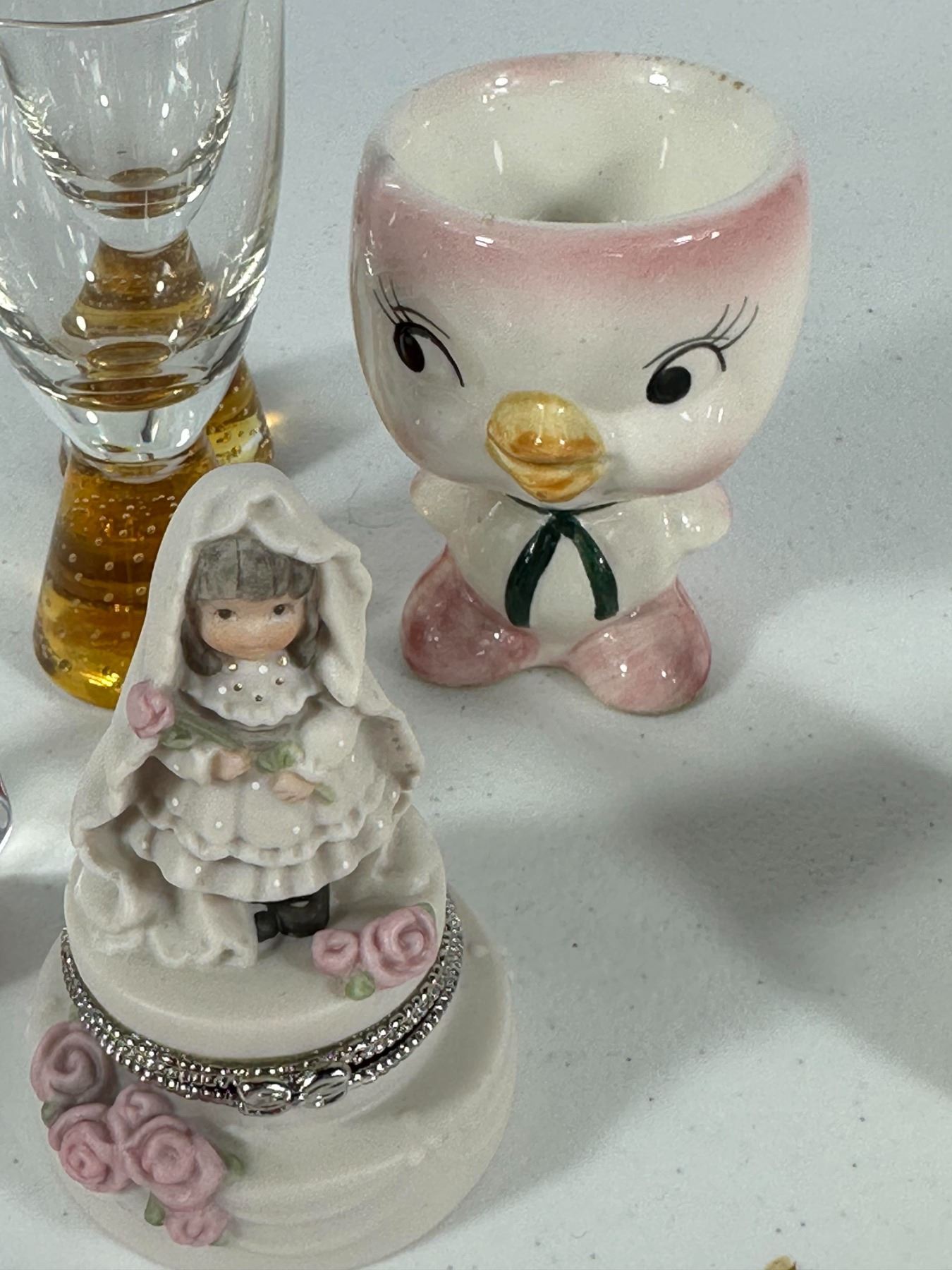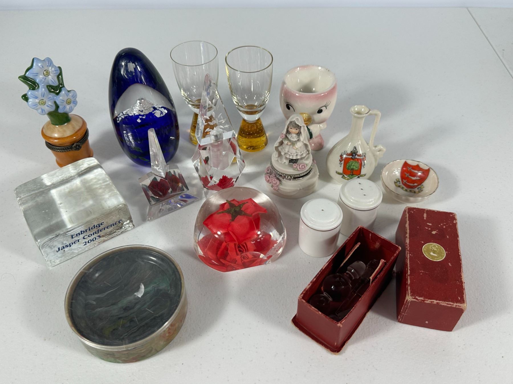 Several glass paperweights (heart‑shaped, prism cut, and souvenir), pair of small stemmed glasses, ceramic figurines, novelty egg cup, salt and pepper shakers, lidded trinket box, miniature cruets in original box, and other small collectibles.