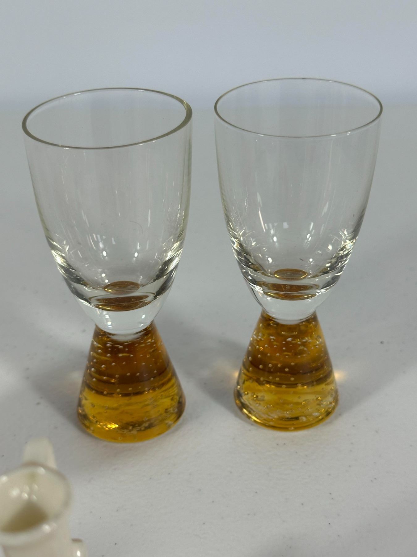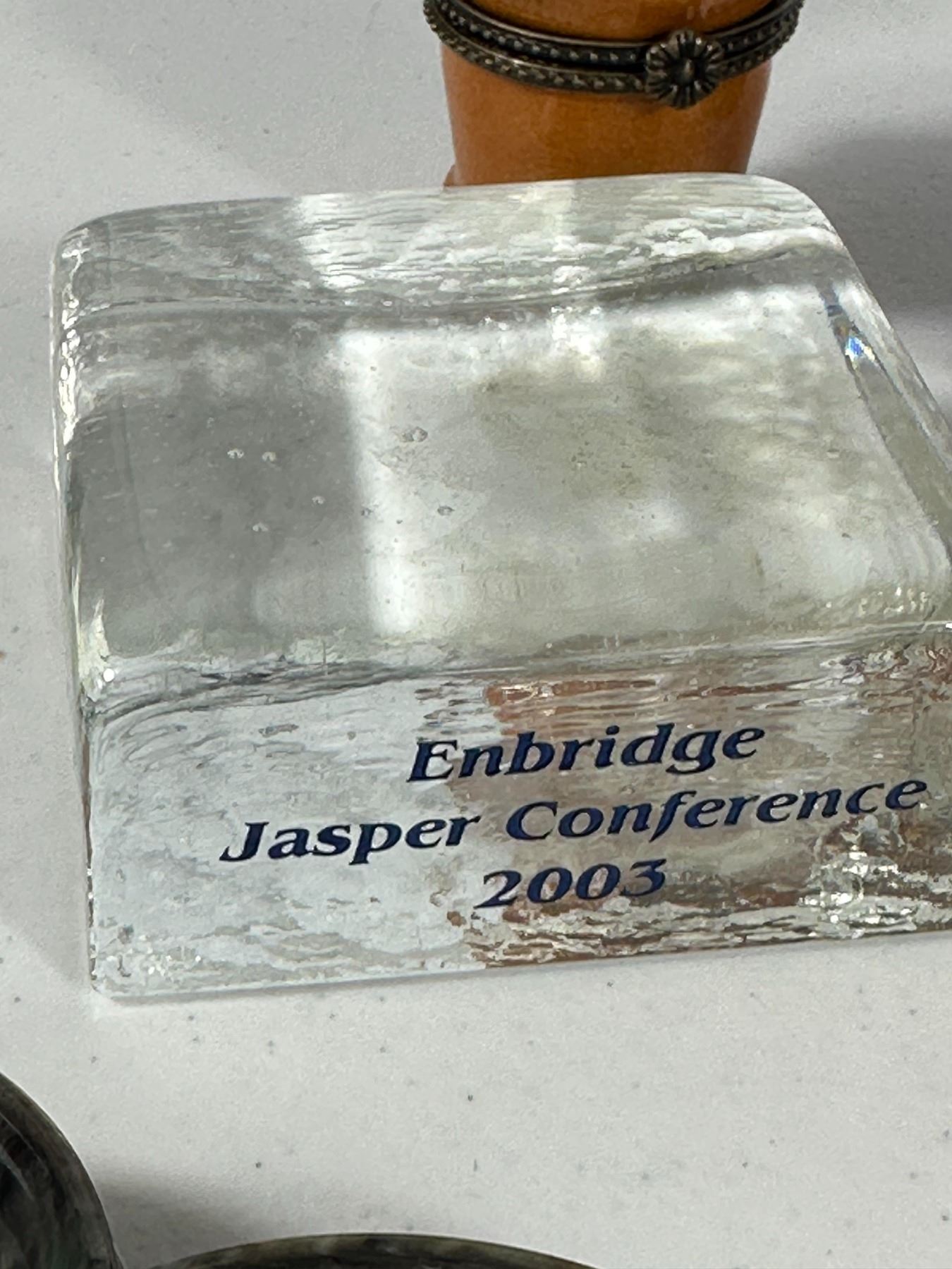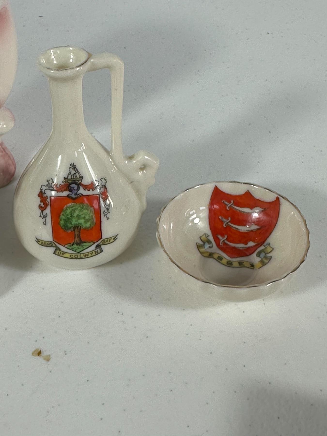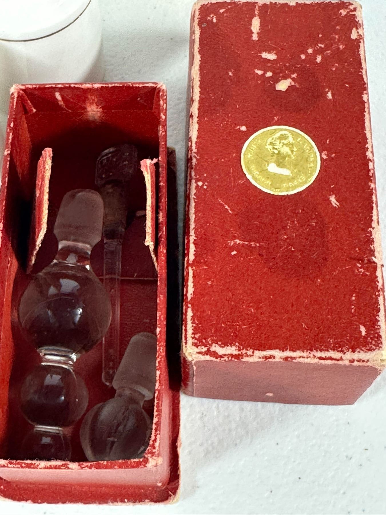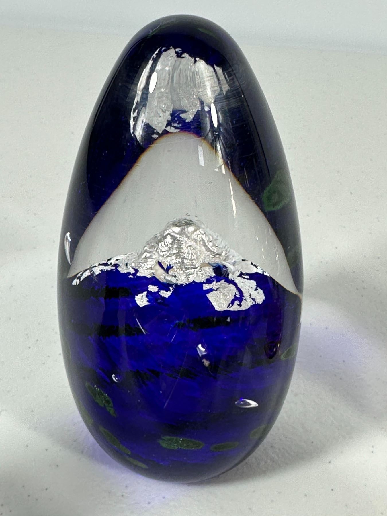 Several glass paperweights (heart‑shaped, prism cut, and souvenir), pair of small stemmed glasses, ceramic figurines, novelty egg cup, salt and pepper shakers, lidded trinket box, miniature cruets in original box, and other small collectibles.
