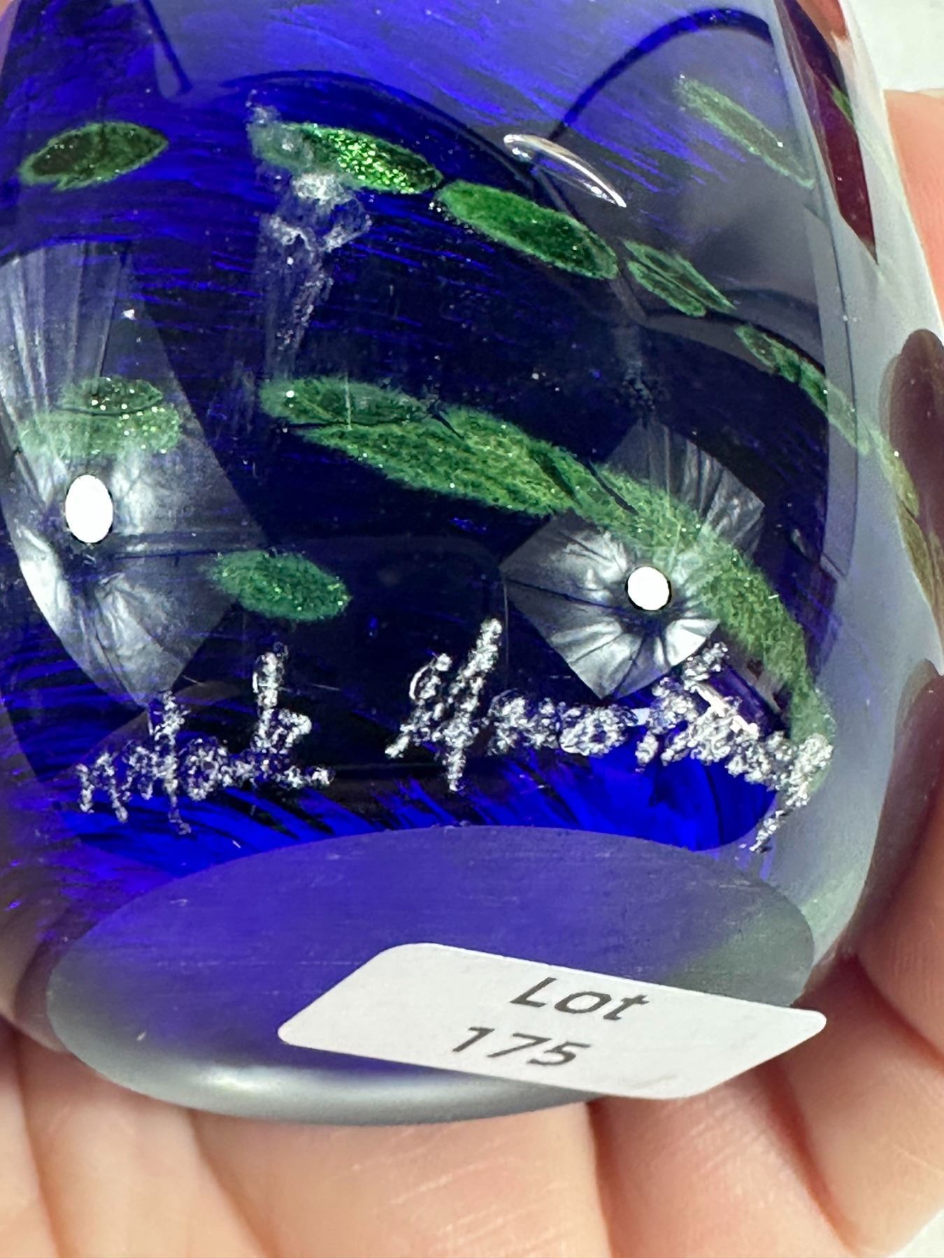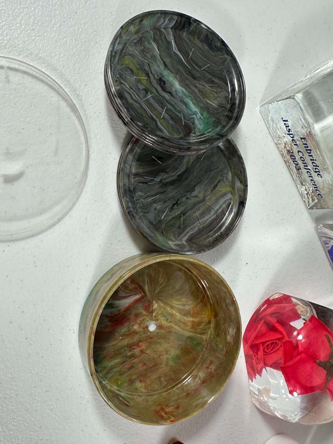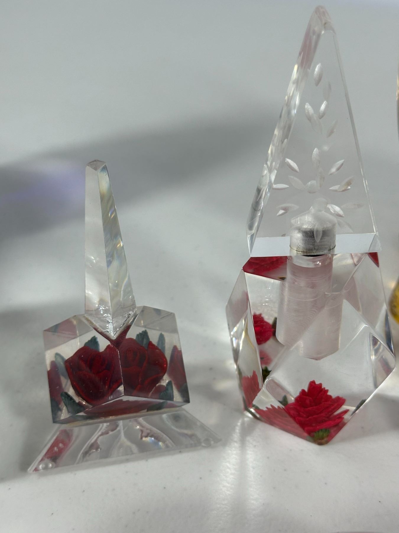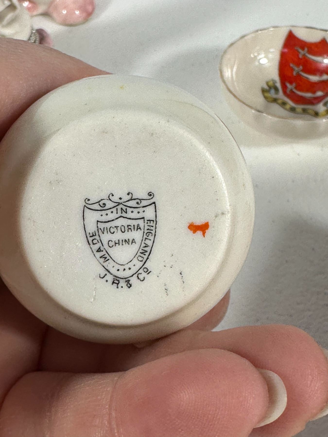 Several glass paperweights (heart‑shaped, prism cut, and souvenir), pair of small stemmed glasses, ceramic figurines, novelty egg cup, salt and pepper shakers, lidded trinket box, miniature cruets in original box, and other small collectibles.
