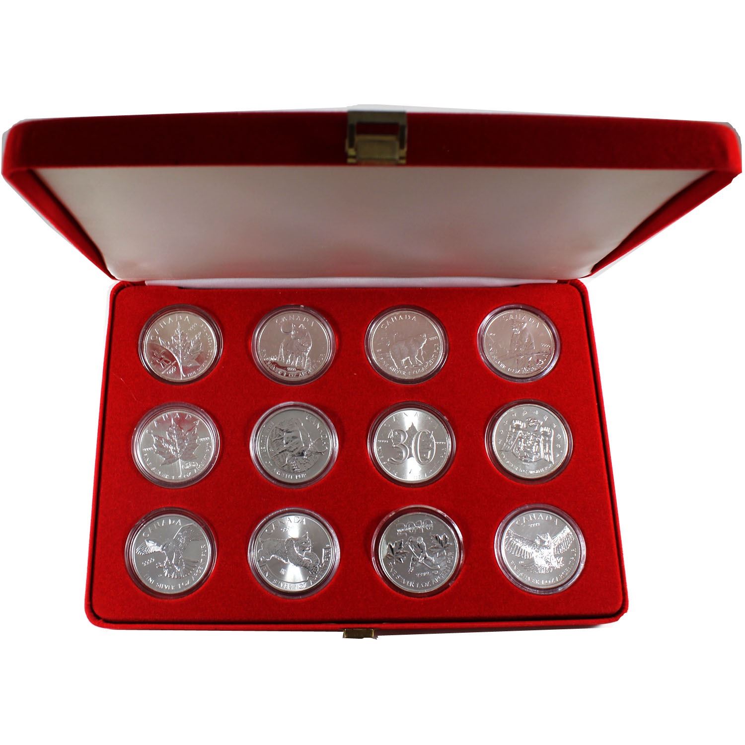 *Mixed Lot of 12x Canada 1oz Commemorative Silver Maple Leafs All Different Designs Encapsulated in Red Display Case. Includes Wildlife Series, Bird Predator Series & Olympic Designs (Some coins may be toned). 12pcs (TAX Exempt)