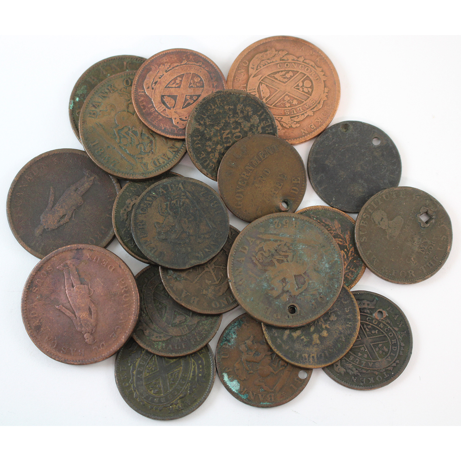INCLUDES: 1844 Half Penny Montreal, 1852 & 1857 One Penny Bank of Upper Canada and More!! Please check images for variety. Sold as is. 20pcs.