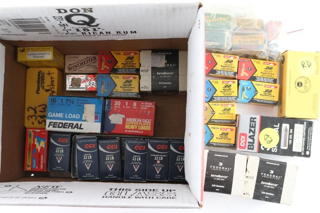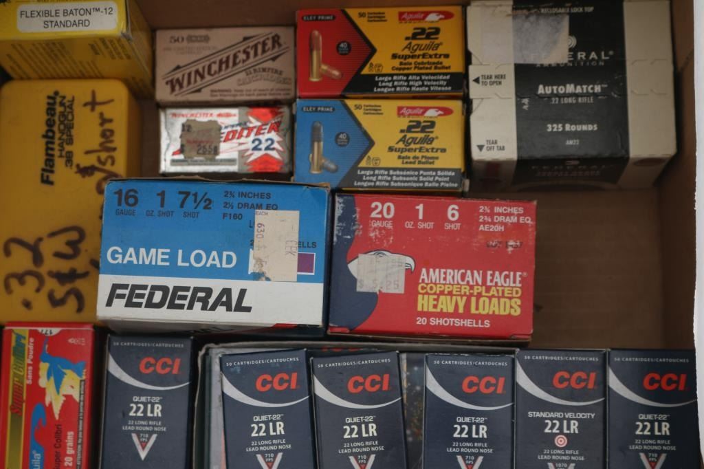 Mixed Lot of 22LR & Misc Other Ammunition. Approx. 1300 rds .22LR, Federal (unopened boxes); approx. 500 rnds .22LR, Aguila (unopened); approx. 800 rnds .22 LR, CCI (unopened); approx. 100 rnds .22 super colibri, Aguila; approx. 50 rnds .22 Mag, CCI; approx. 20 rnds 20 Ga. #6 shot., American Eagle; approx. 25 rnds 16 Ga., #7 1/2 shot, Federal; approx. 25 rnds of .32 S& W; approx. 25 rnds .32 short and a few others.