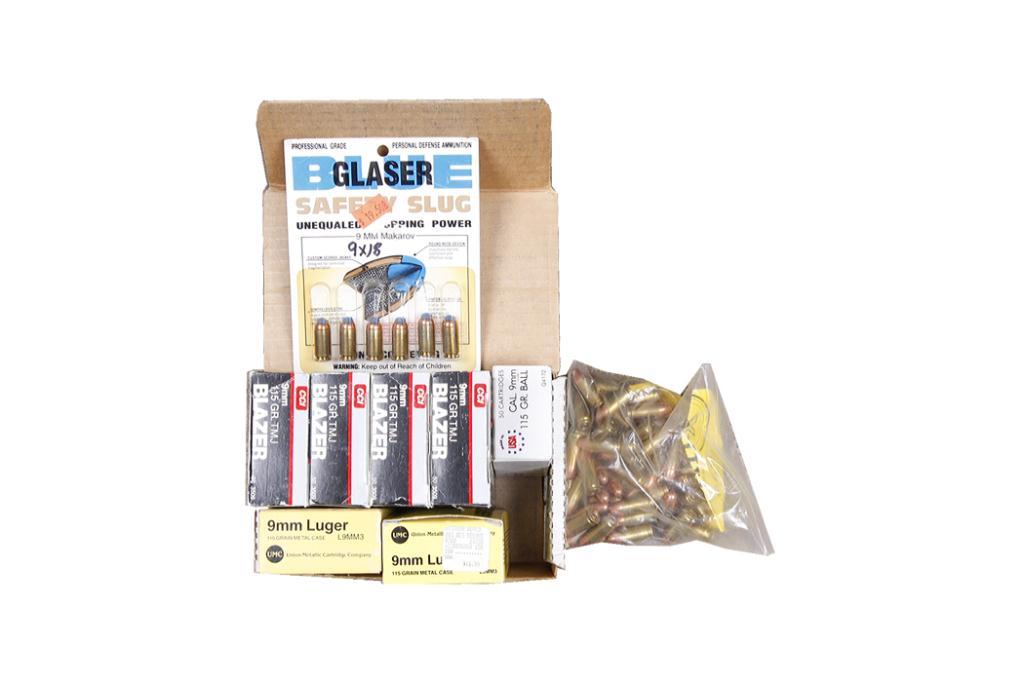 1 bag, 50 rds, Load-X 115 gr TMJConsists of : 4 boxes, 50 rds ea, CCI Blazer 115 gr TMJ 1 box, 50 rds ea, Olin 115 gr Ball 1+ boxes, 75 rds, UMC 115 gr Ball 1 bag, 50 rds, Load-X 115 gr TMJ